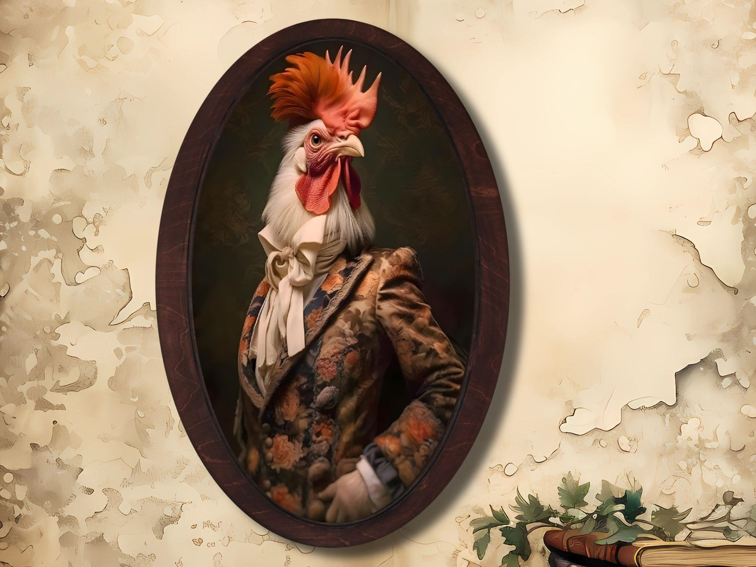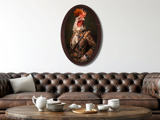 Rustik Viktoryen Horoz Portresi – Oval Ahşap Tablo - Vintage Hayvan Duvar Dekoru
