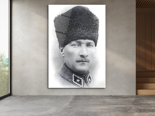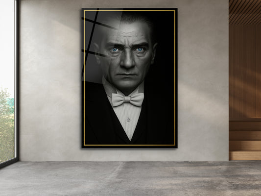 Mavi Gözlü Atatürk Portresi Siyah Beyaz Cam Tablo – Atatürk Tablosu - Modern Ev ve Ofis Dekoru