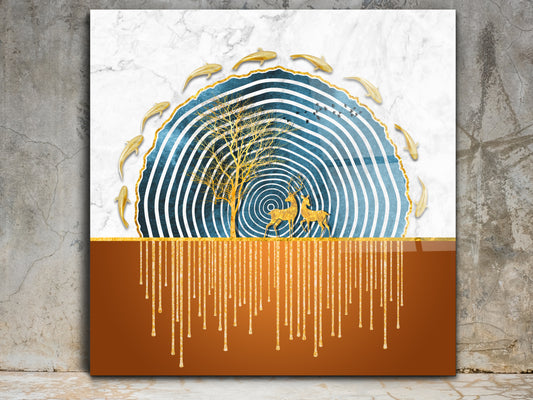 Gold Geyik ve Balık Desenli Soyut Cam Tablo – Modern Doğa Temalı Duvar Dekoru