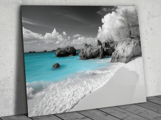 Siyah Beyaz Sahil ve Turkuaz Deniz Cam Tablo – Modern Dekoratif Ev ve Ofis Tablosu
