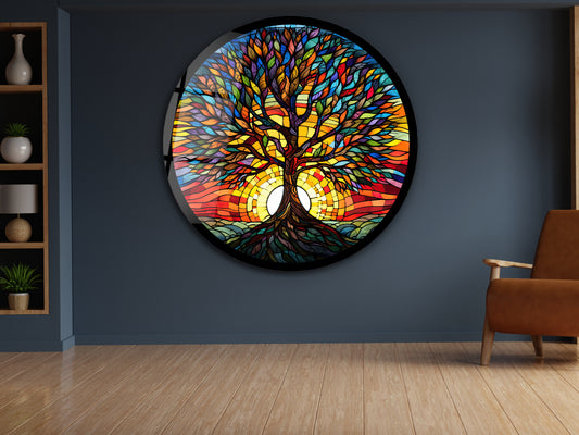 Yuvarlak Hayat Ağacı Cam Tablo – Vitray Tarzı Desenli Renkli Duvar Tablosu