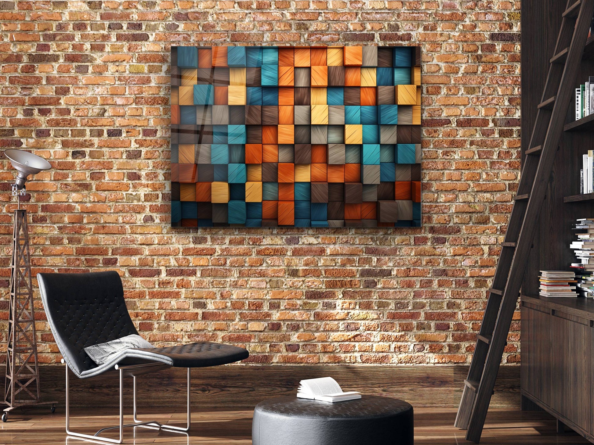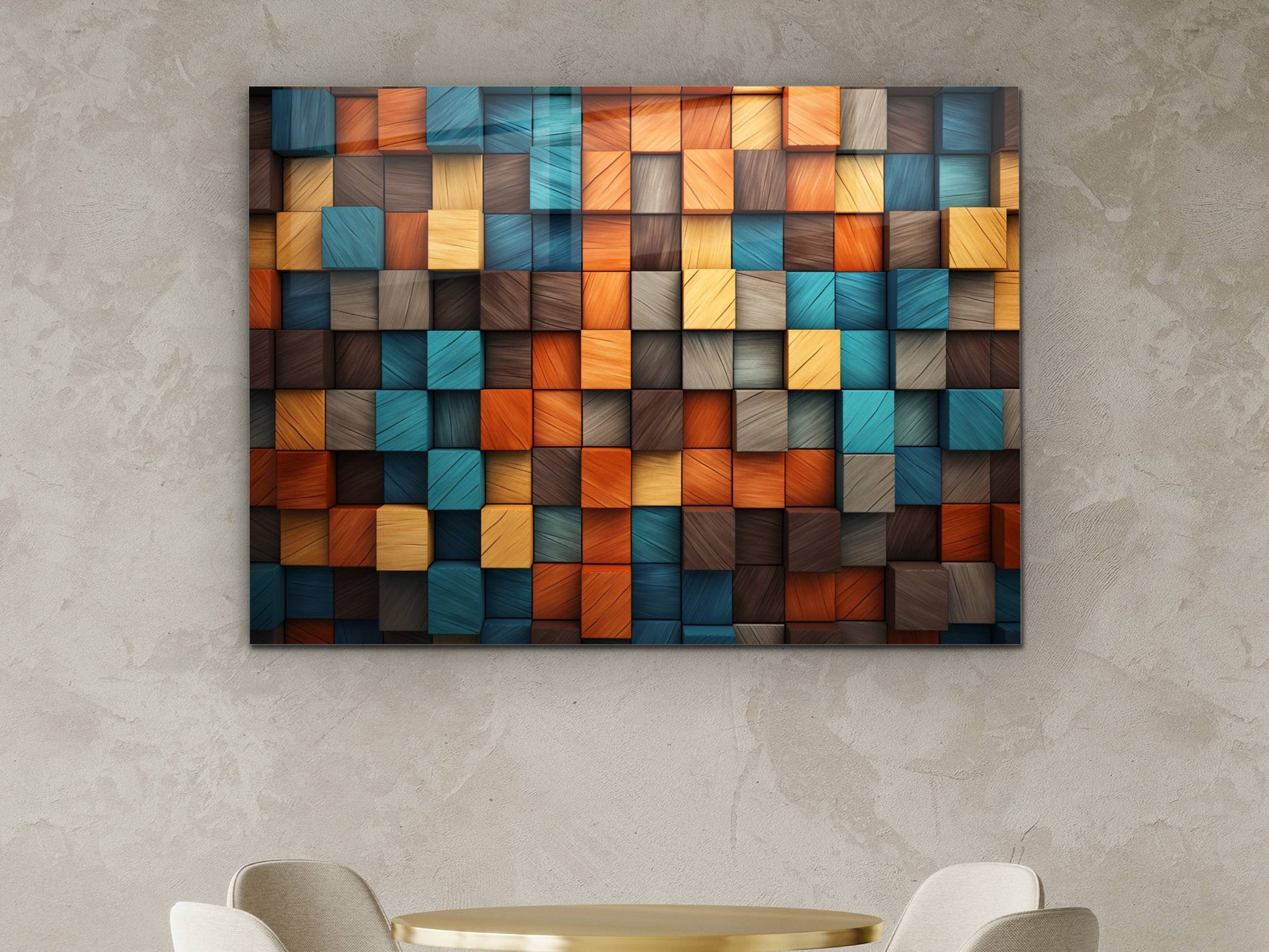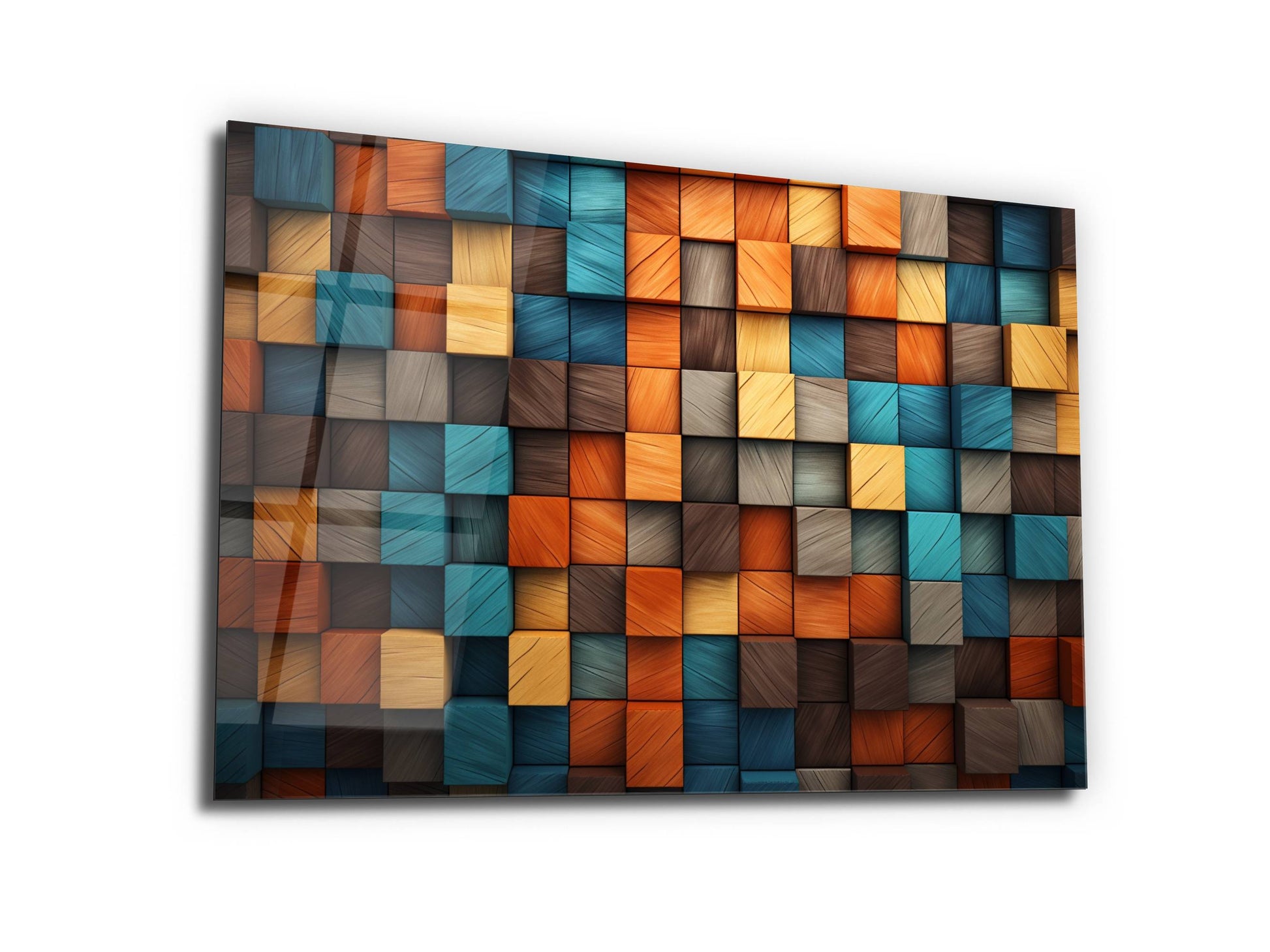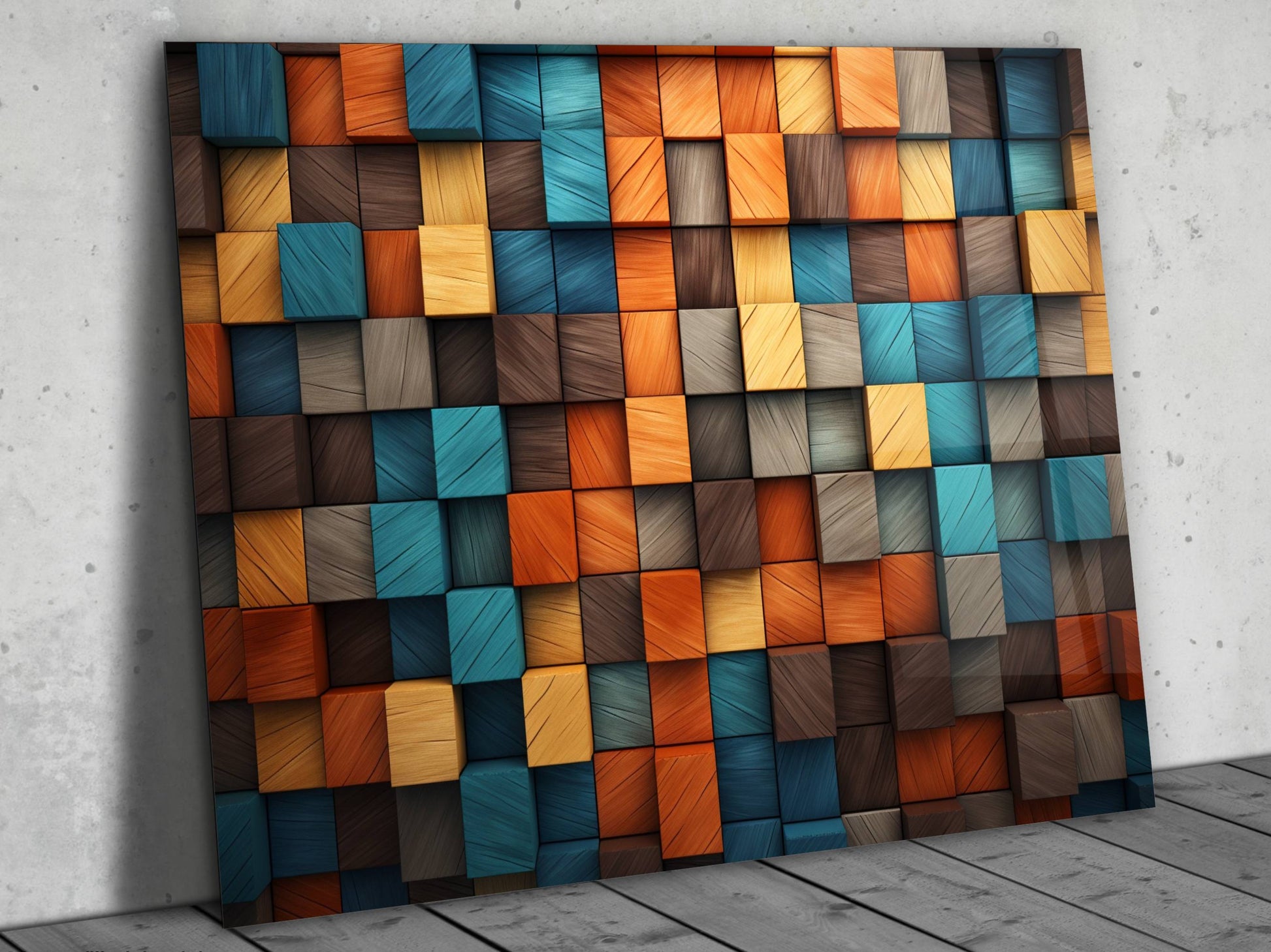 3D Efektli Renkli Ahşap Desenli Cam Tablo - Modern Geometrik Duvar Dekoru
