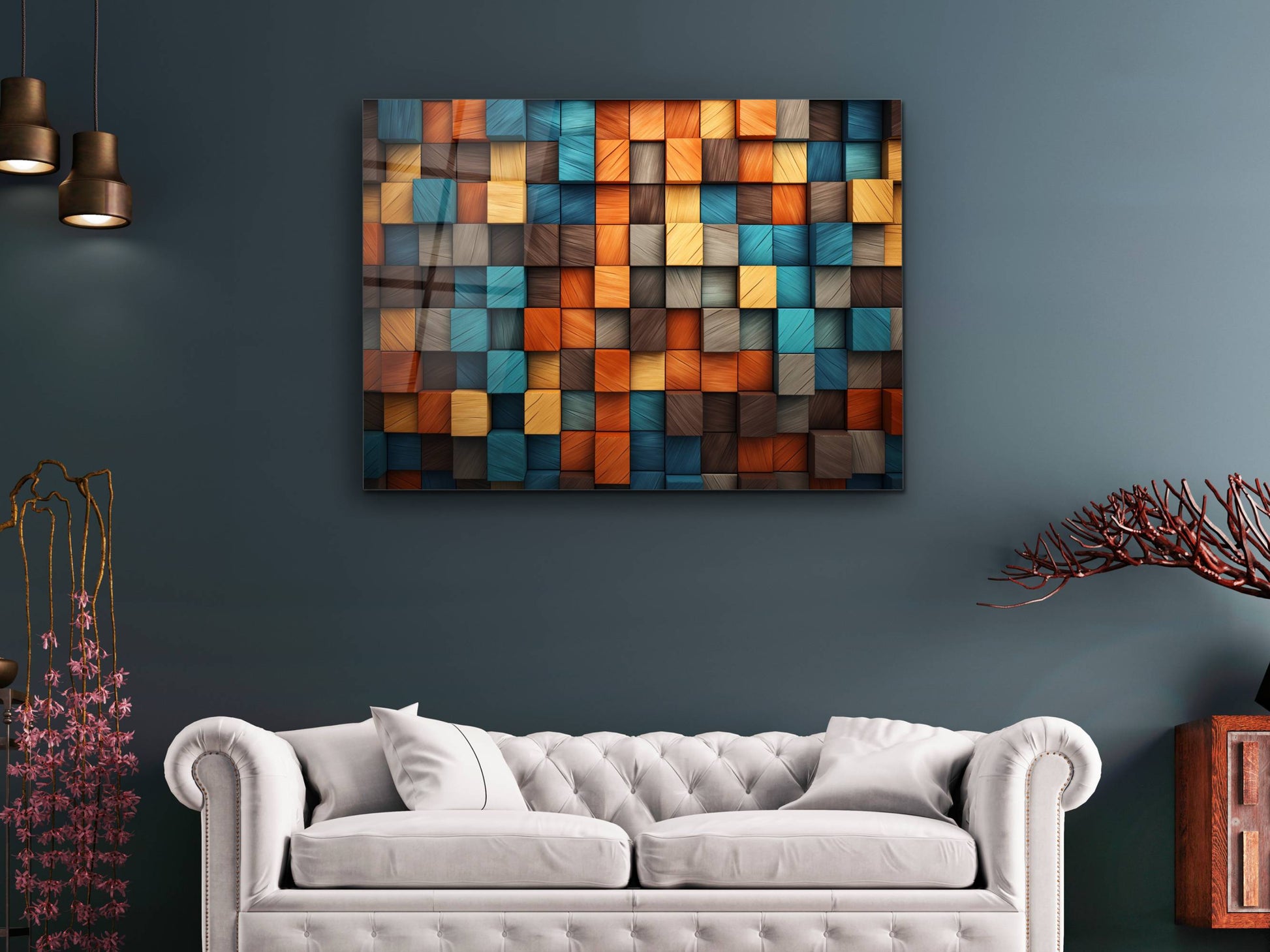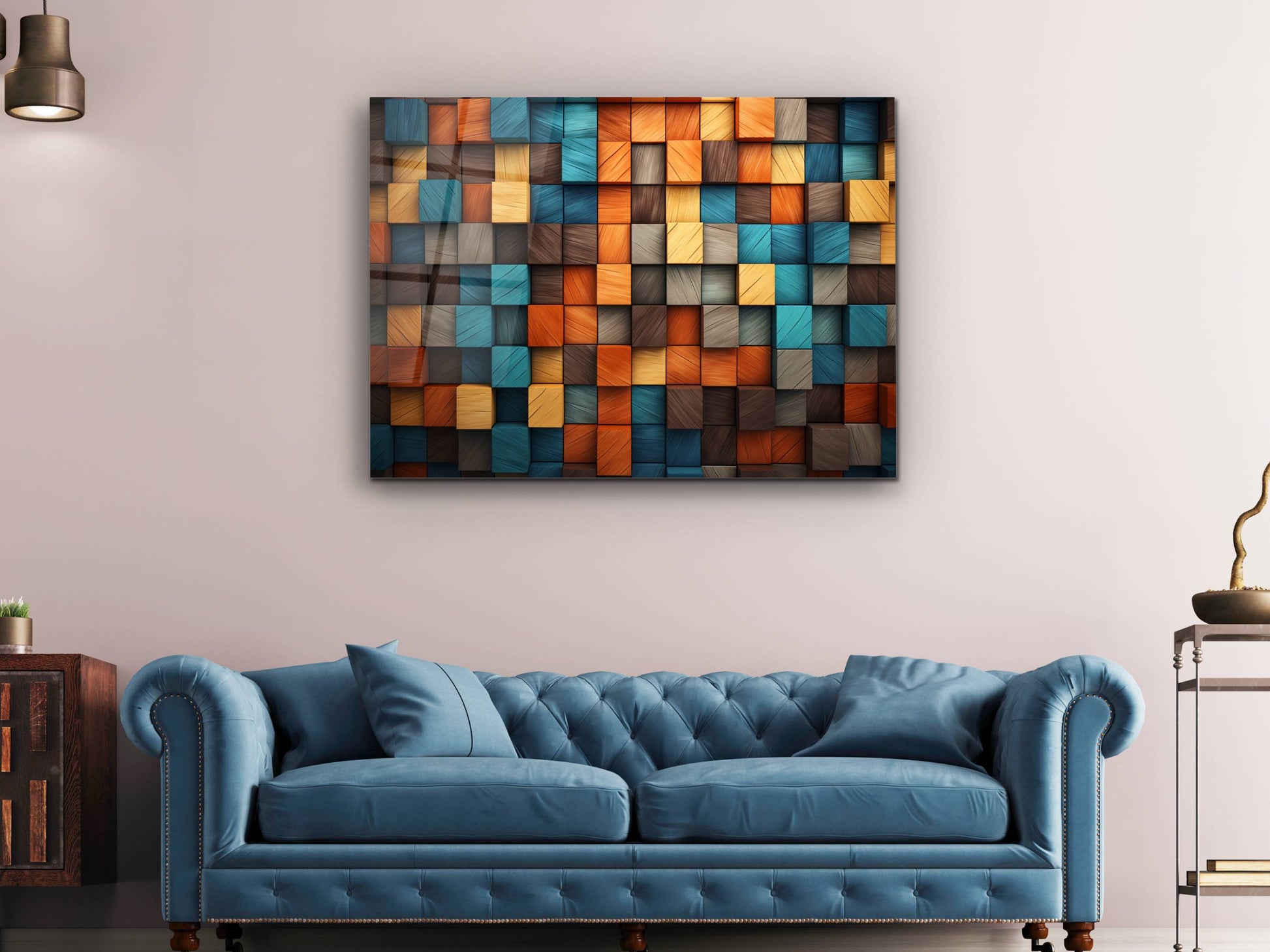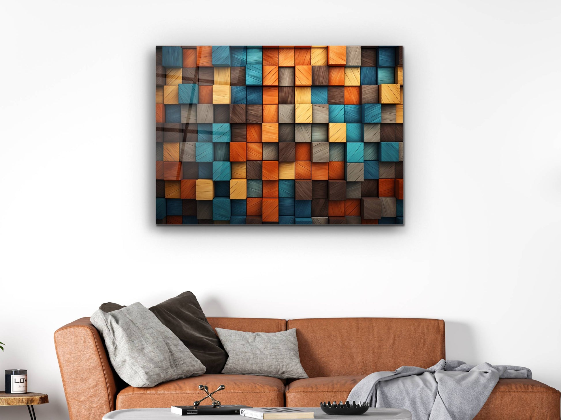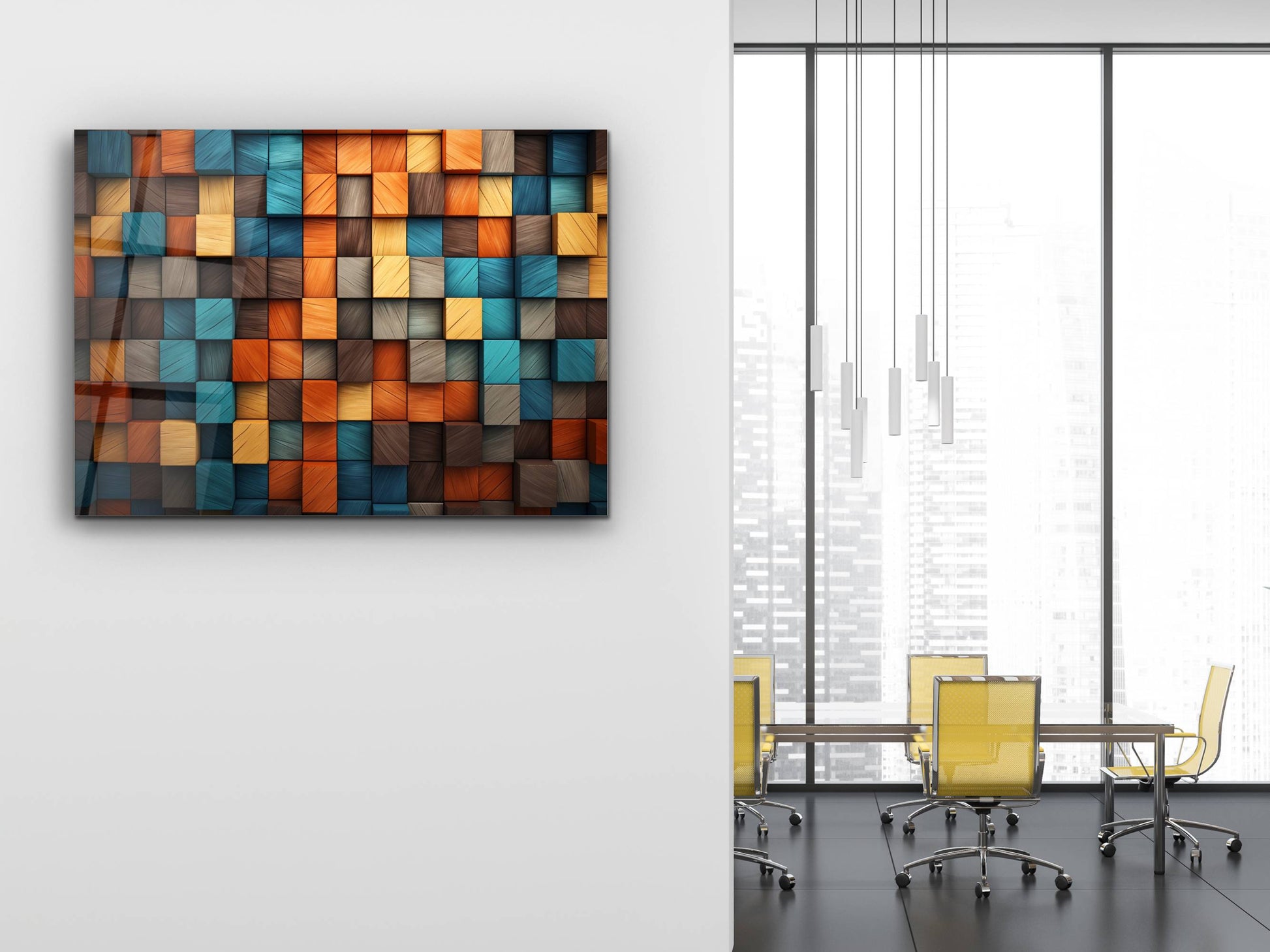 3D Efektli Renkli Ahşap Desenli Cam Tablo - Modern Geometrik Duvar Dekoru