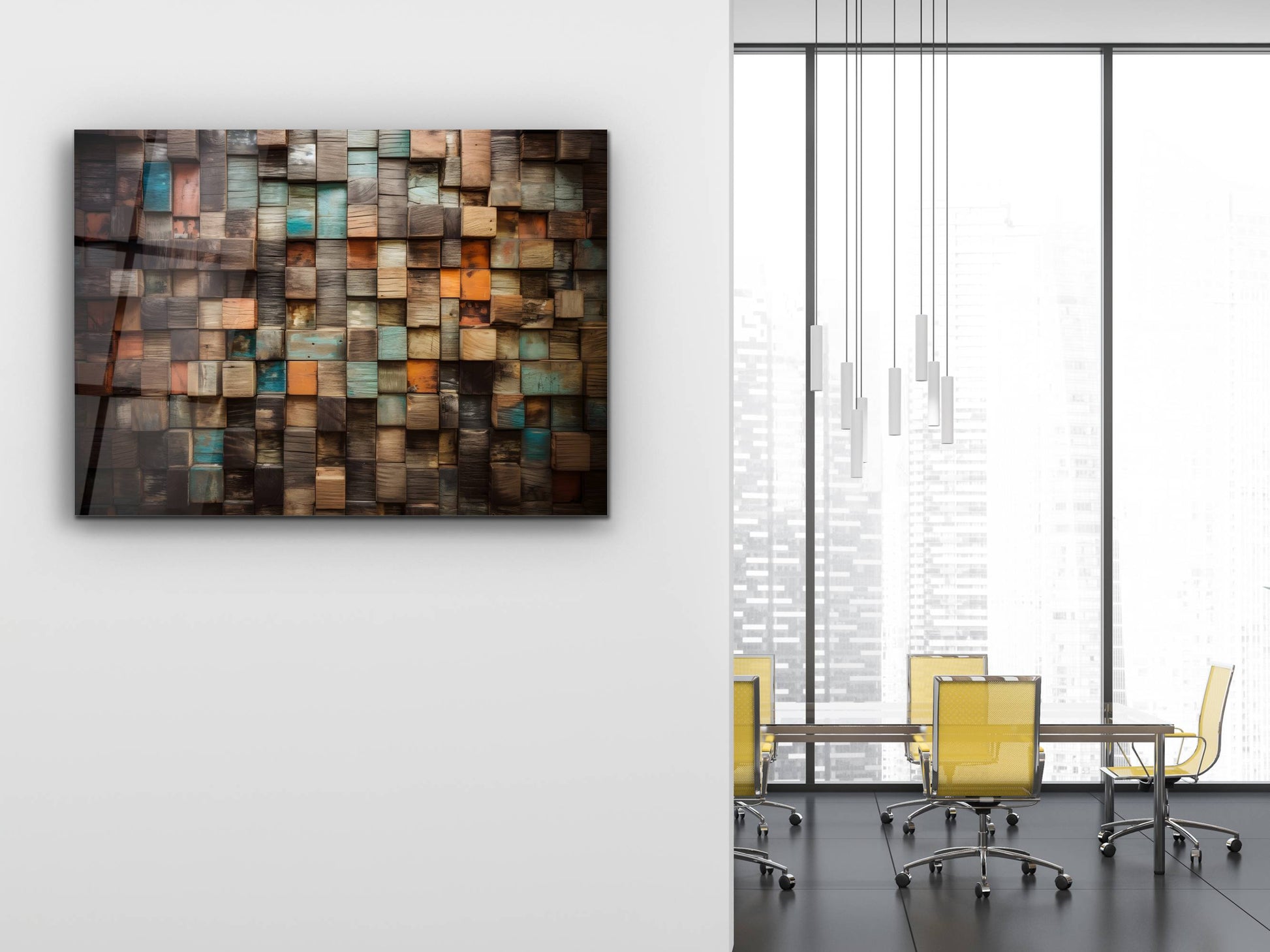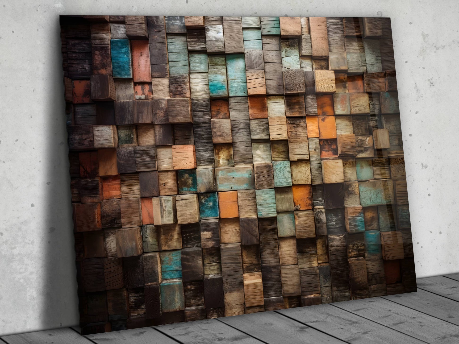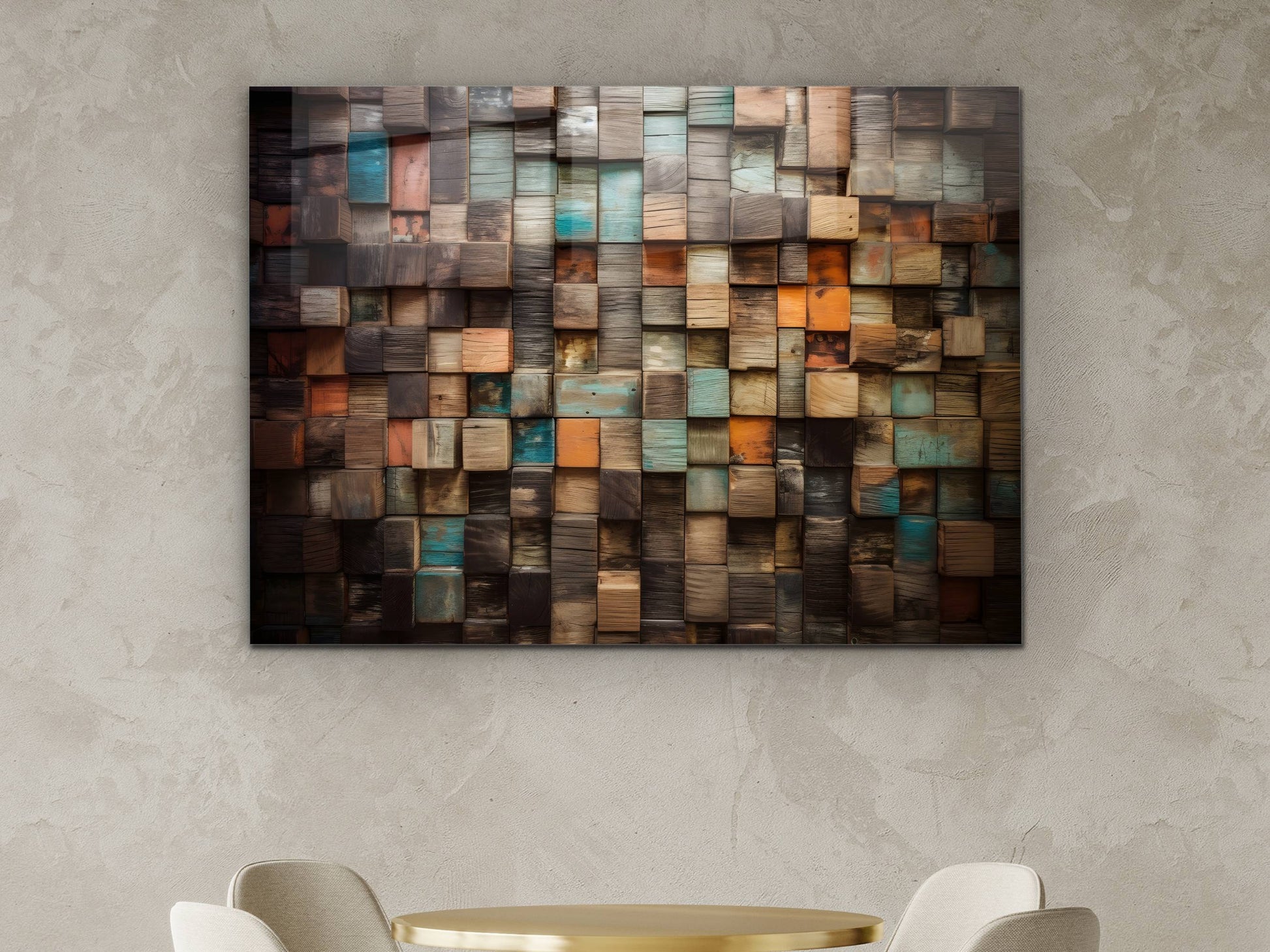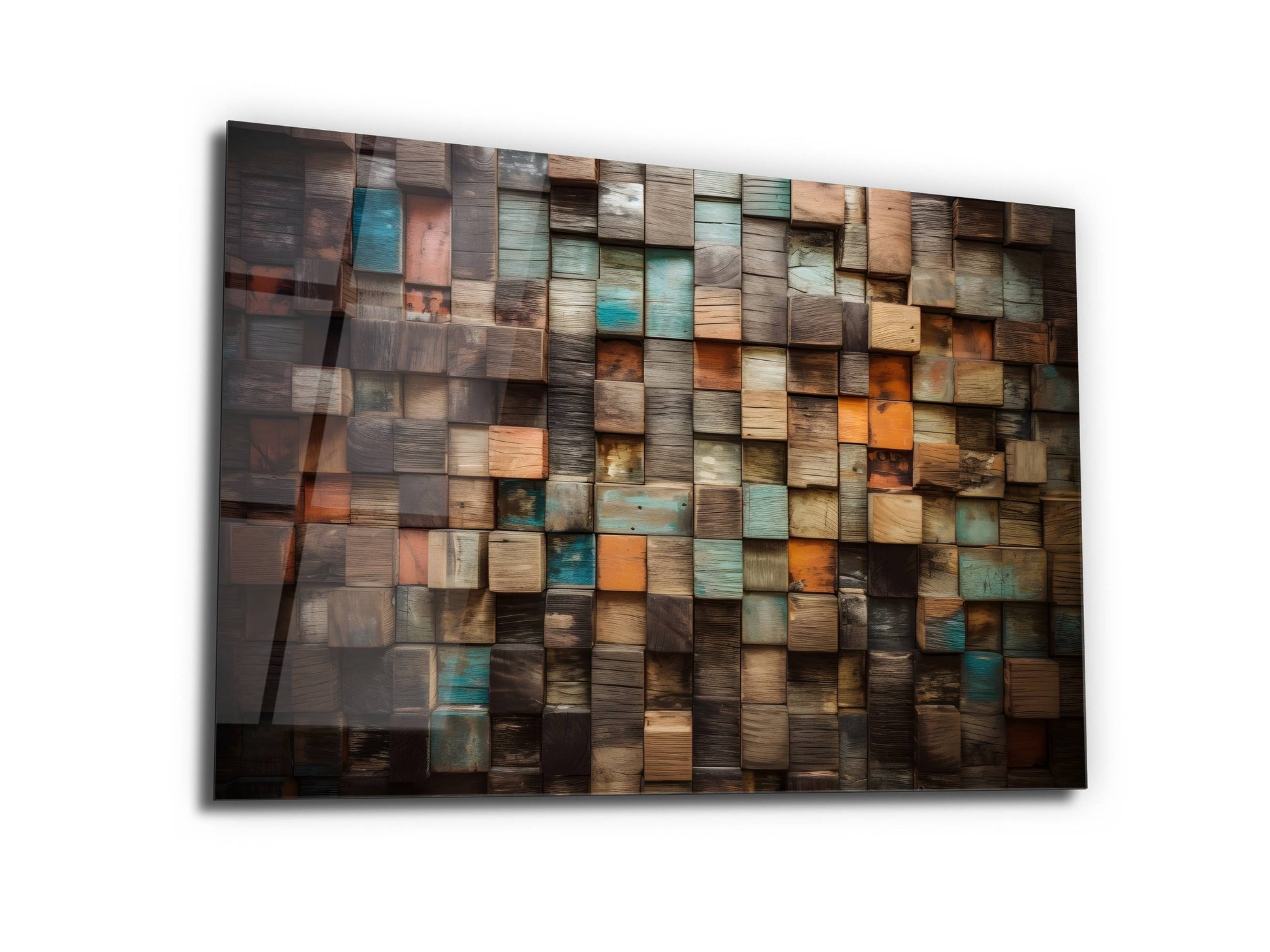 3D Efektli Renkli Ahşap Desenli Cam Tablo - Modern Geometrik Duvar Dekoru
