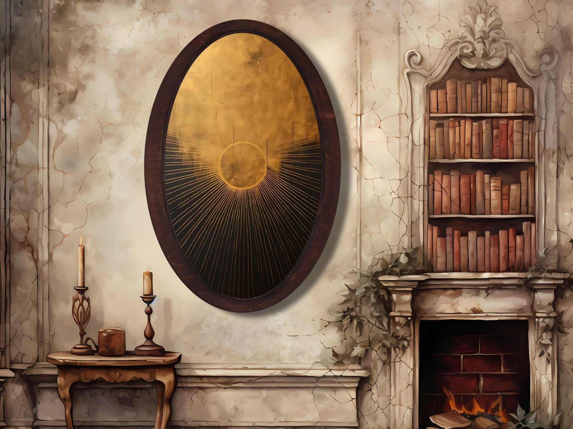 Altın Güneş Soyut Tasarım Oval Ahşap Tablo - Modern Spiritüel Duvar Dekoru