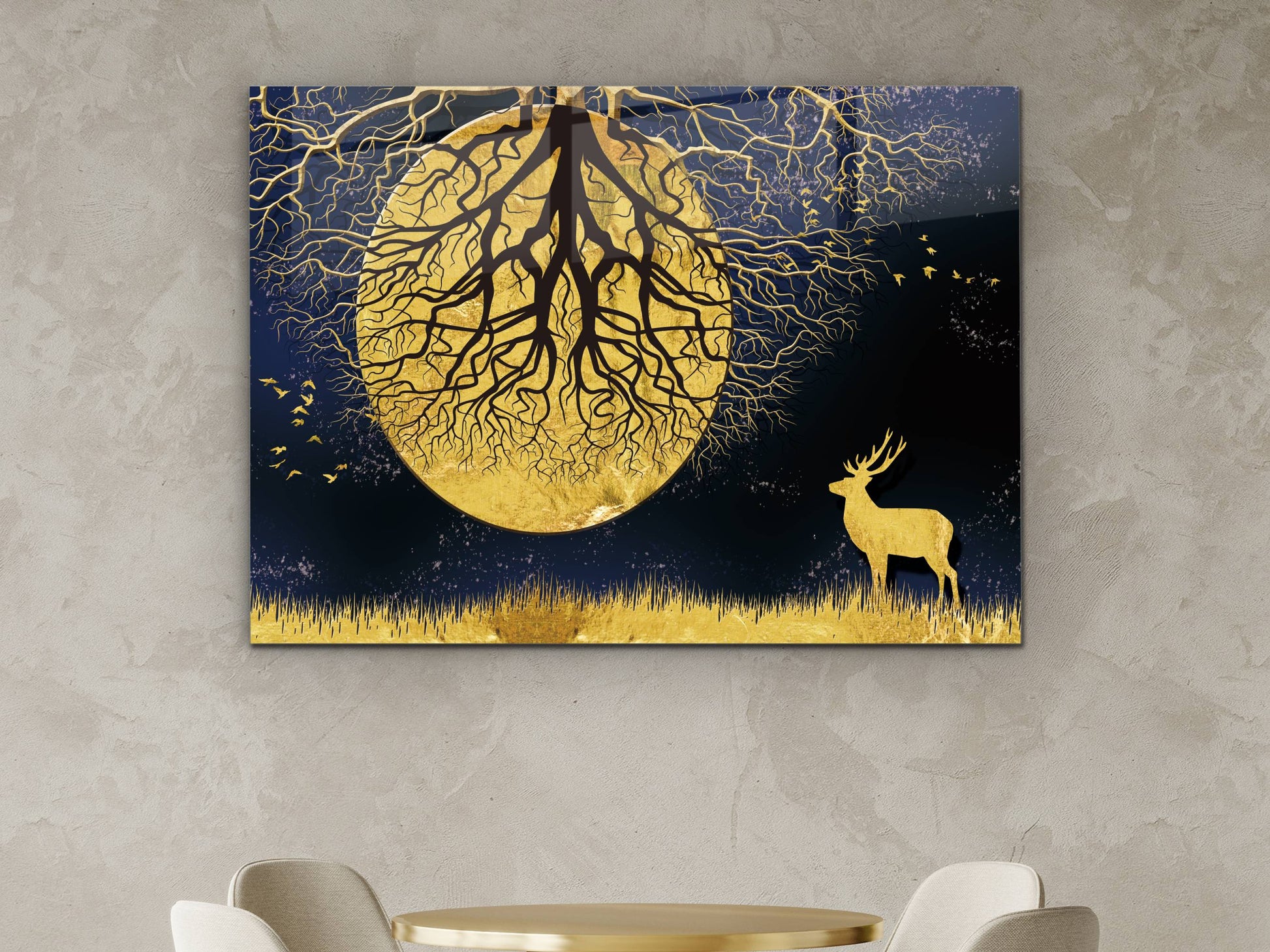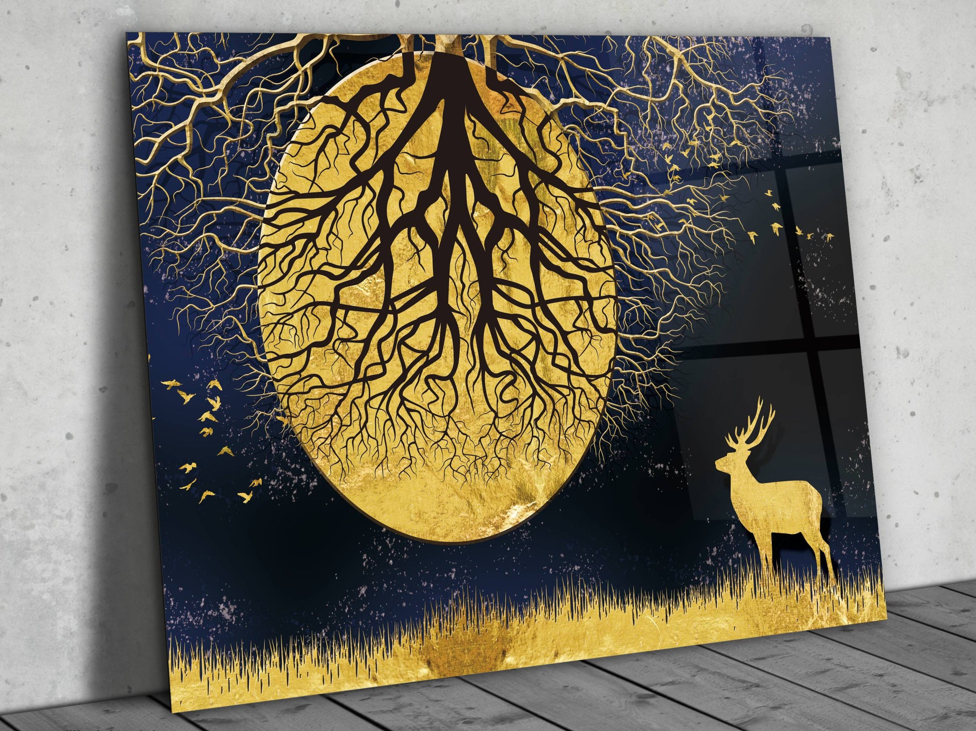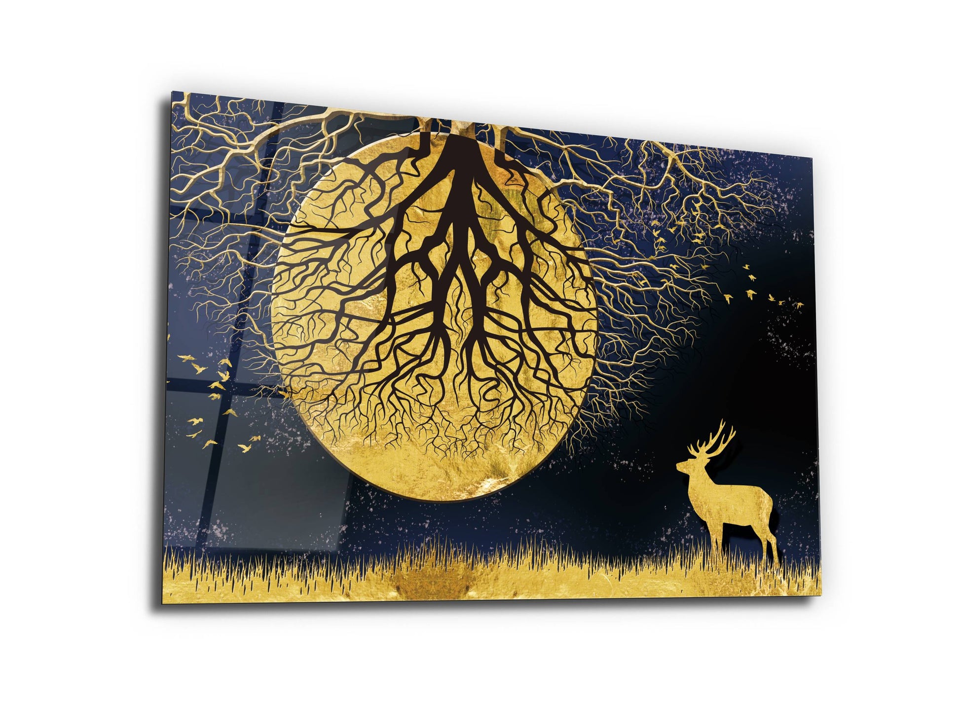 Ay ve Gece Manzaralı Gold Ağaç Tablosu – Modern Ev Dekorasyonu Cam Tablo