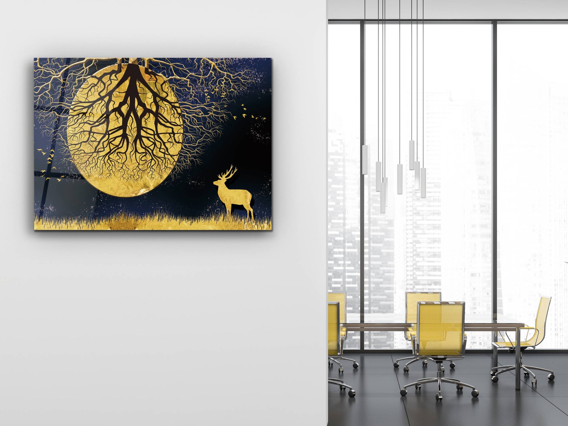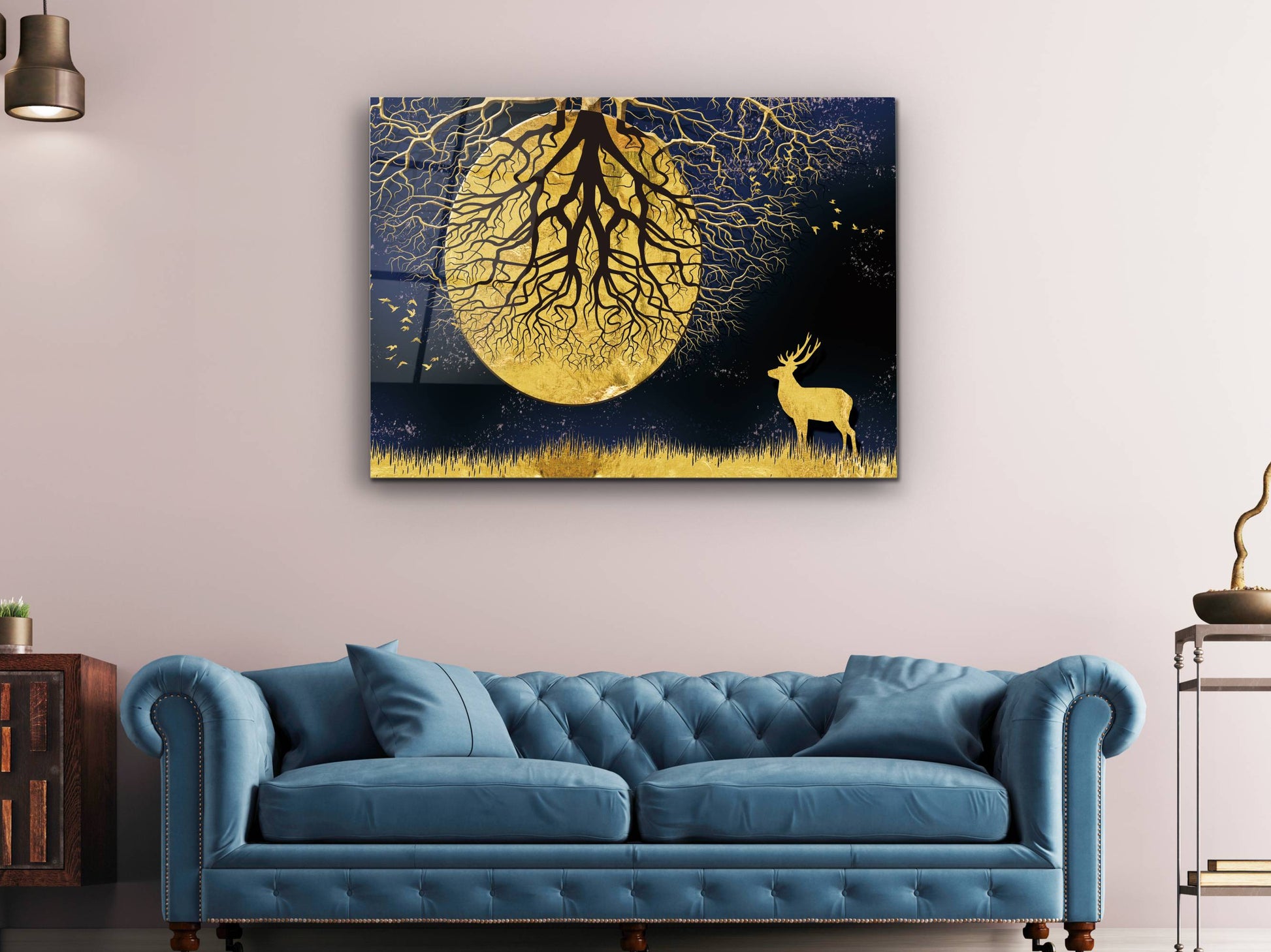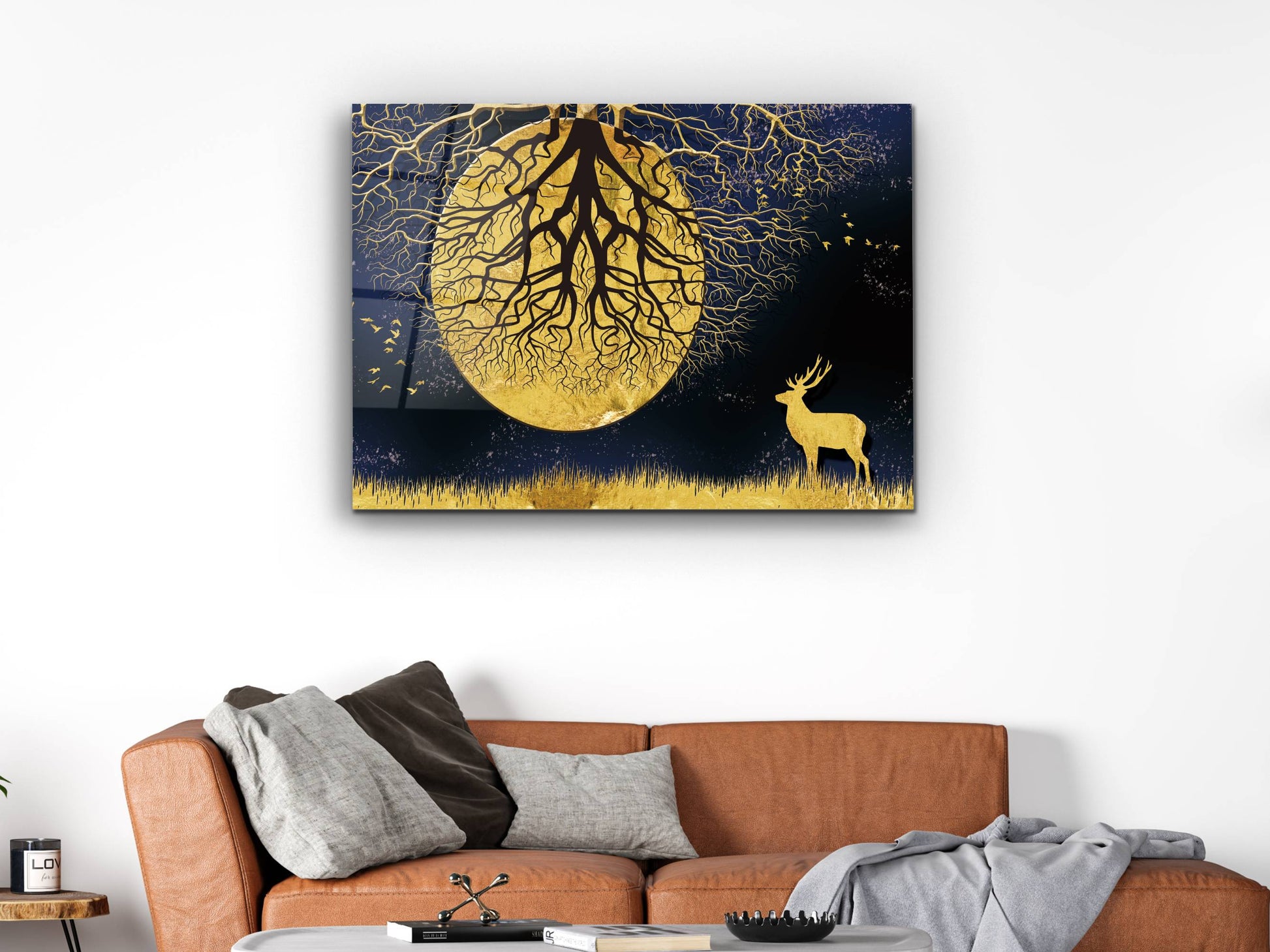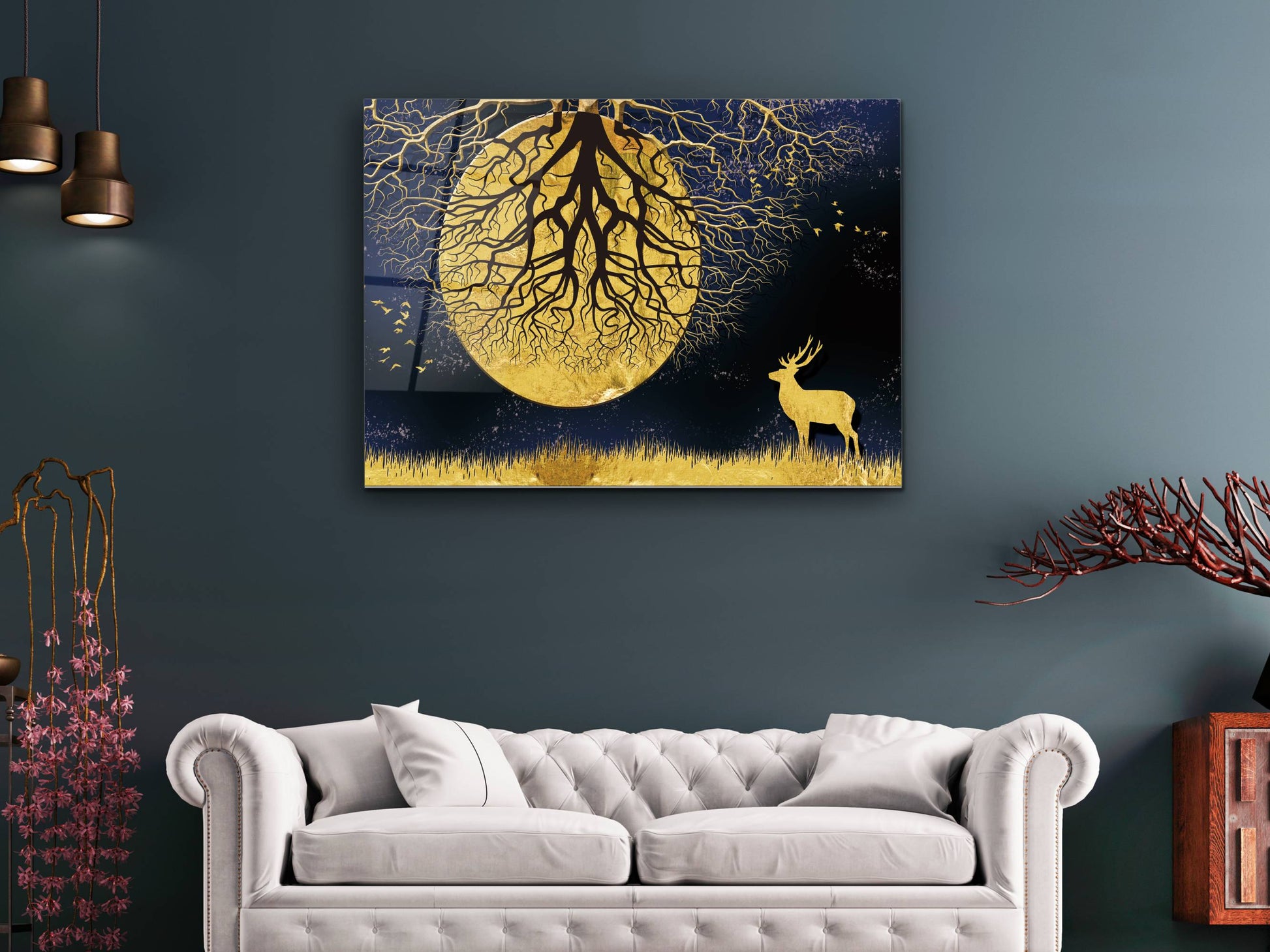 Ay ve Gece Manzaralı Gold Ağaç Tablosu – Modern Ev Dekorasyonu Cam Tablo