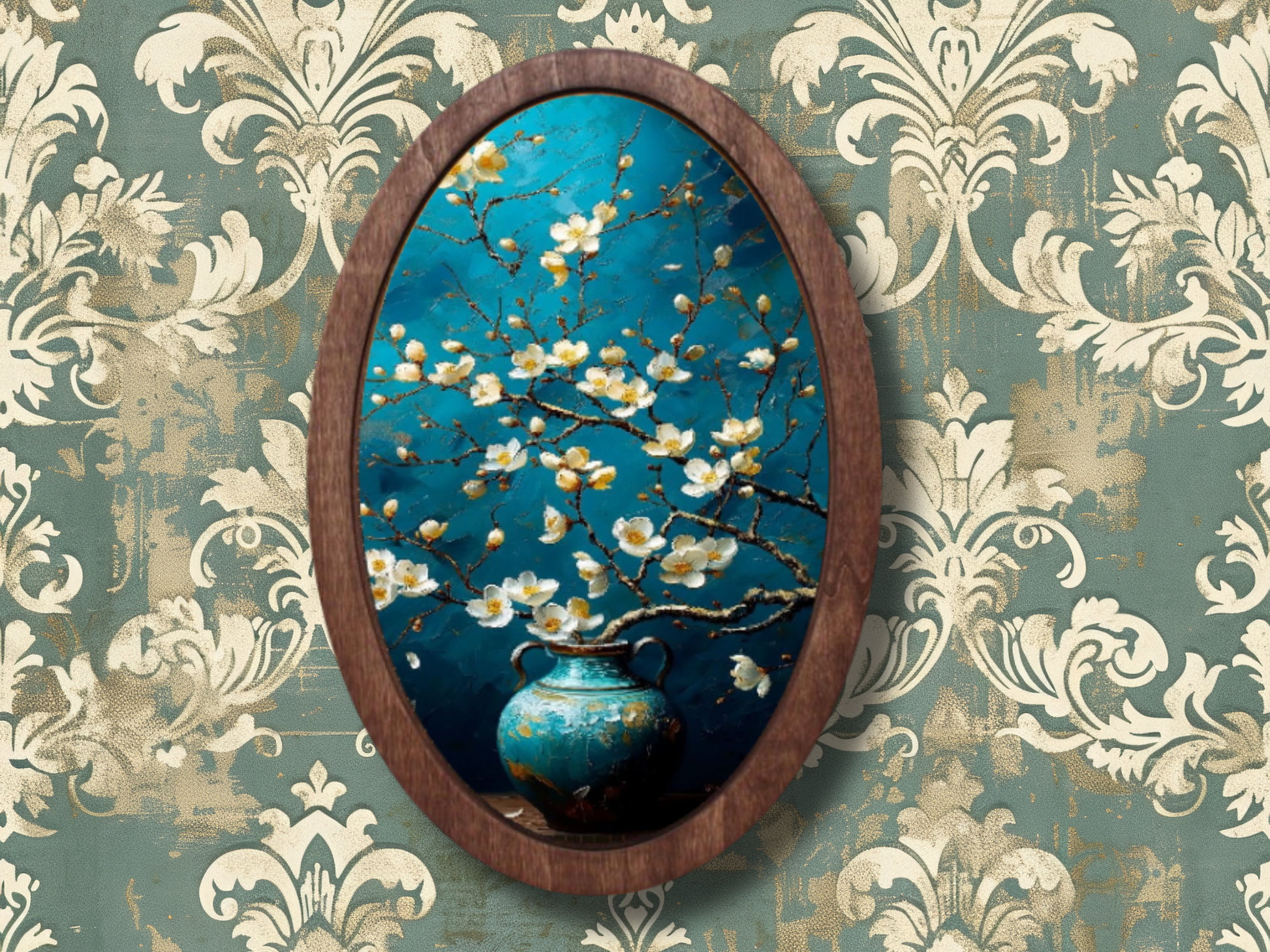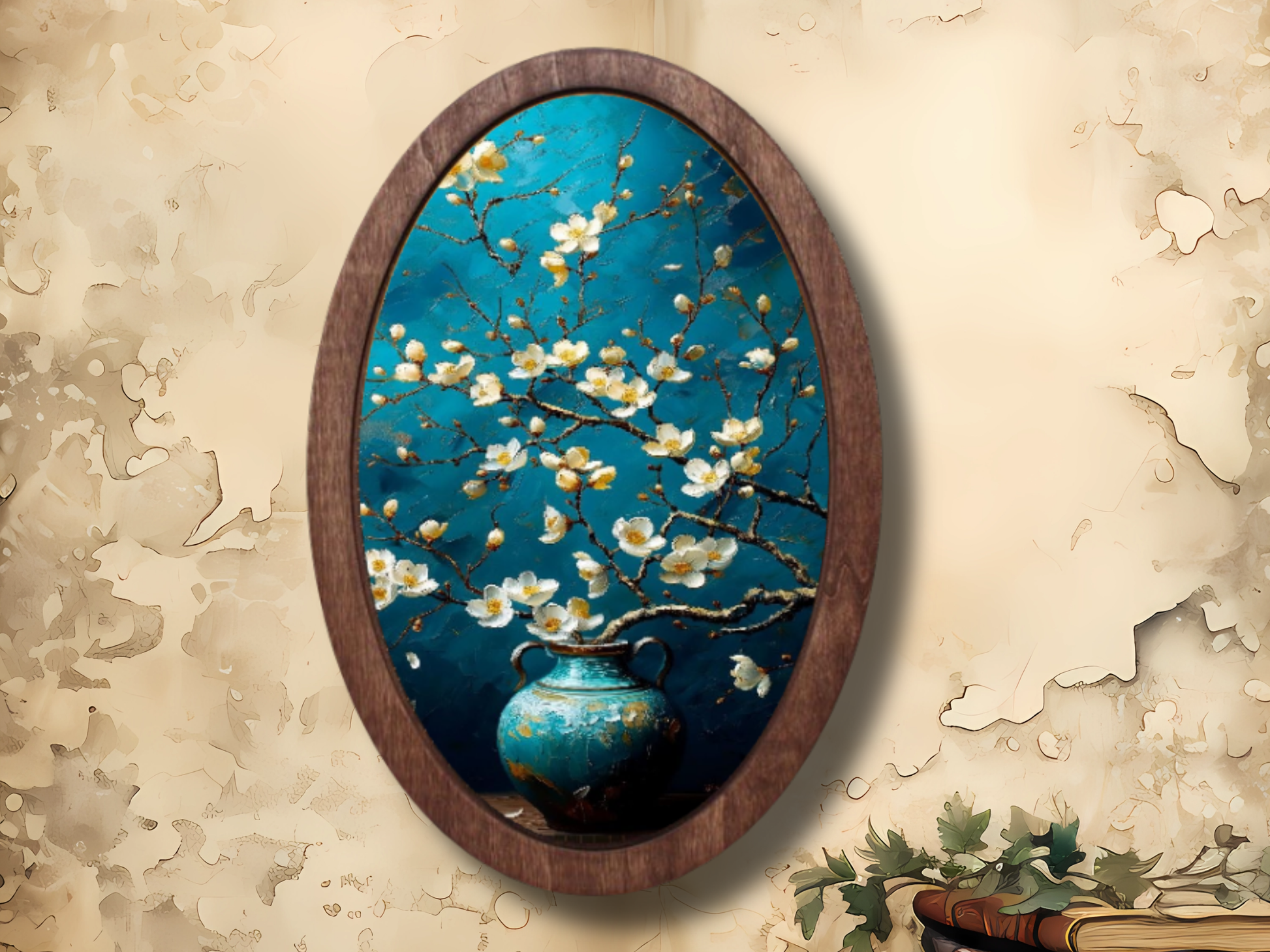 Beyaz Çiçekli Ahşap Tablo – Klasik Stil Oval Duvar Dekoru - Dekoratif Duvar Tablosu