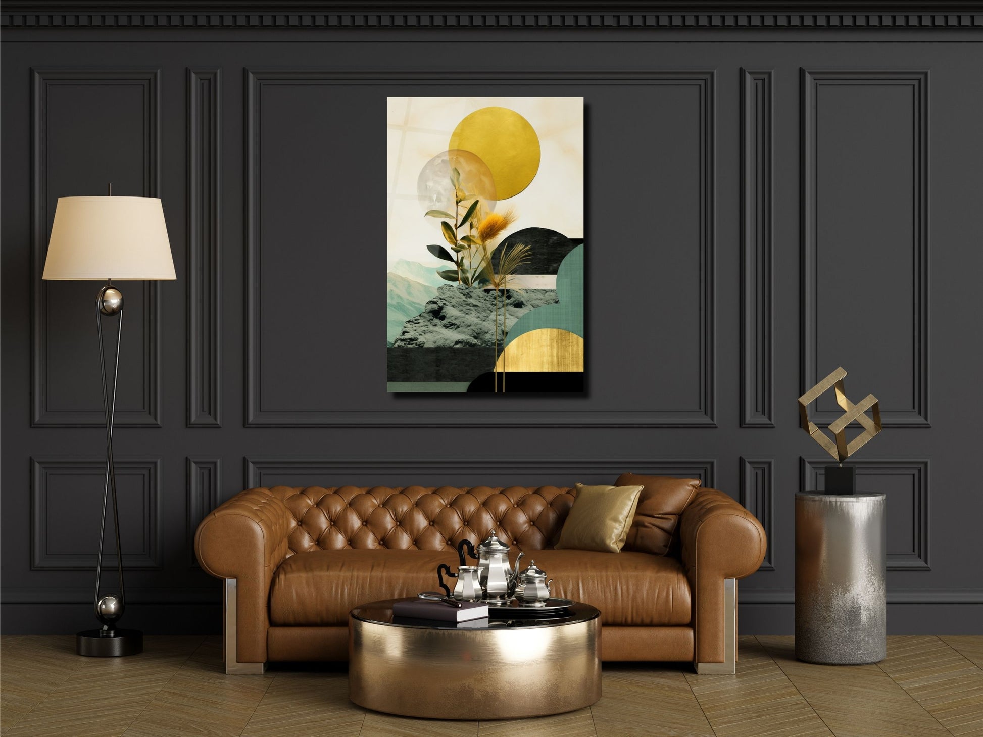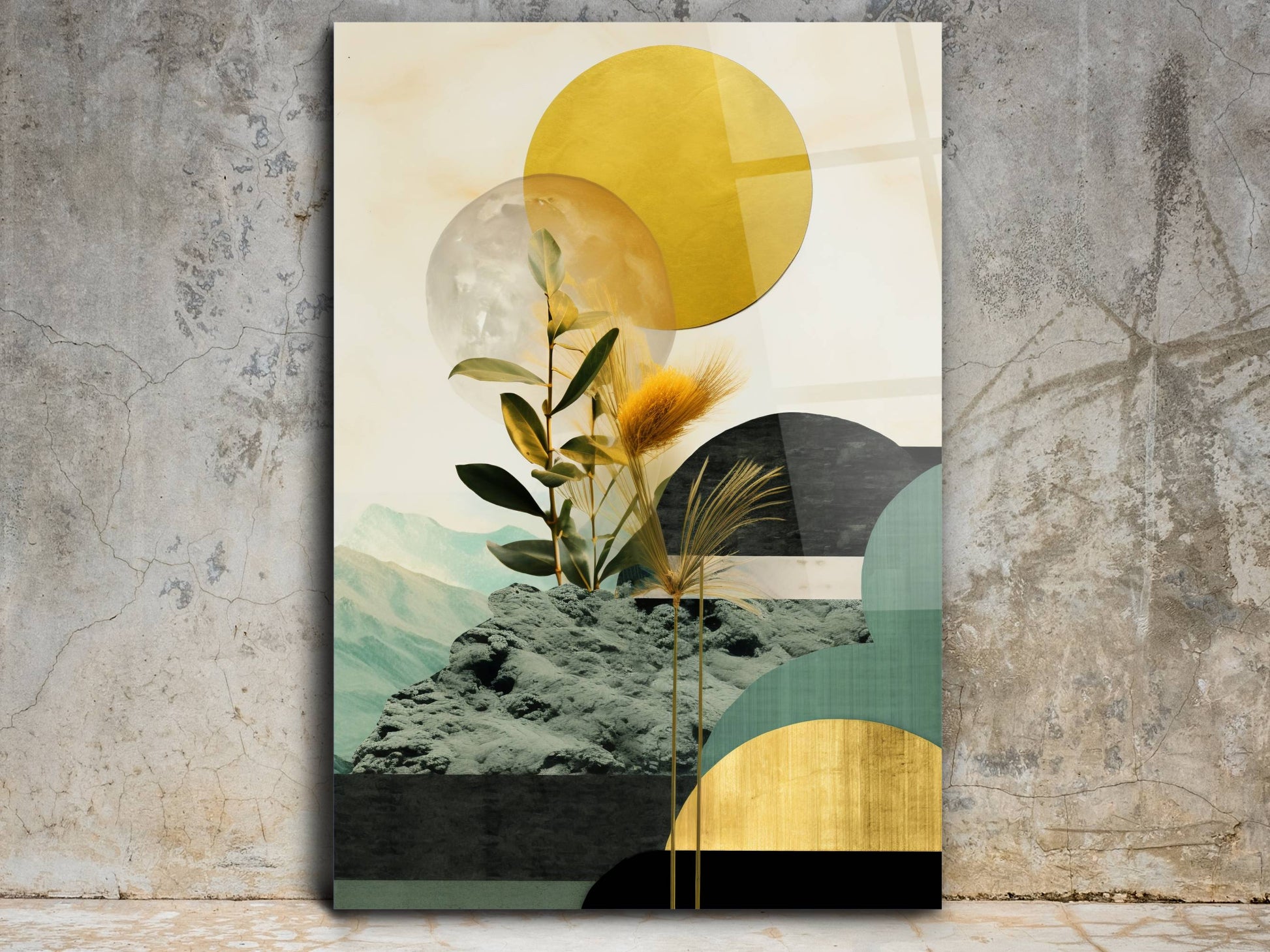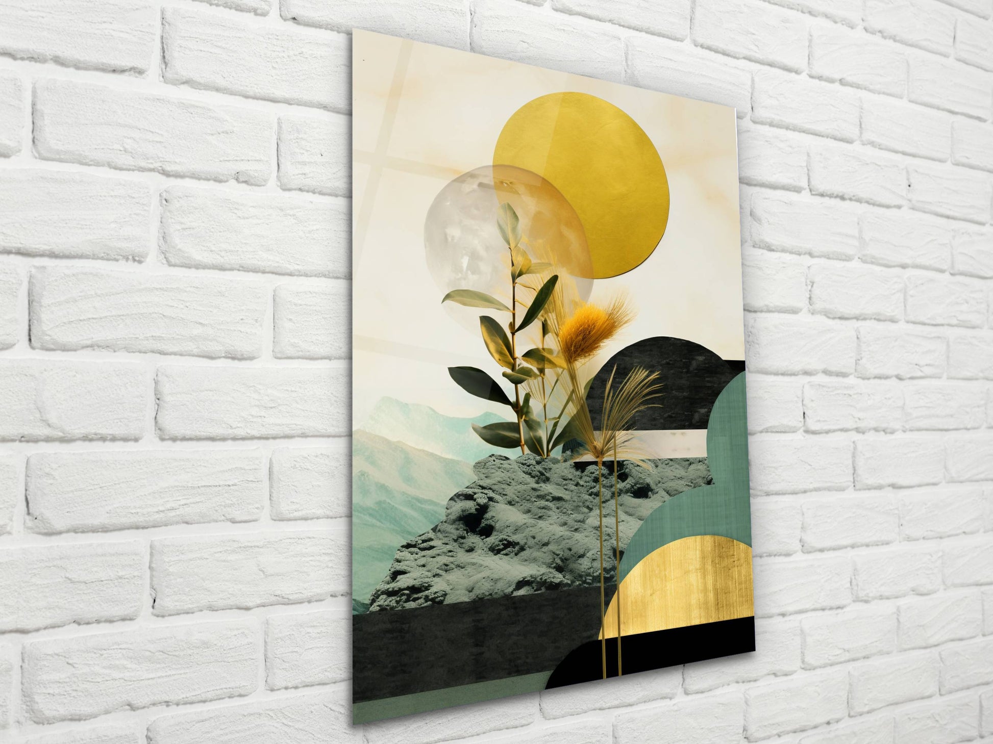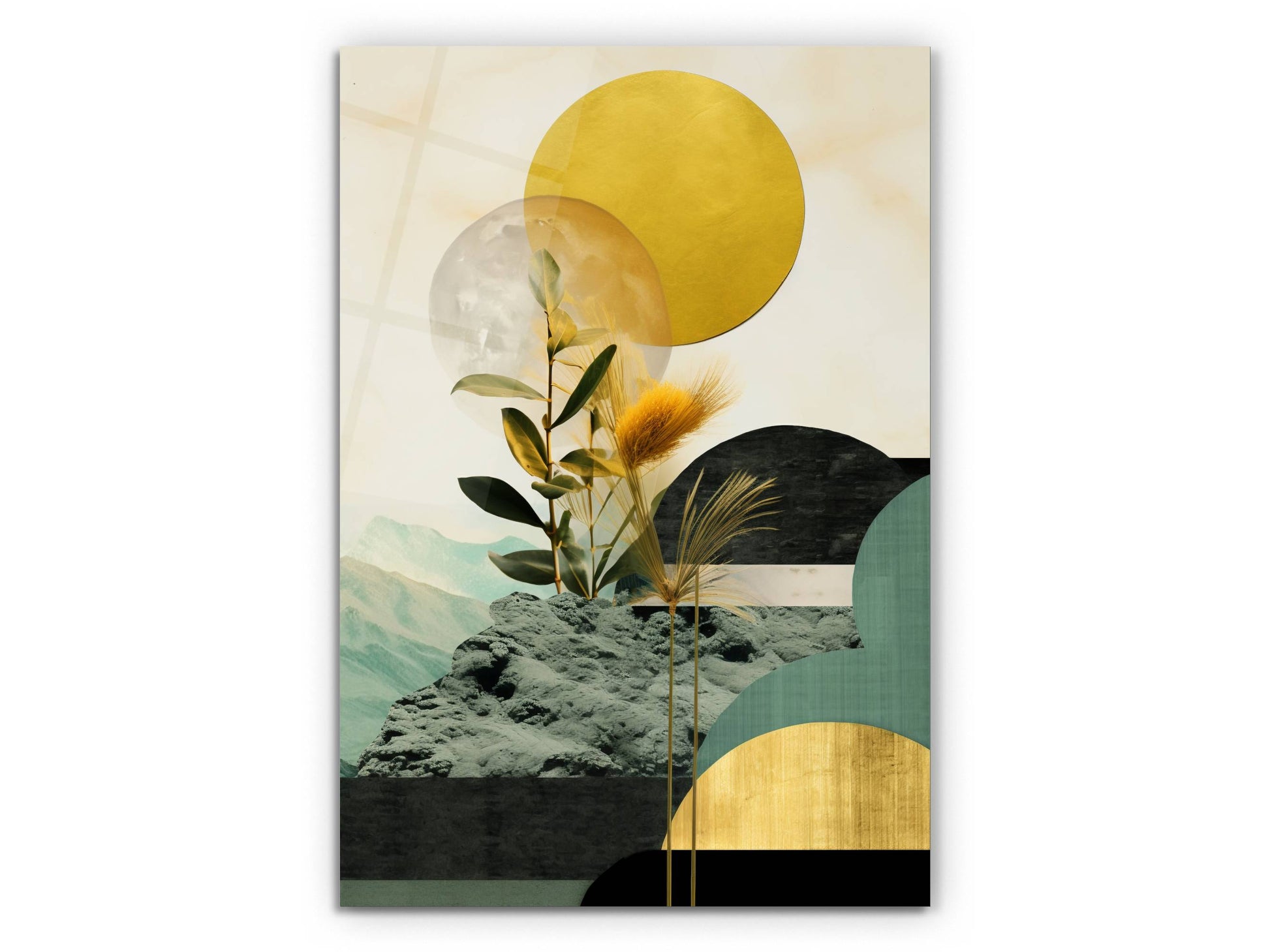Bitki Detaylı Geometrik Cam Tablo - Soyut Manzara Temalı Ev Dekoru