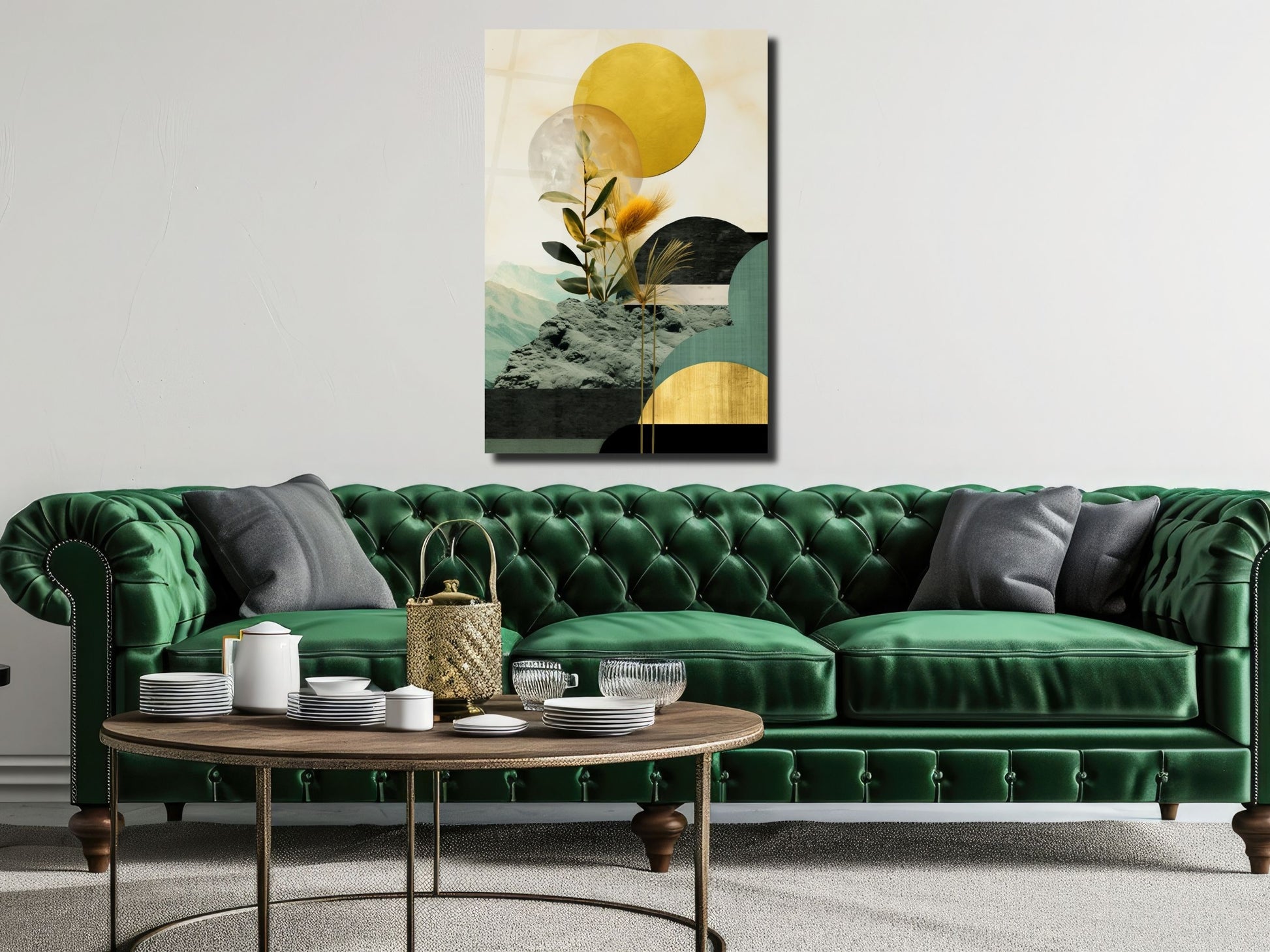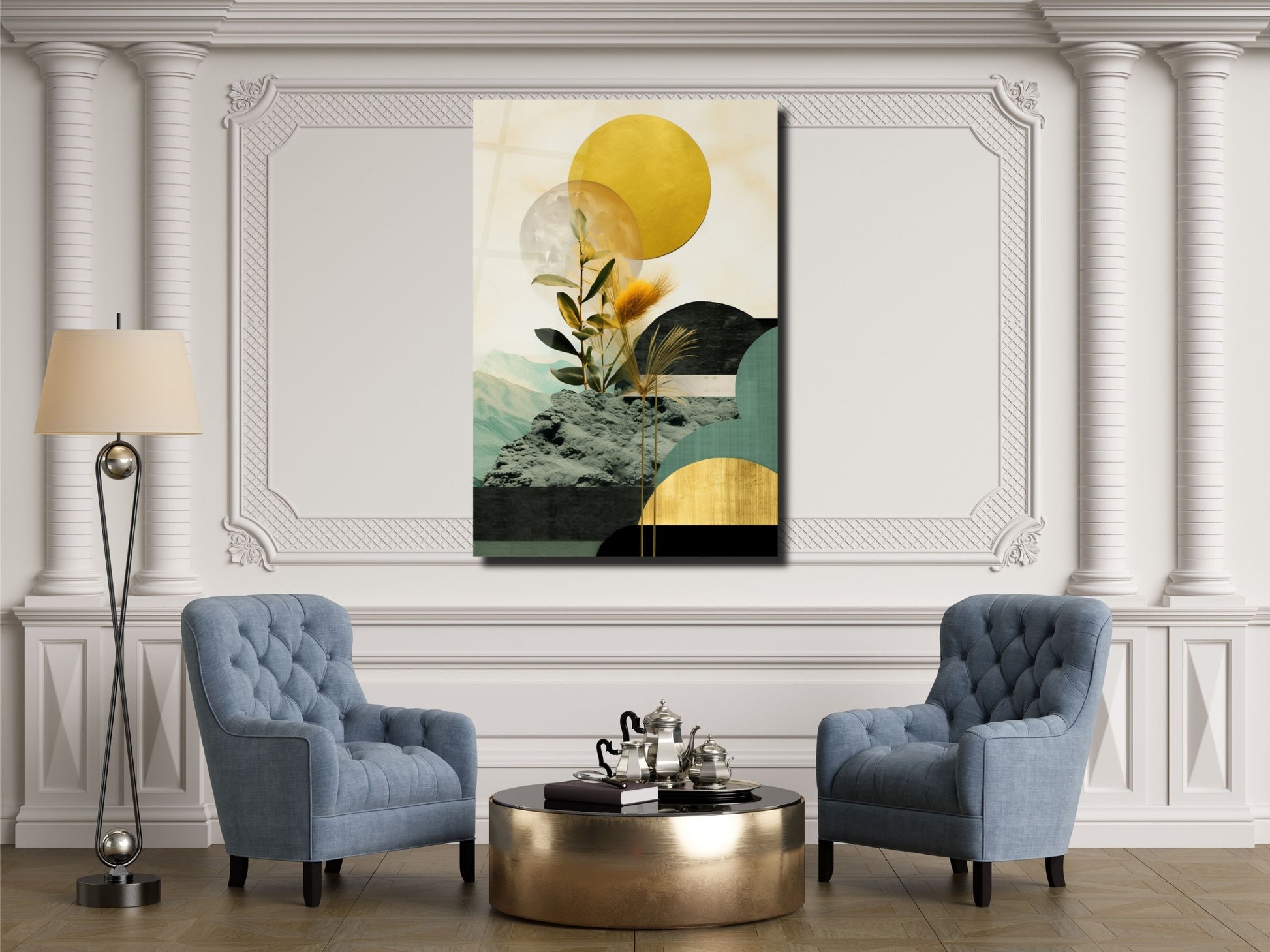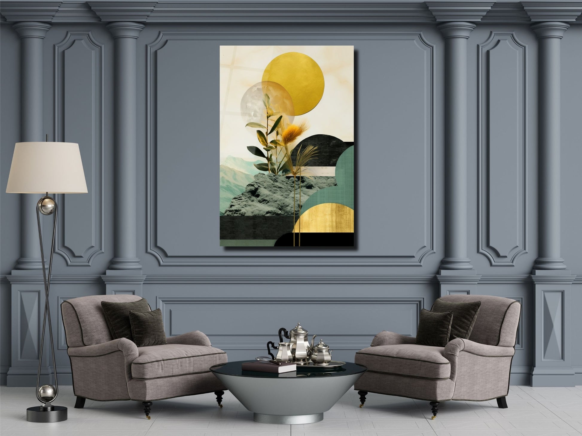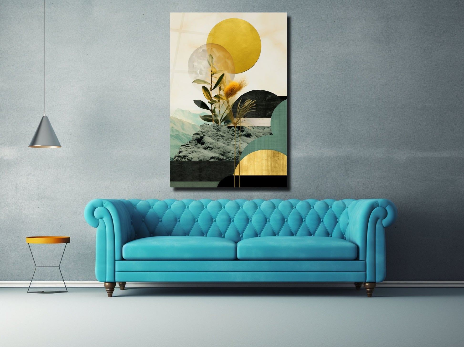 Bitki Detaylı Geometrik Cam Tablo - Soyut Manzara Temalı Ev Dekoru