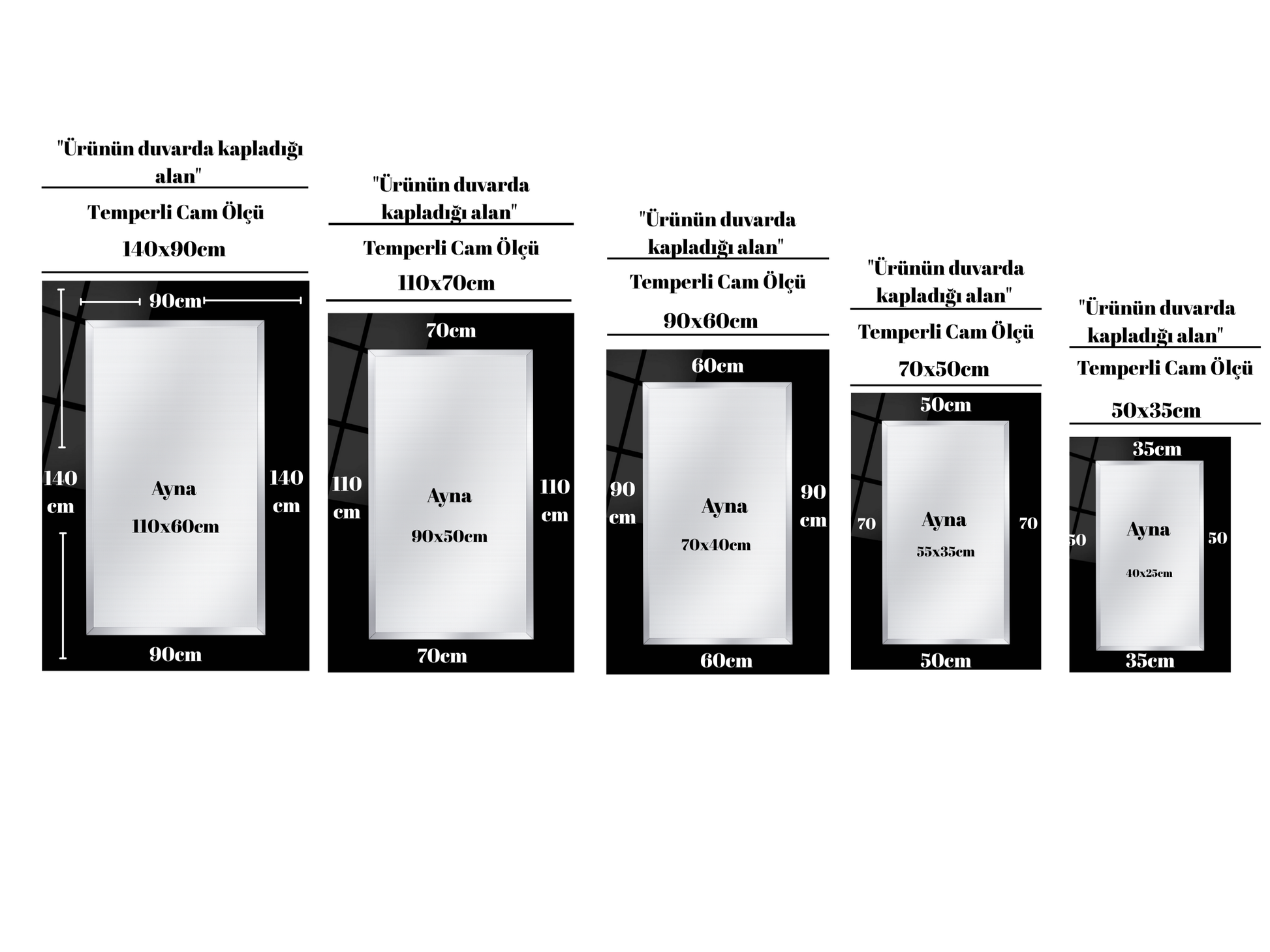 Ürünlerimiz, standart cama göre 10 kata kadar dayanıklı olan 4 mm kalınlığında temperli cam üzerine üretilir. Ortasında yer alan yüksek kaliteli bizoteli ayna(Eğimli kenarlı), net ve şık bir yansıma sağlar.