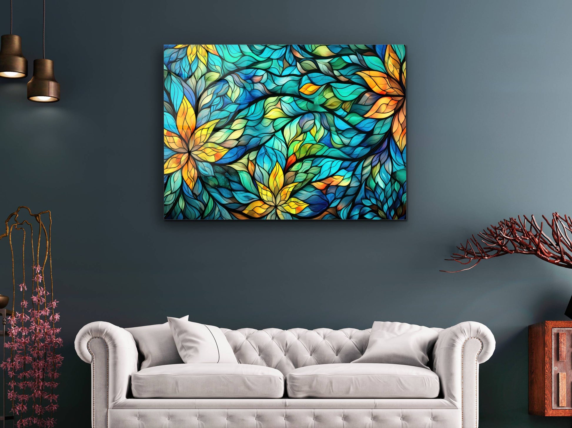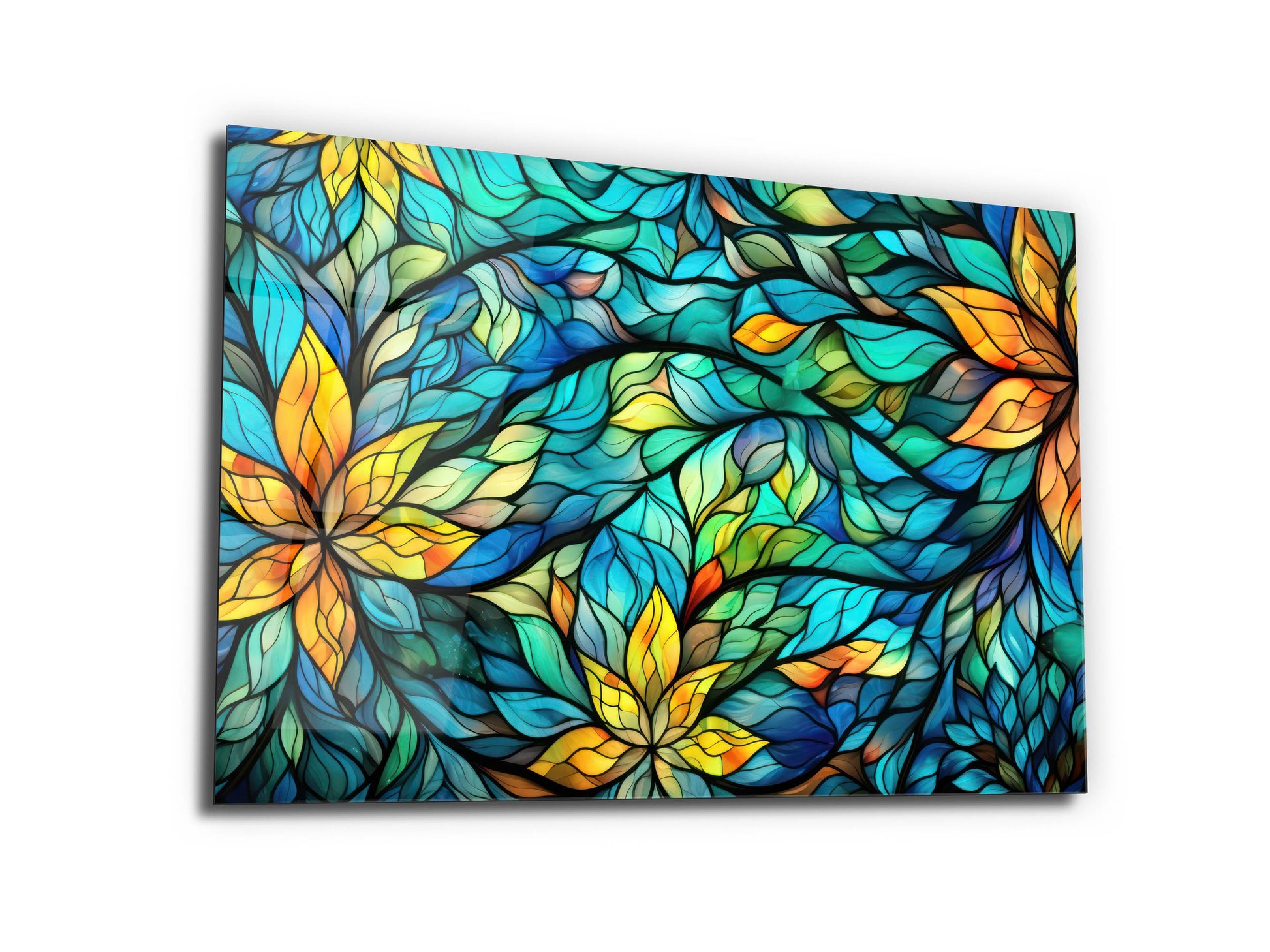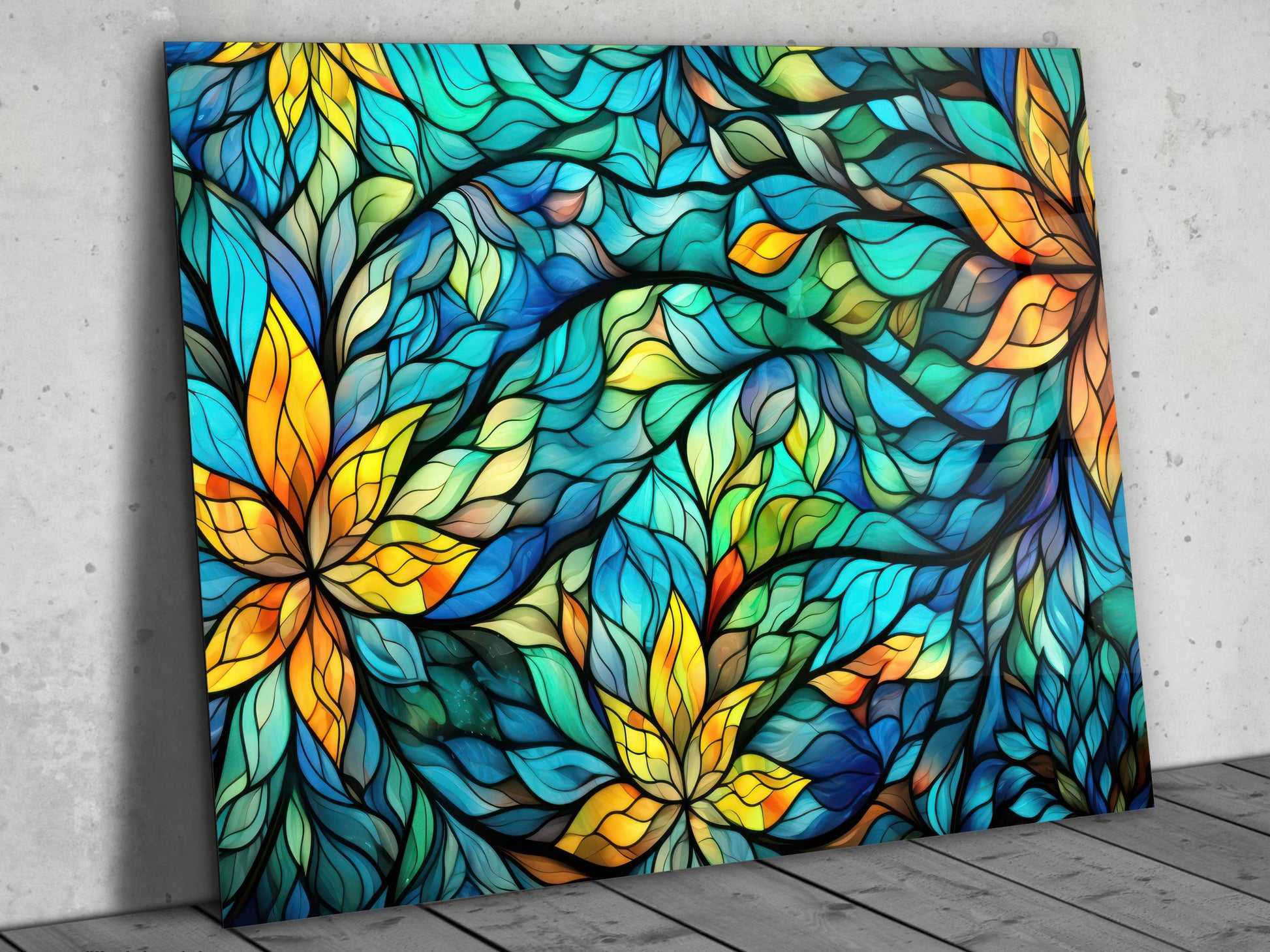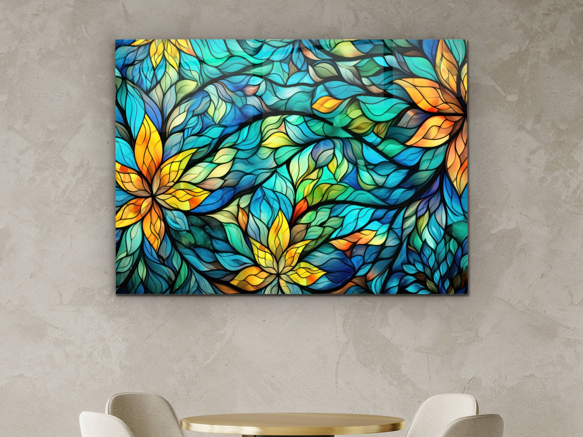 Çiçekli Renkli Cam Tablo - Cam Duvar Dekoru - Floral Duvar Tablosu
