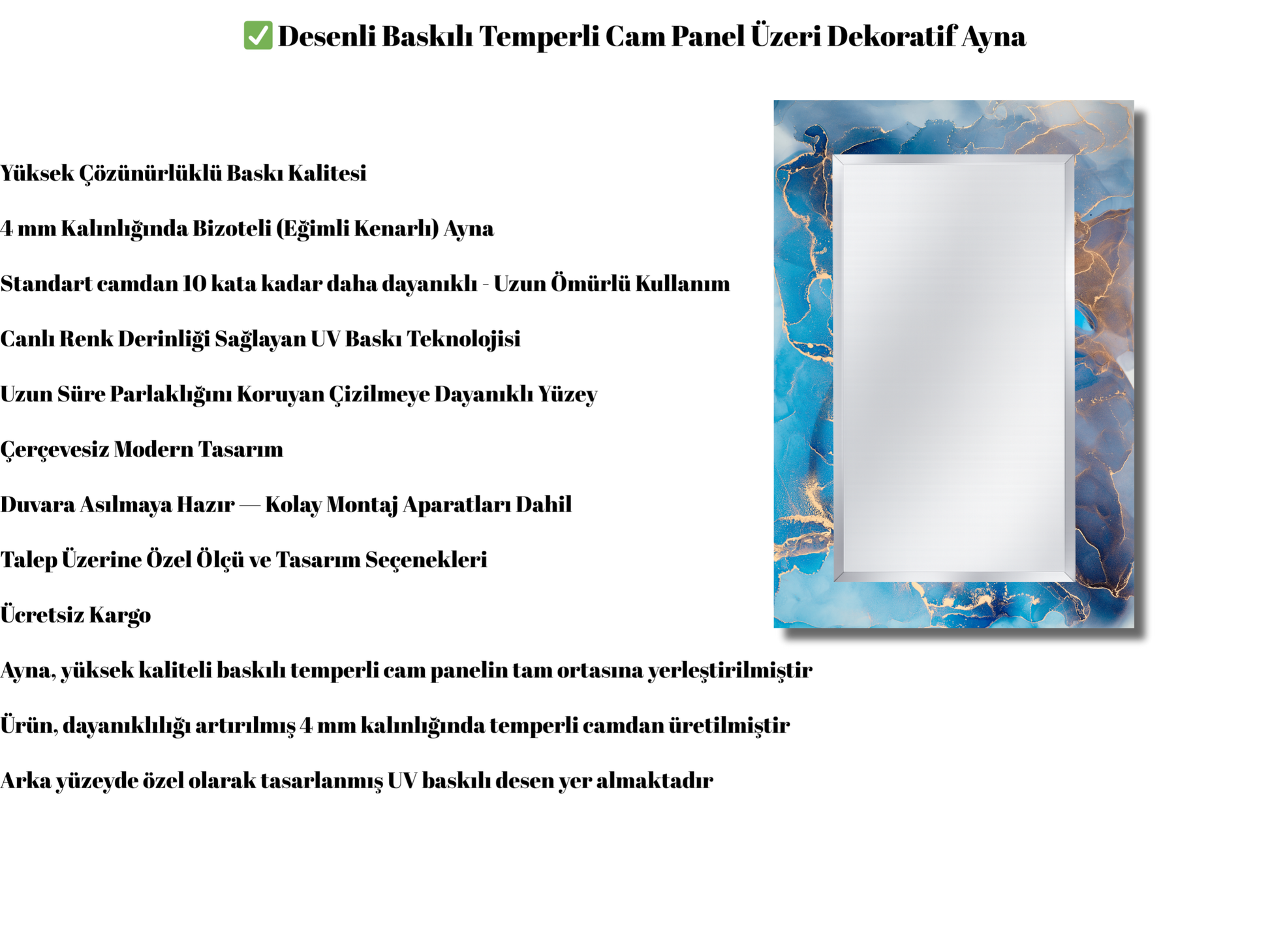 Ürünlerimiz, 4 mm kalınlığında temperli cam üzerine canlı UV baskılı desenlerle üretilir ve merkezinde yer alan 4 mm bizoteli ayna ile hem dayanıklılık hem de zarif bir estetik sunar.