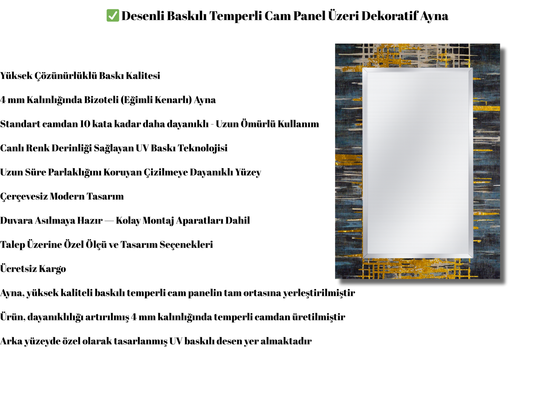 Ürünlerimiz, 4 mm kalınlığında temperli cam üzerine canlı UV baskılı desenlerle üretilir ve merkezinde yer alan 4 mm bizoteli ayna ile hem dayanıklılık hem de zarif bir estetik sunar.