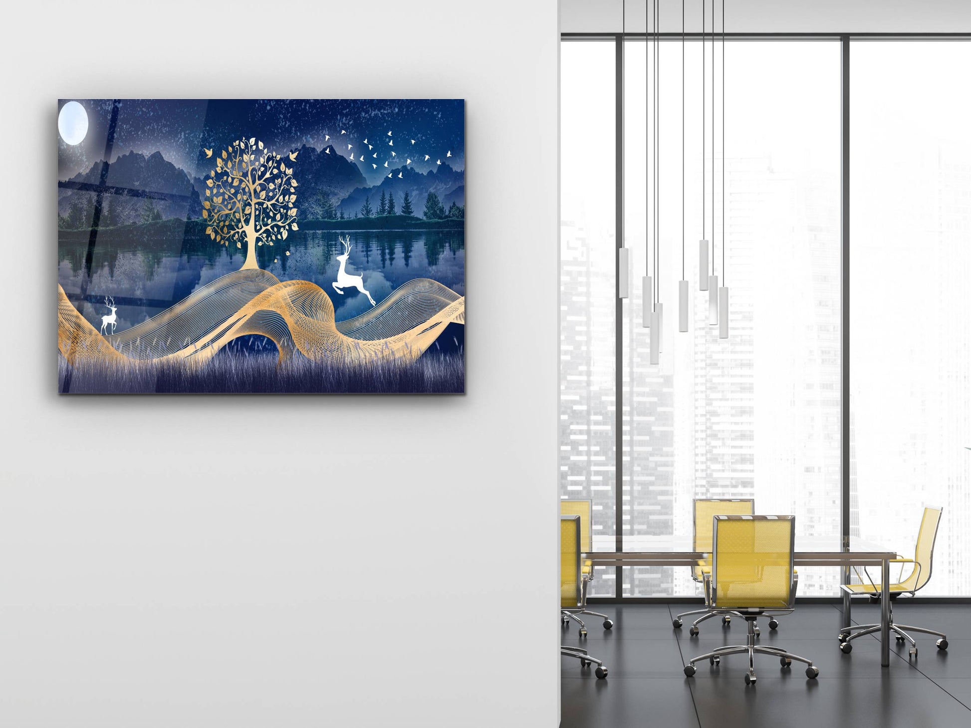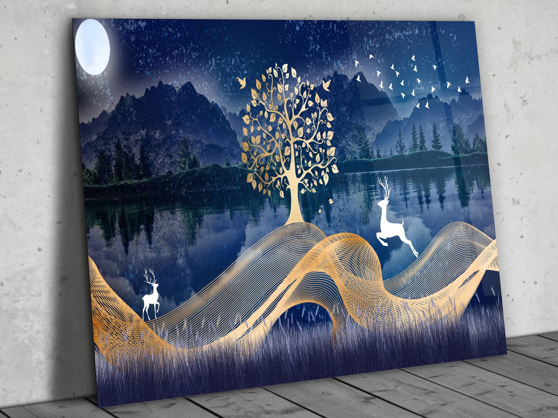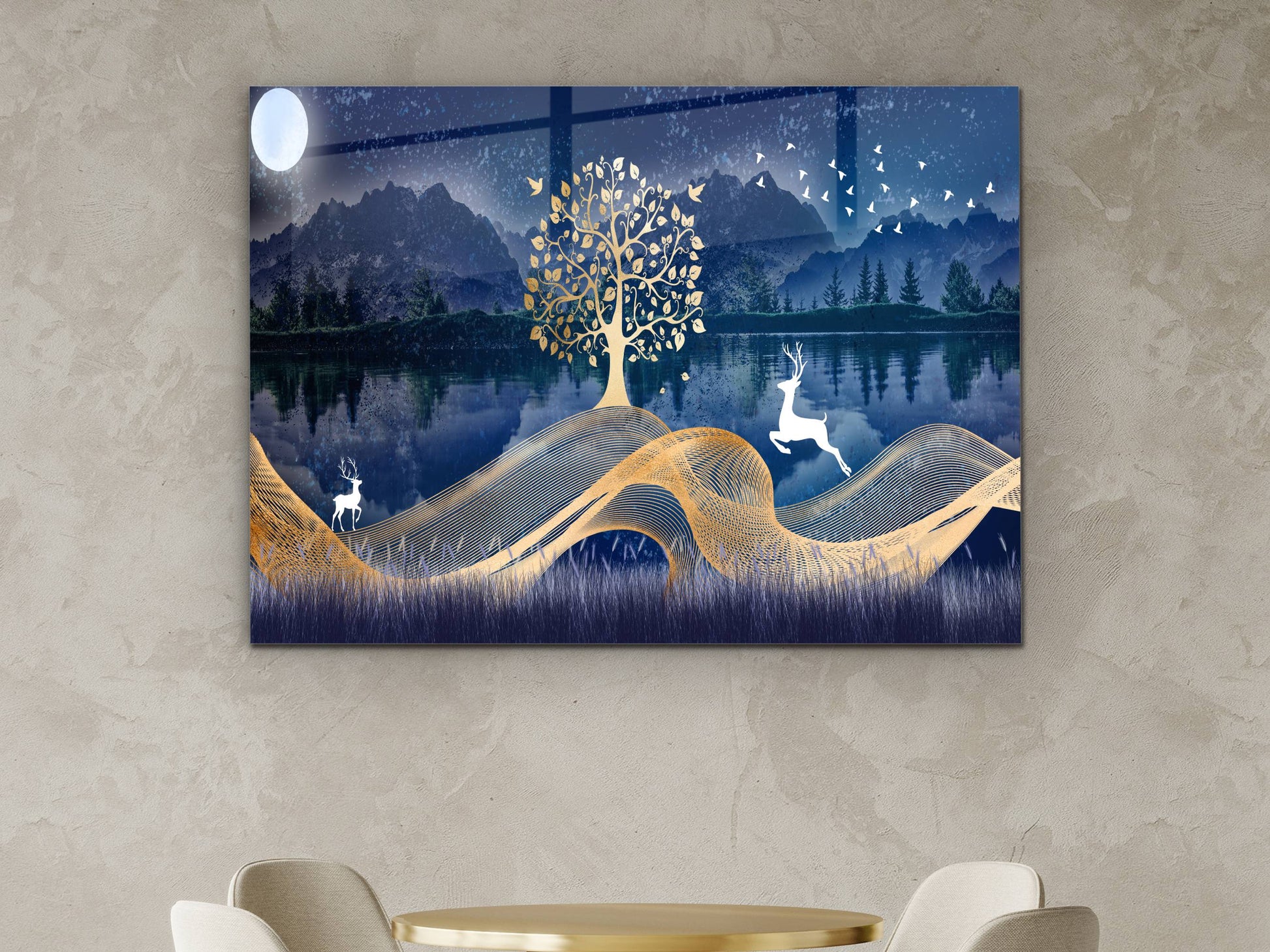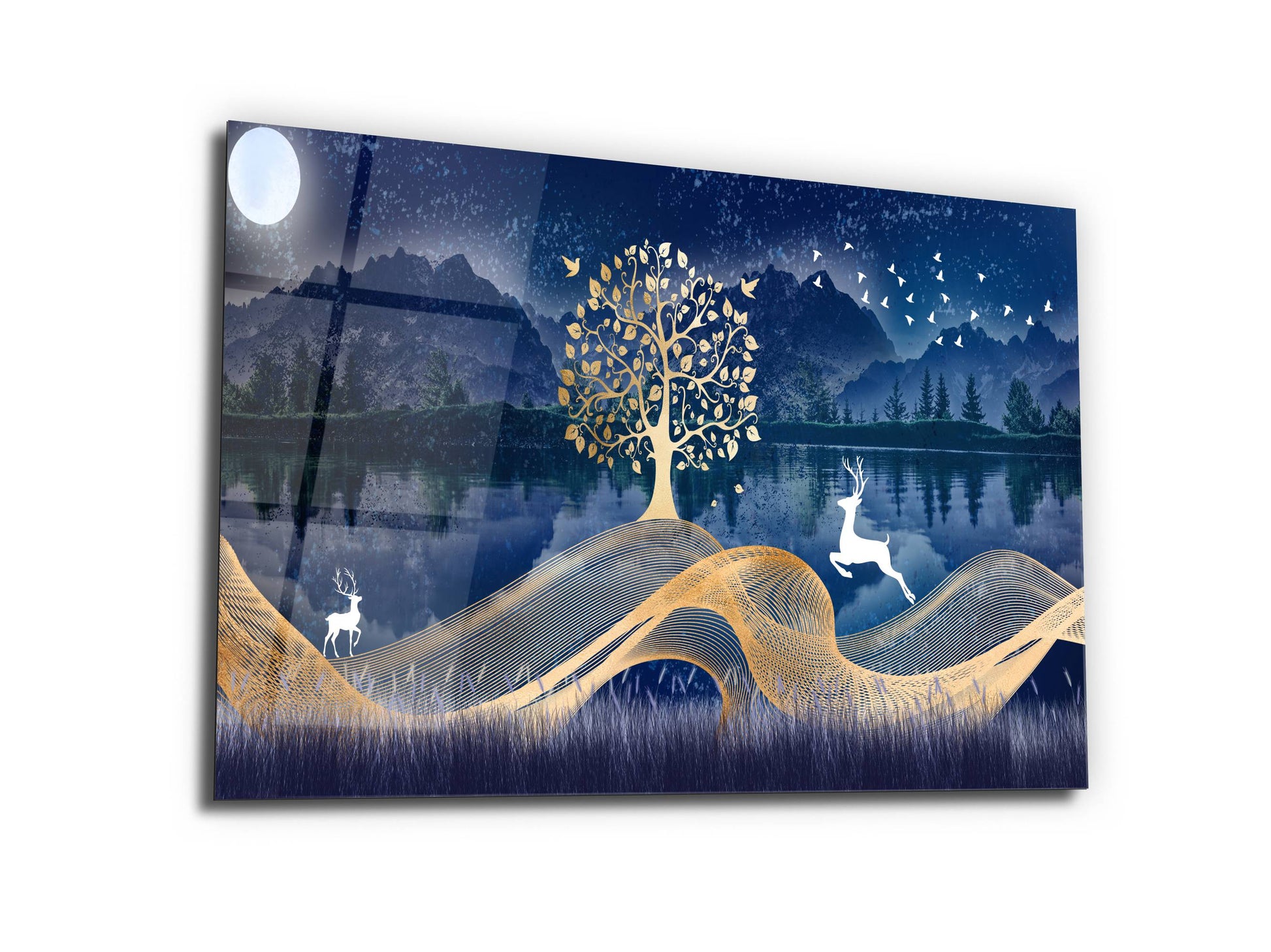 Doğa ve Göl Manzaralı Sanatsal Cam Tablo - Altın Dalga ve Geyik Temalı Cam Tablo