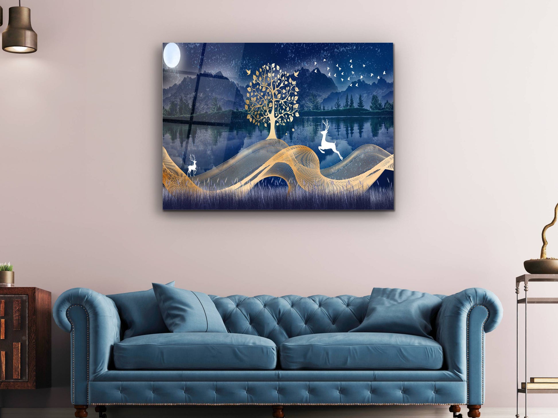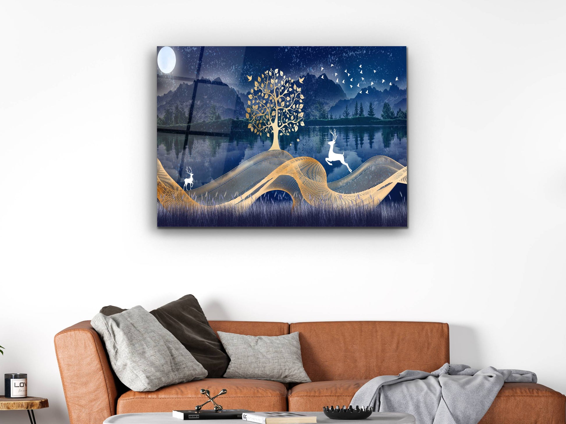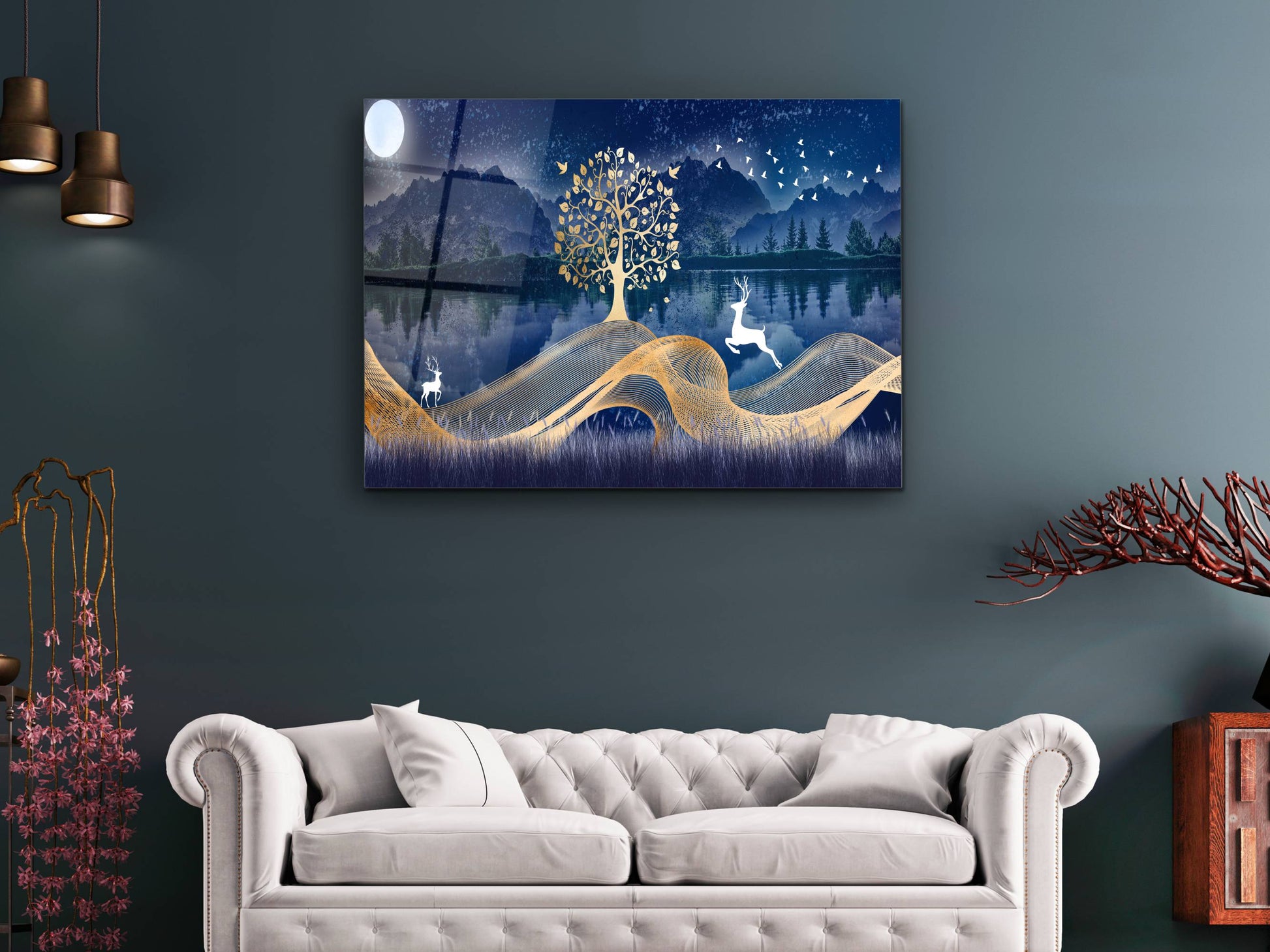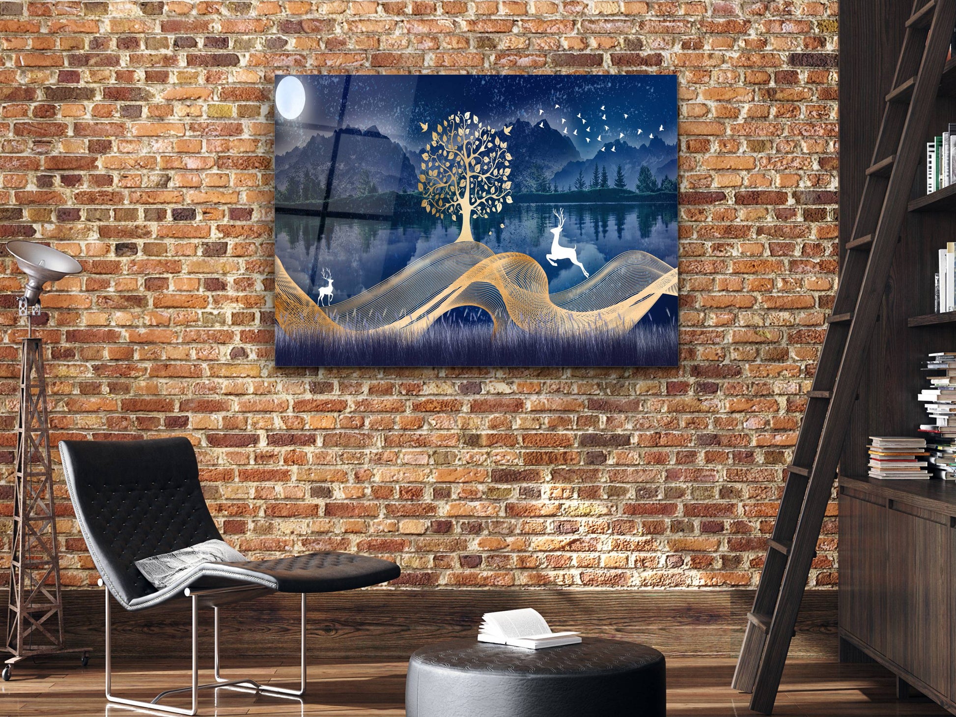 Doğa ve Göl Manzaralı Sanatsal Cam Tablo - Altın Dalga ve Geyik Temalı Cam Tablo