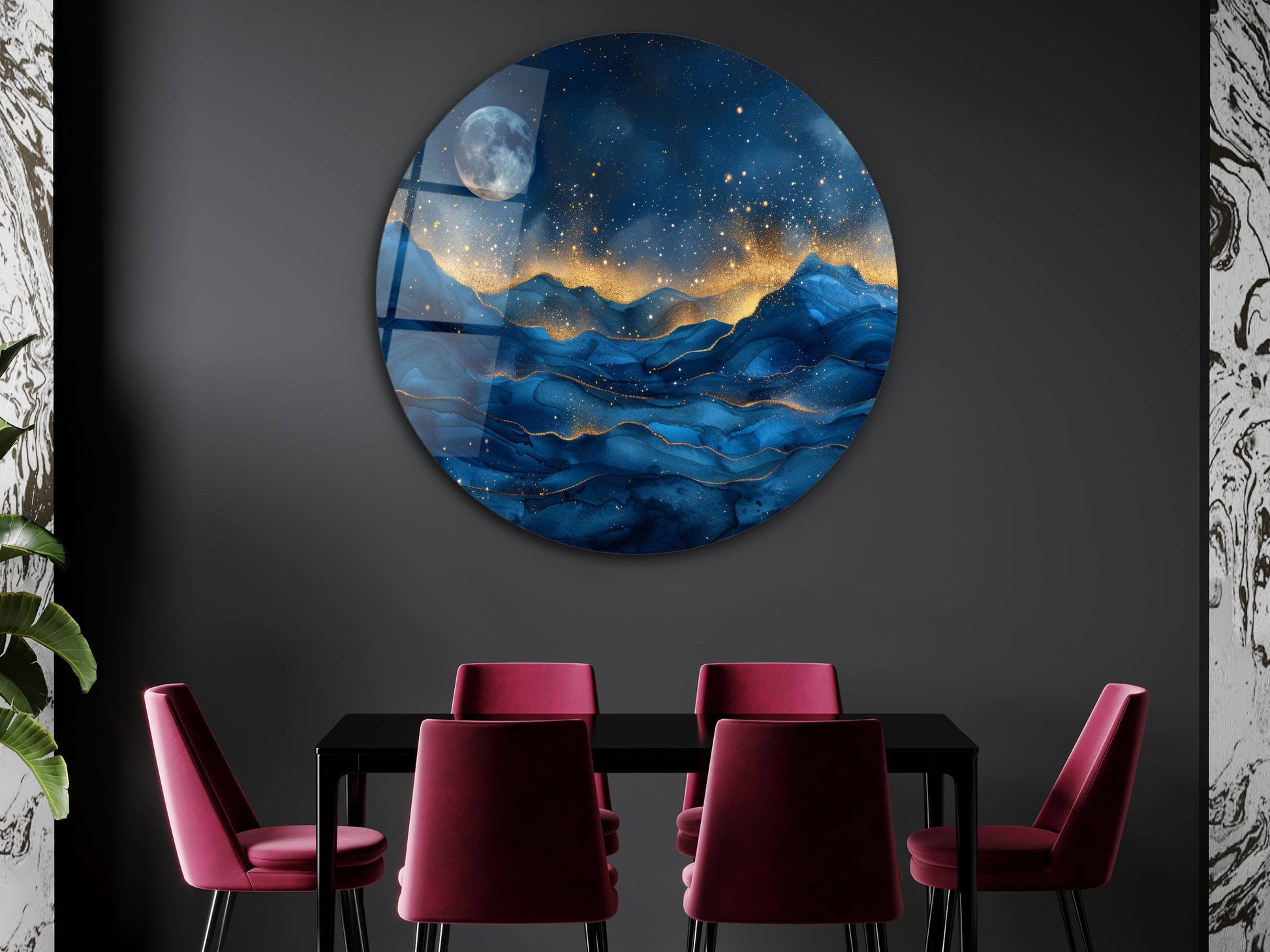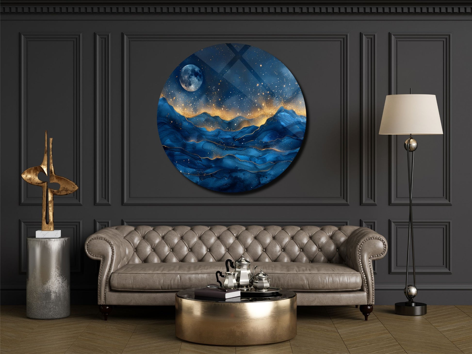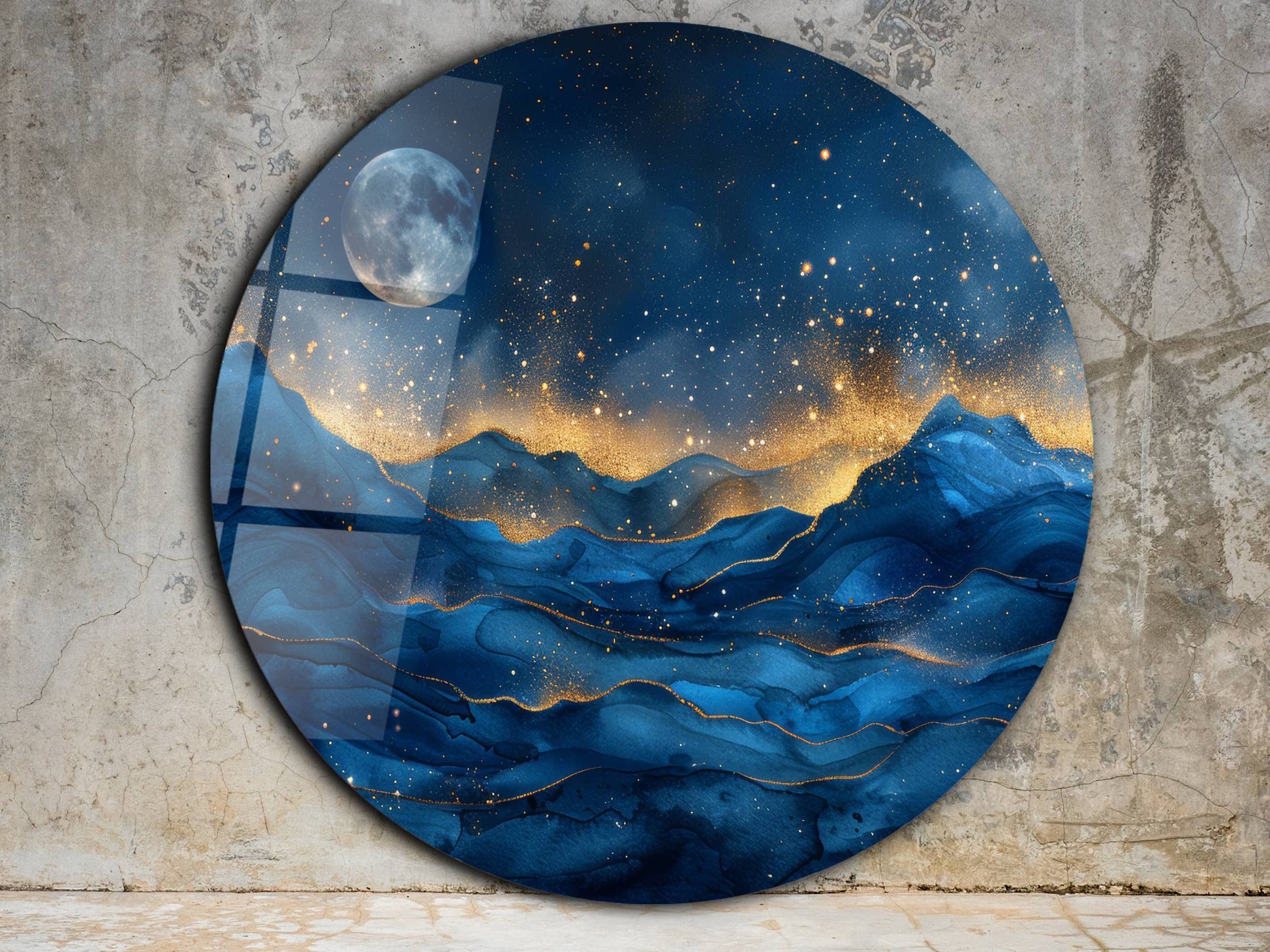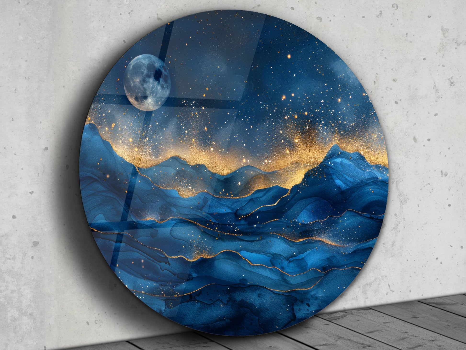 Gece Manzaralı Cam Tablo – Altın Işıltılı Dağlar ve Ay Temalı Yuvarlak Tablo
