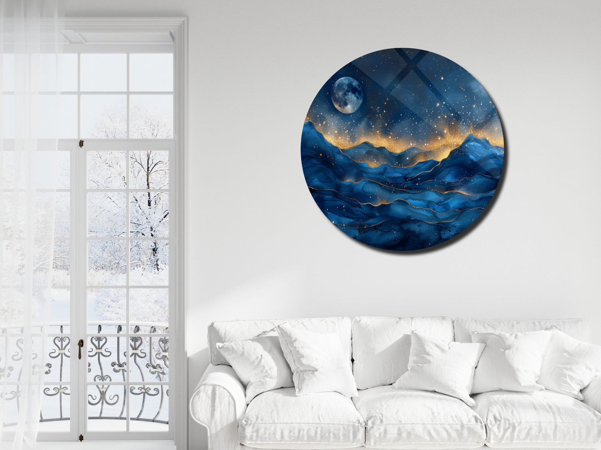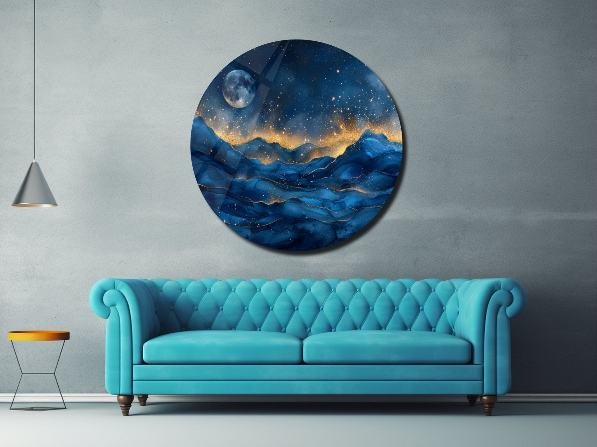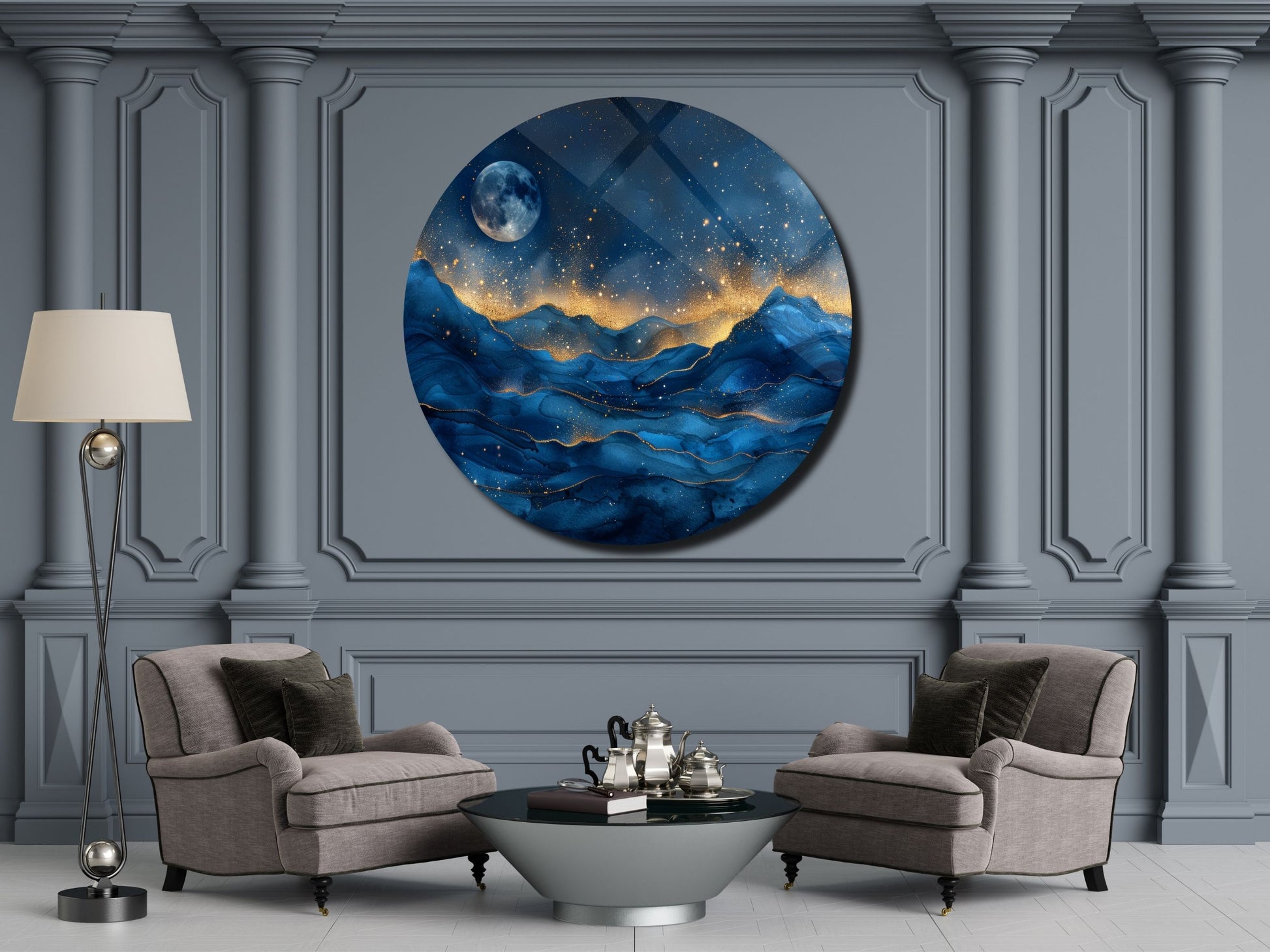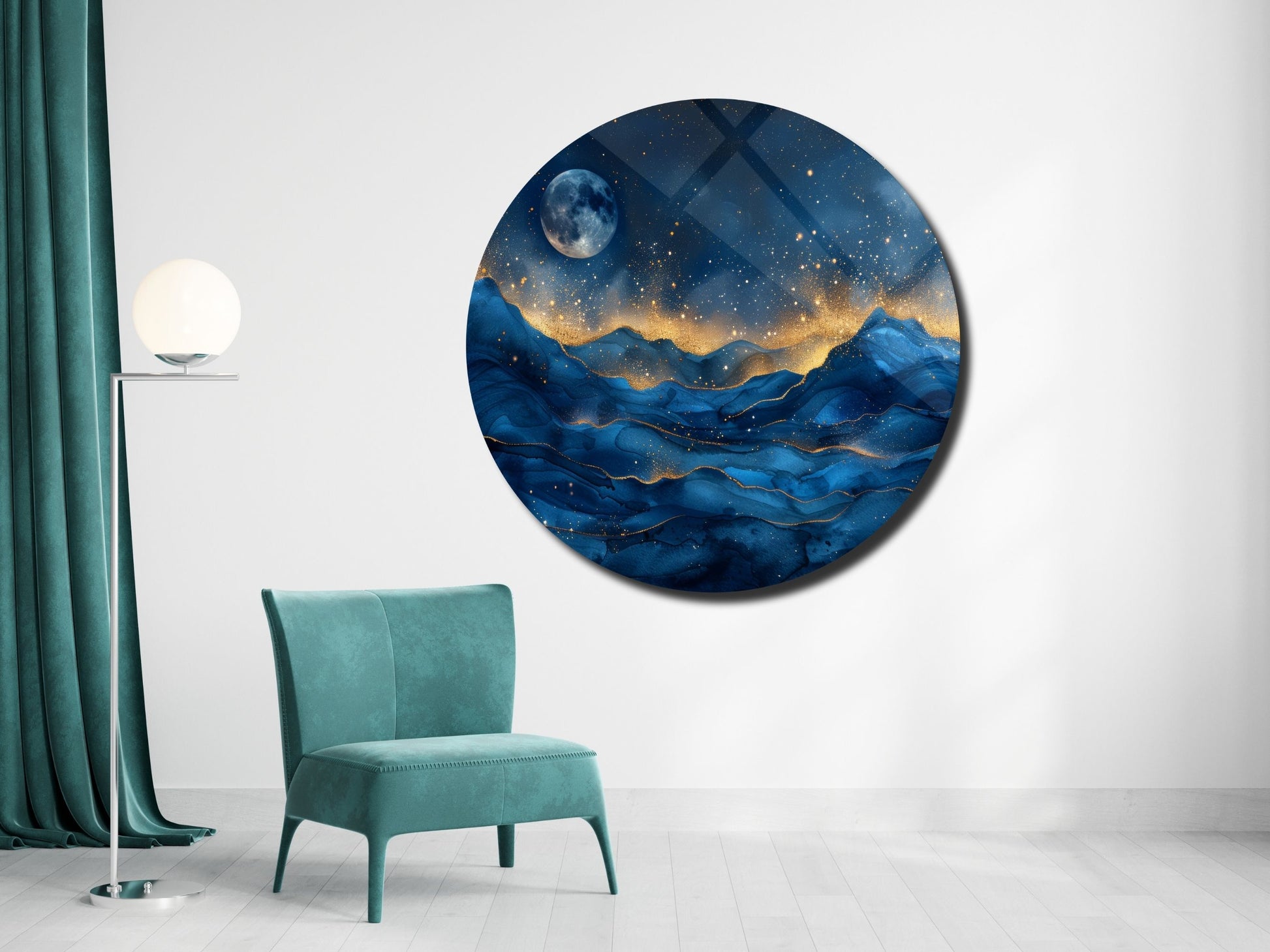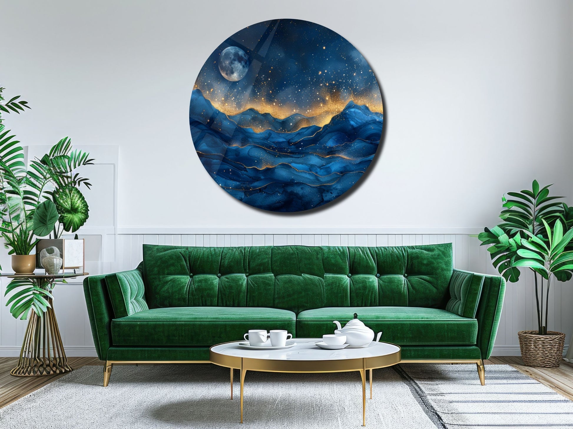 Gece Manzaralı Cam Tablo – Altın Işıltılı Dağlar ve Ay Temalı Yuvarlak Tablo