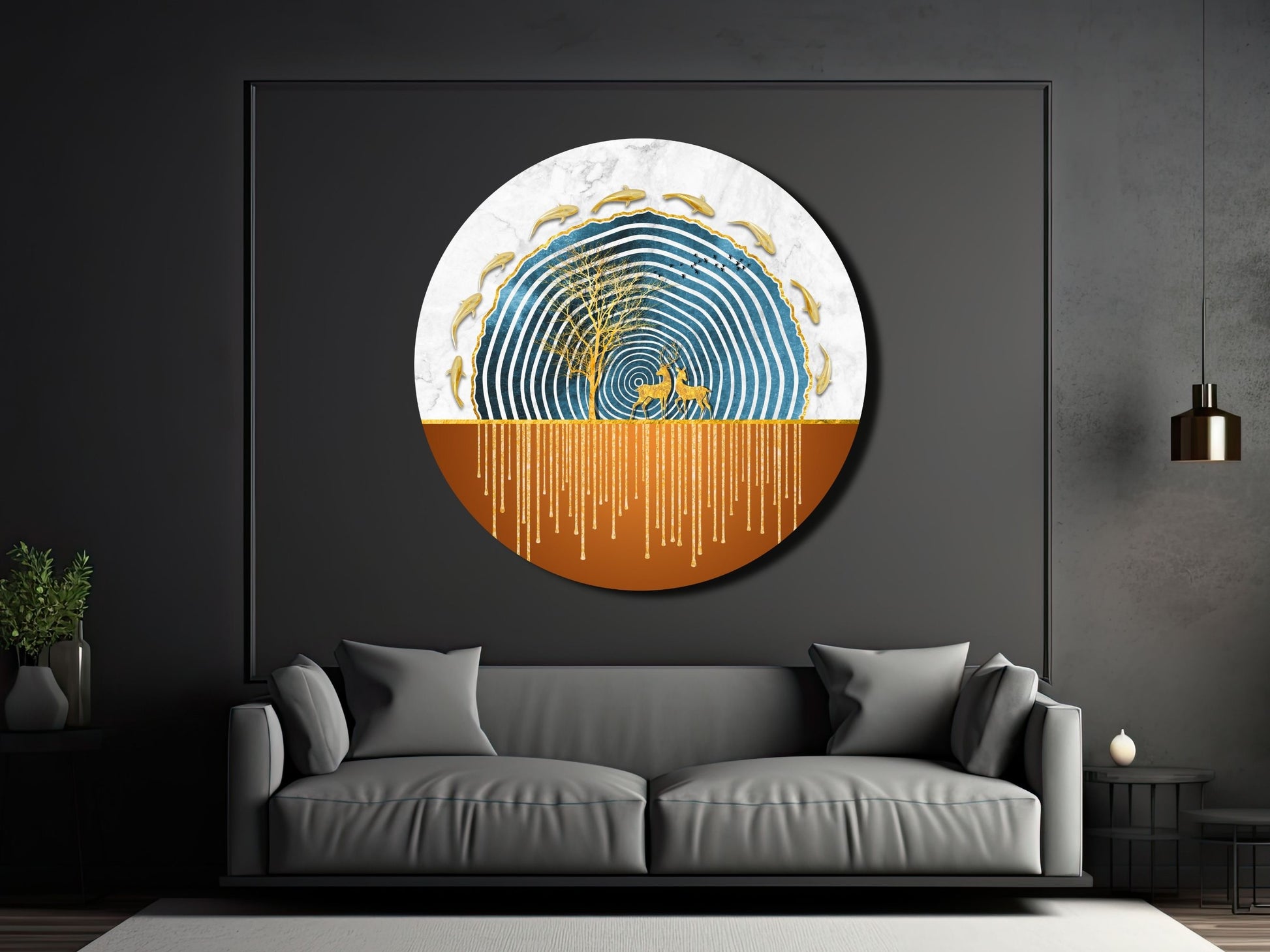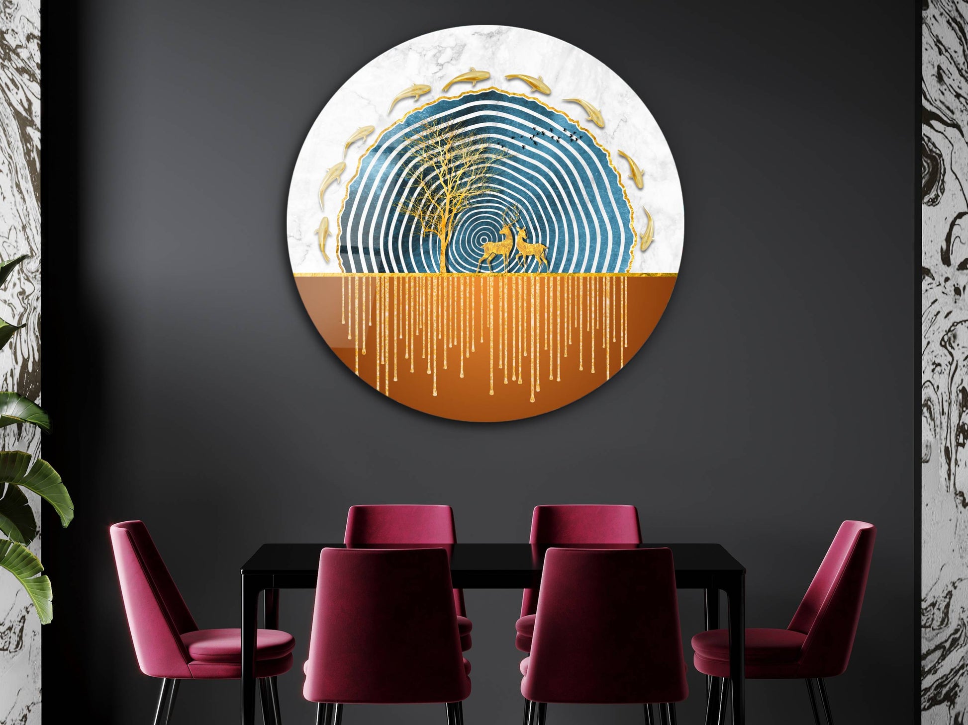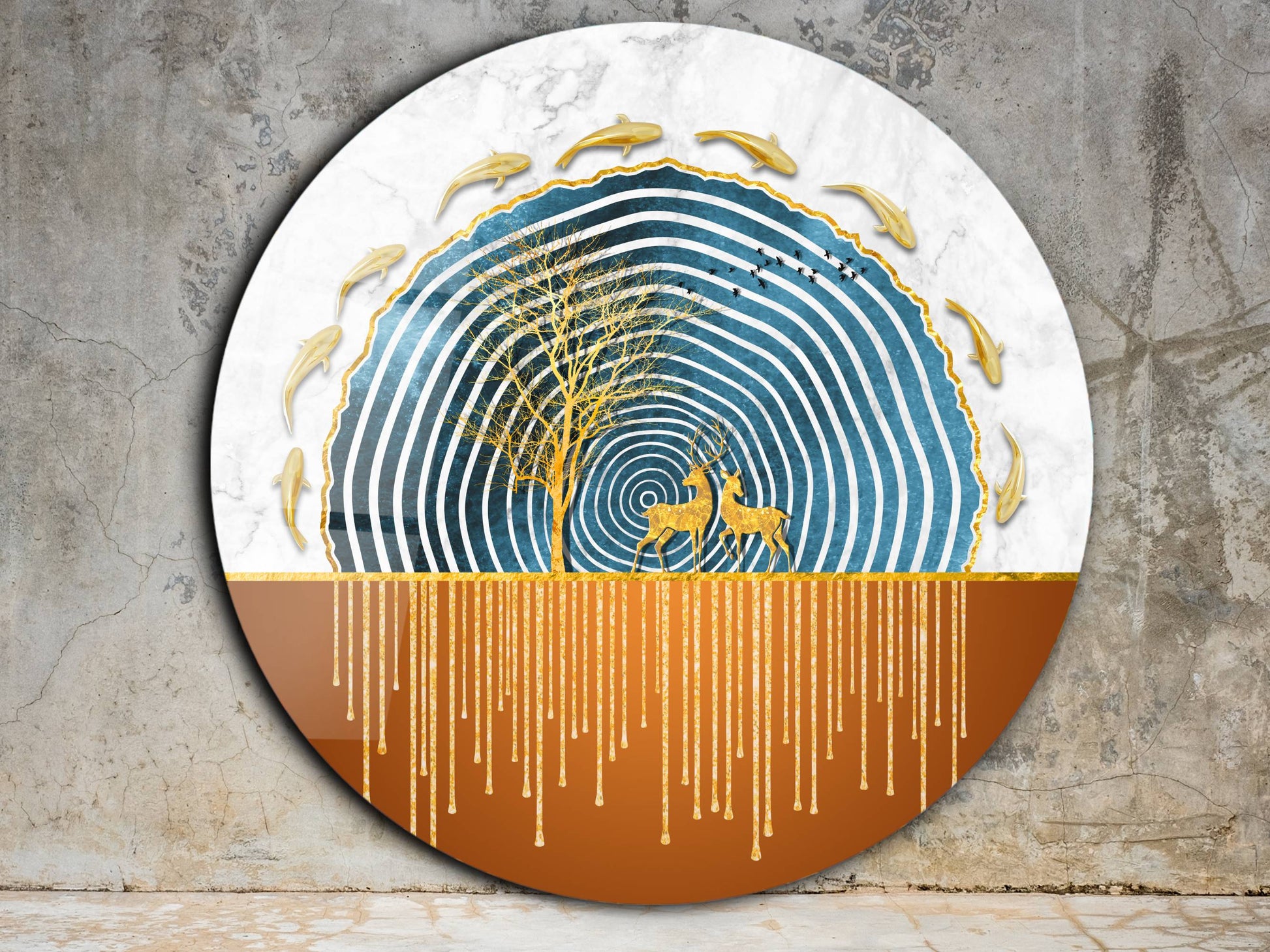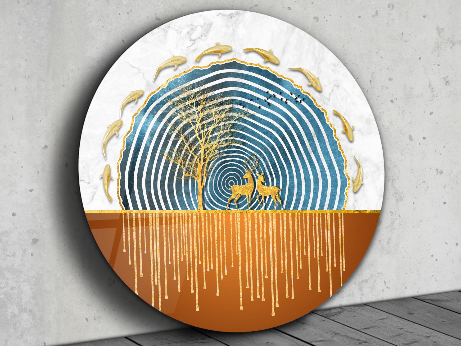 Geyik, Ağaç ve Balık Simgeli Cam Tablo - Denge Temalı Sanatsal Duvar Dekor