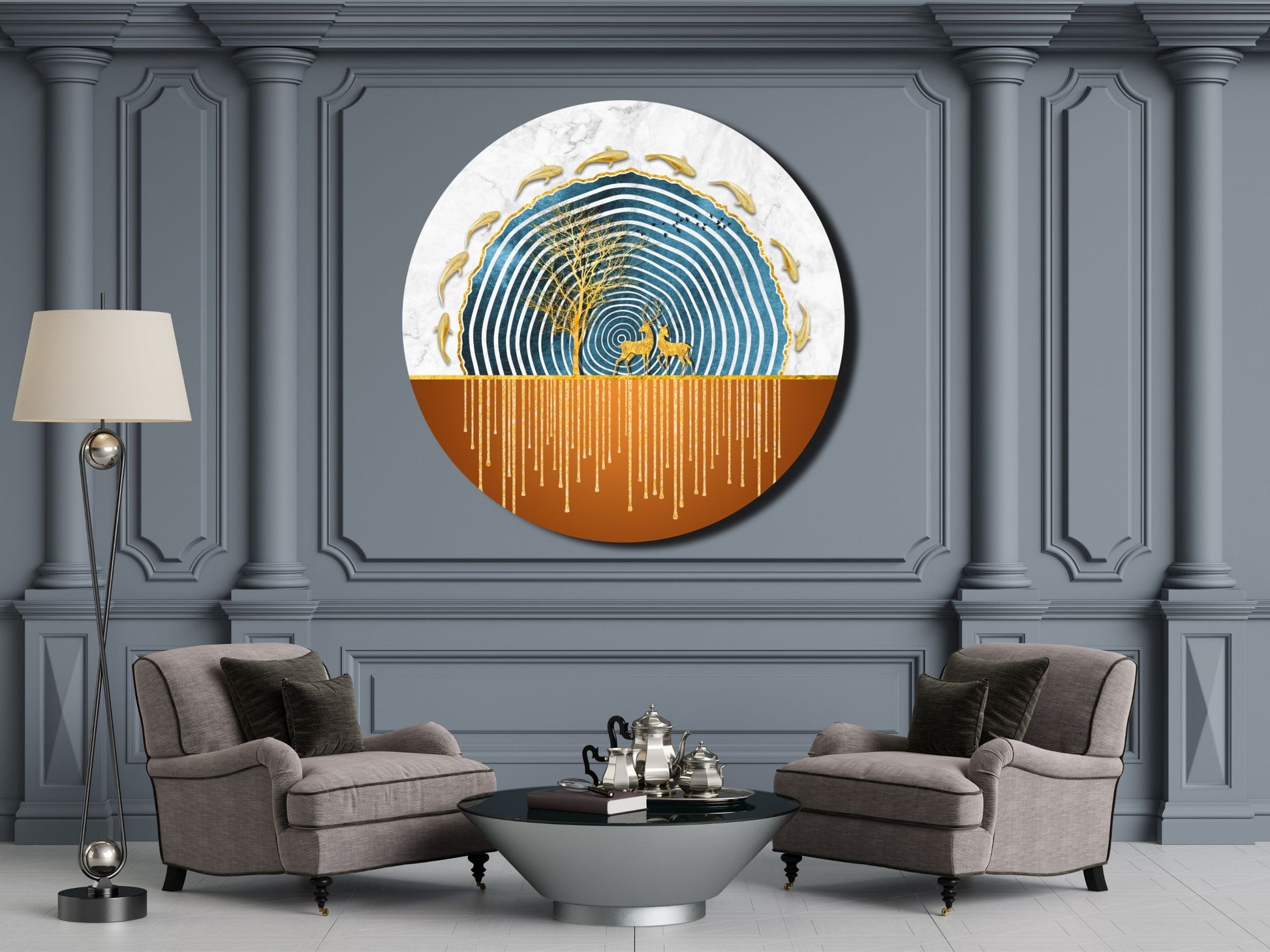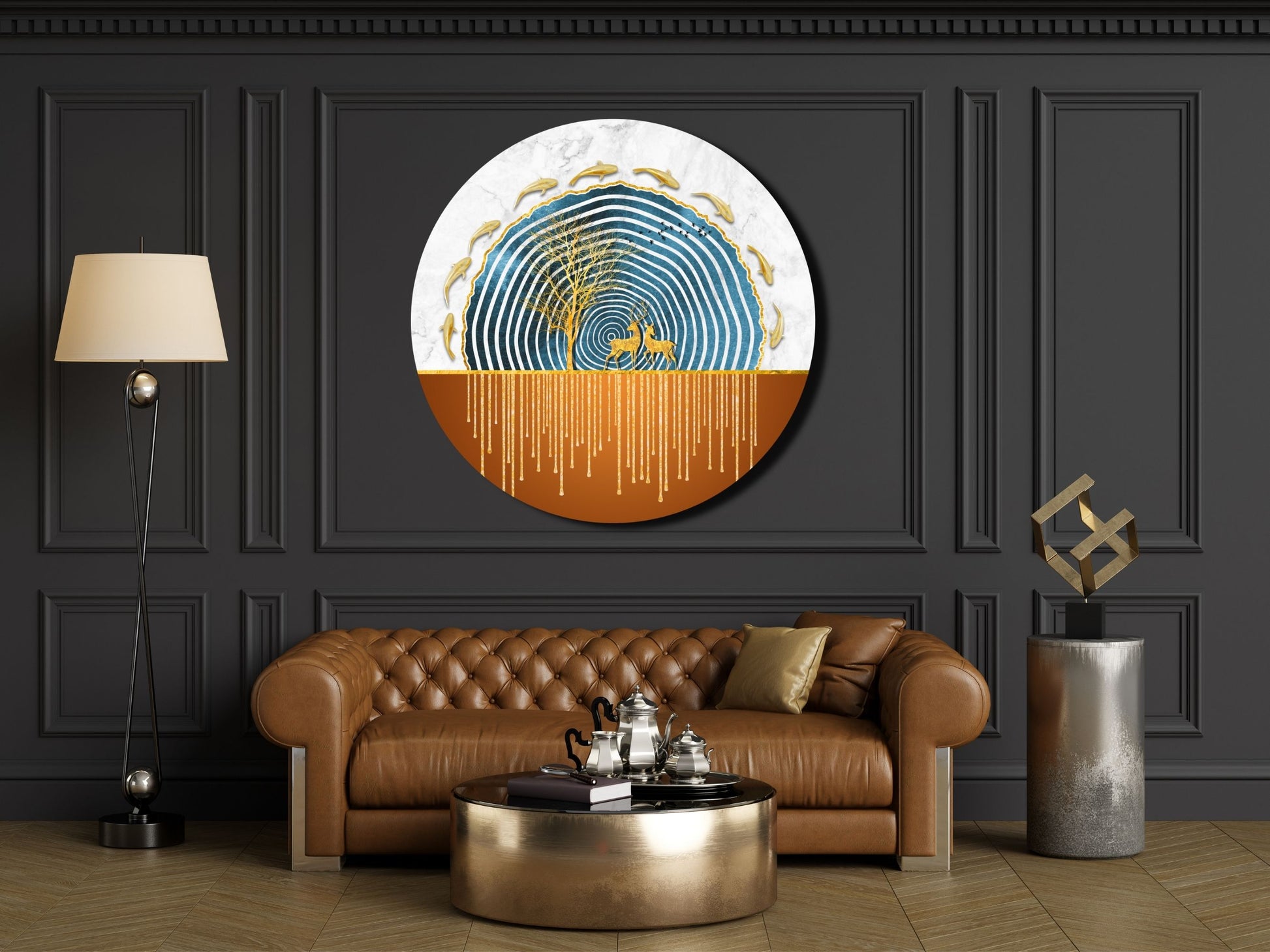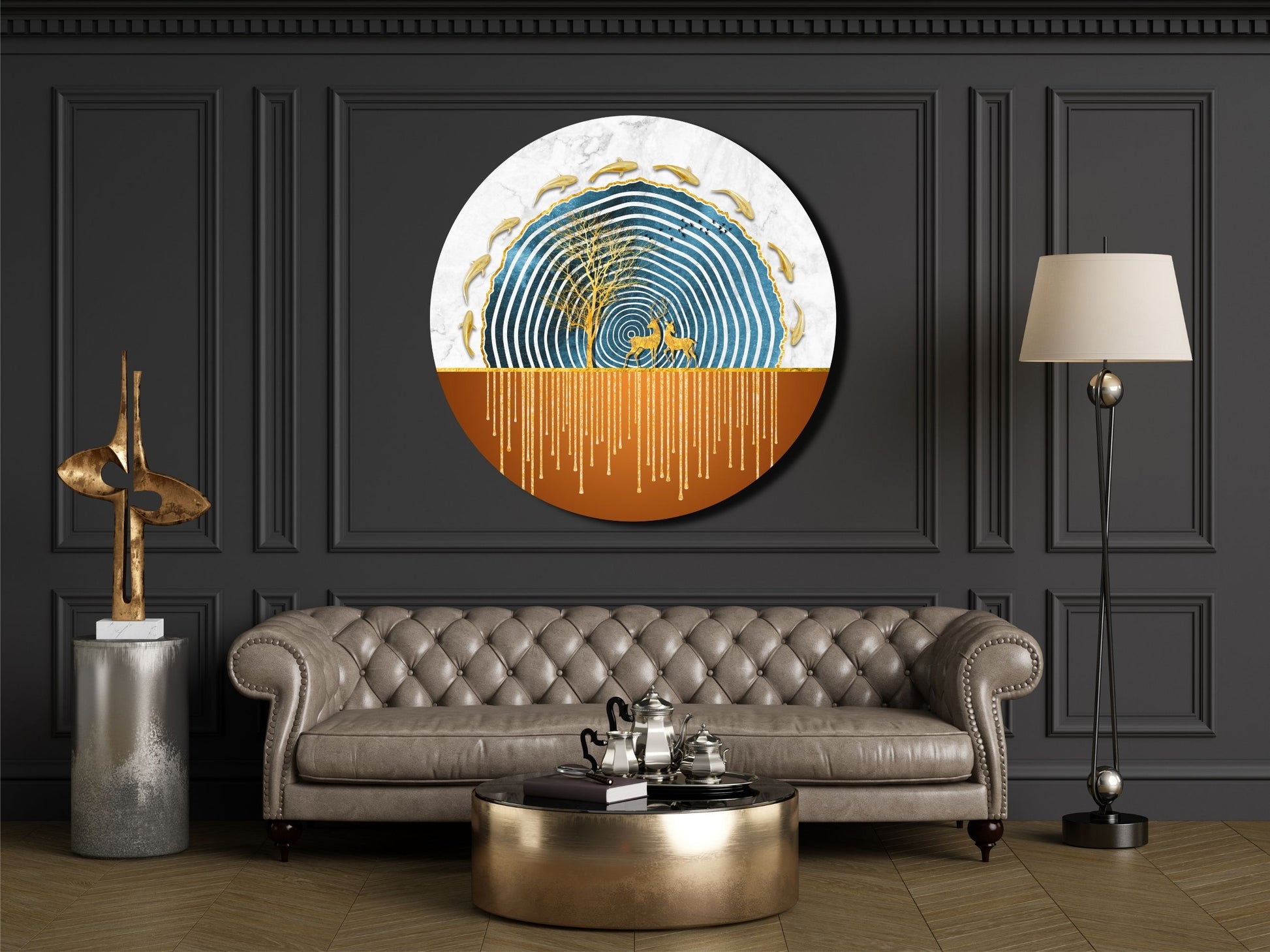Geyik, Ağaç ve Balık Simgeli Cam Tablo - Denge Temalı Sanatsal Duvar Dekor