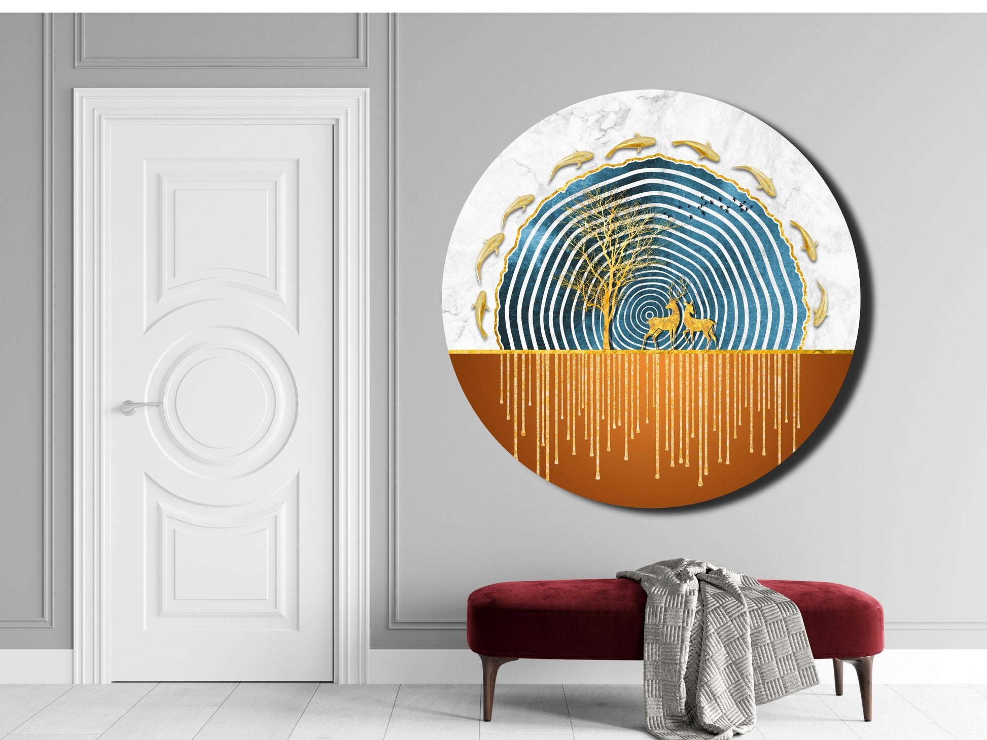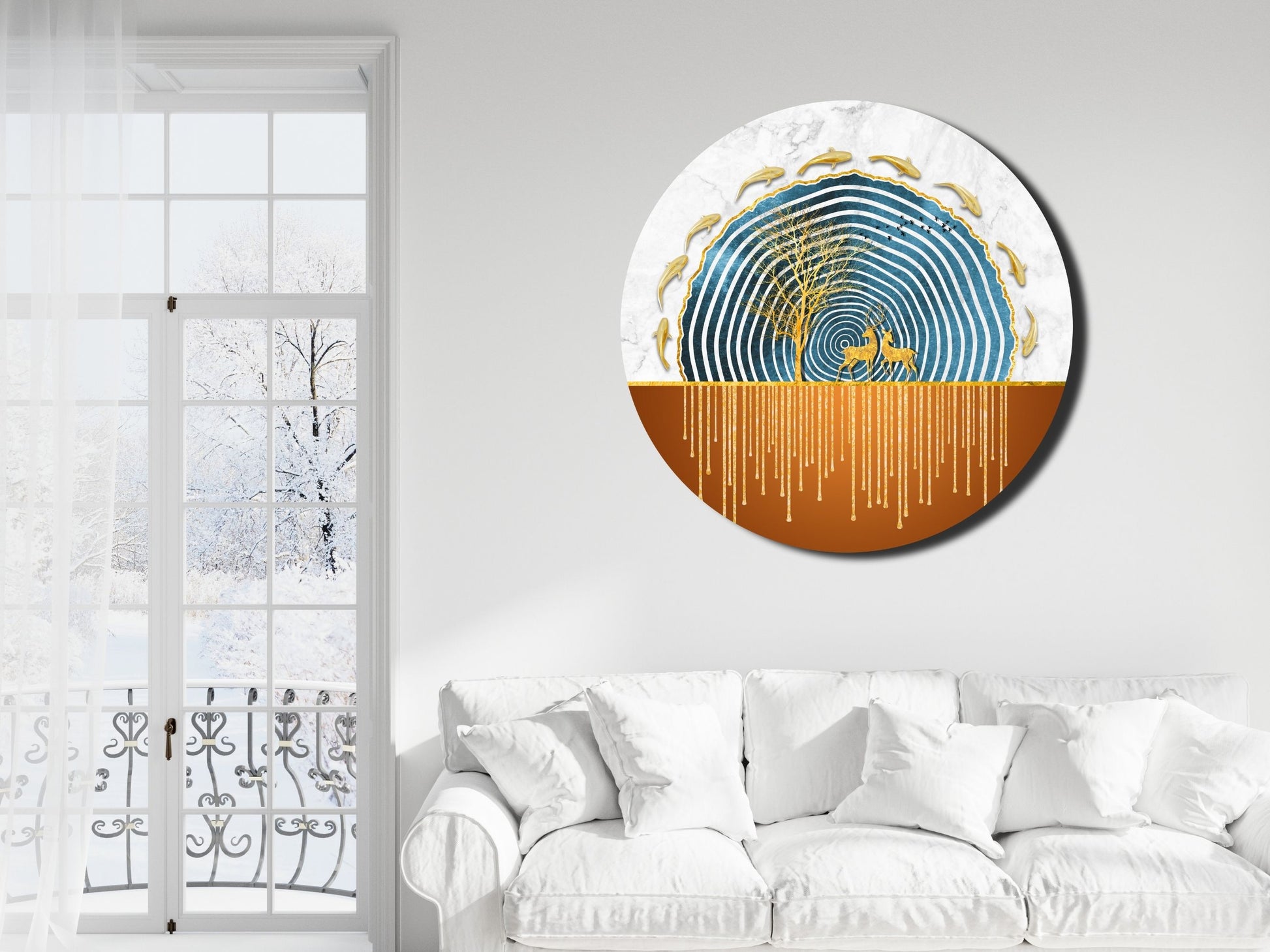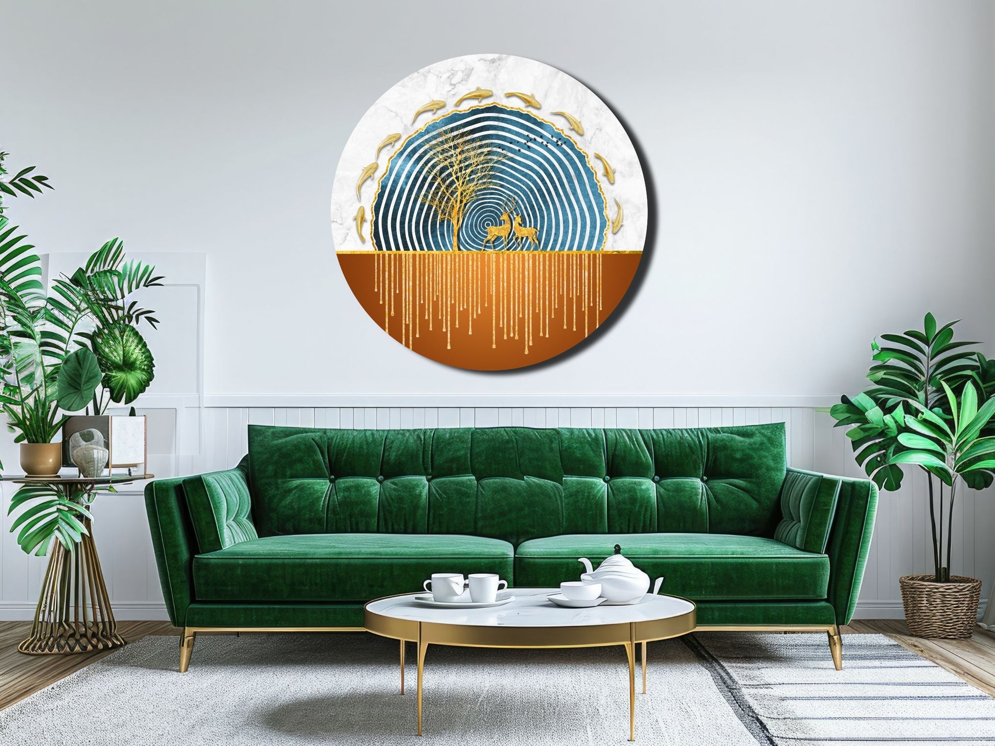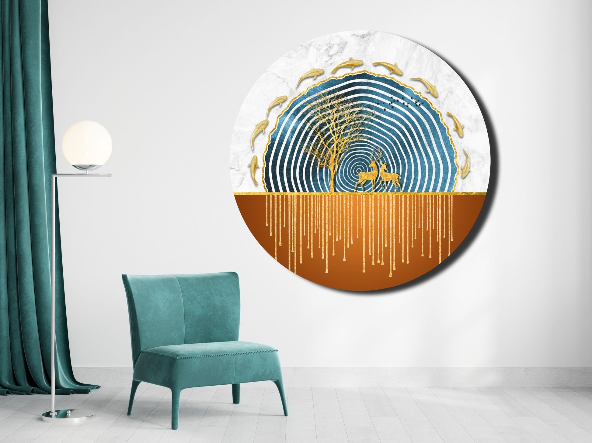 Geyik, Ağaç ve Balık Simgeli Cam Tablo - Denge Temalı Sanatsal Duvar Dekor