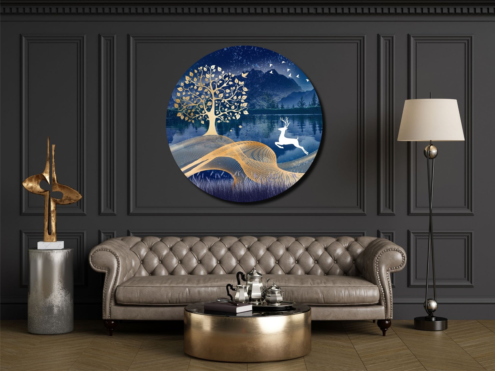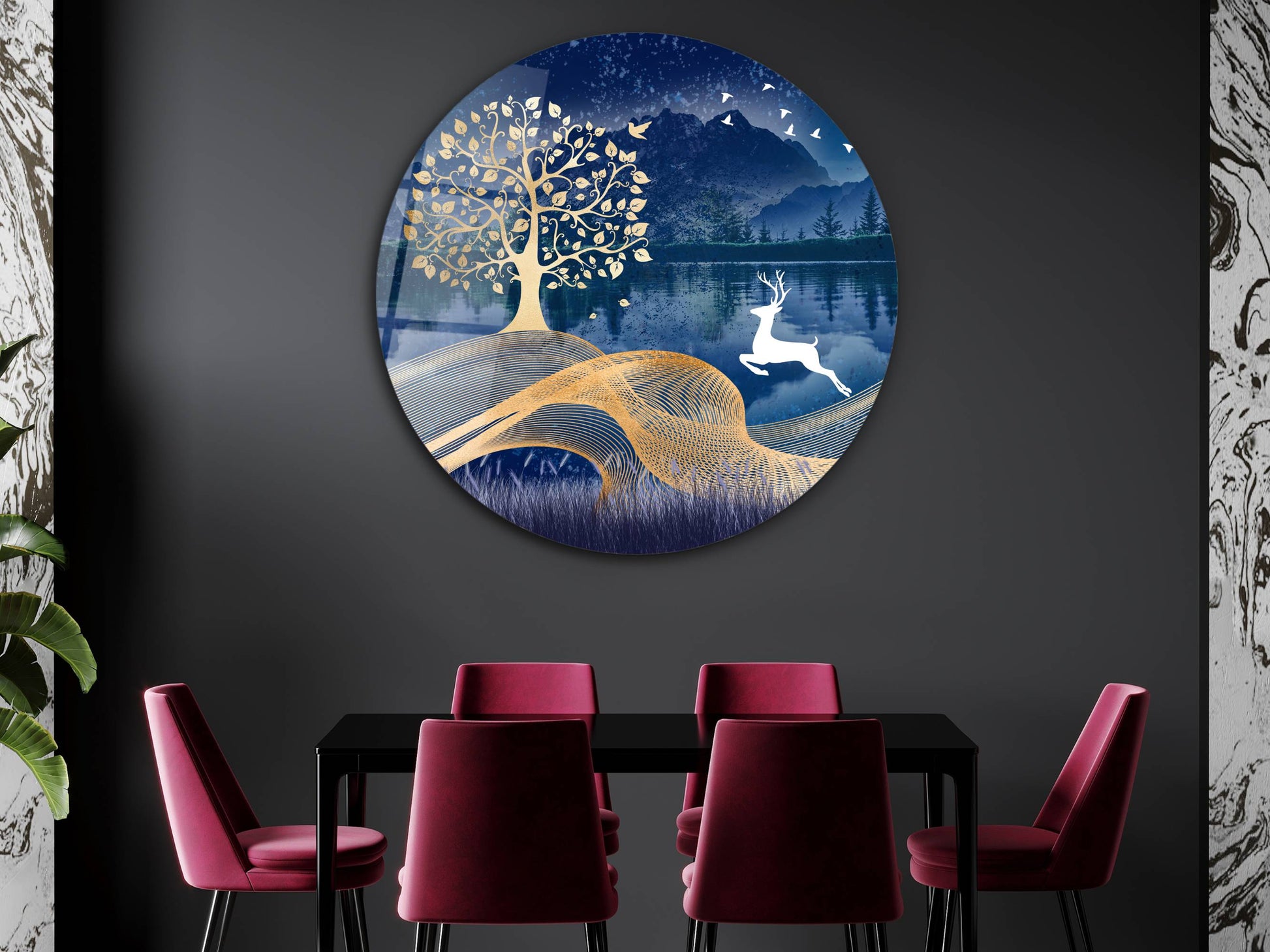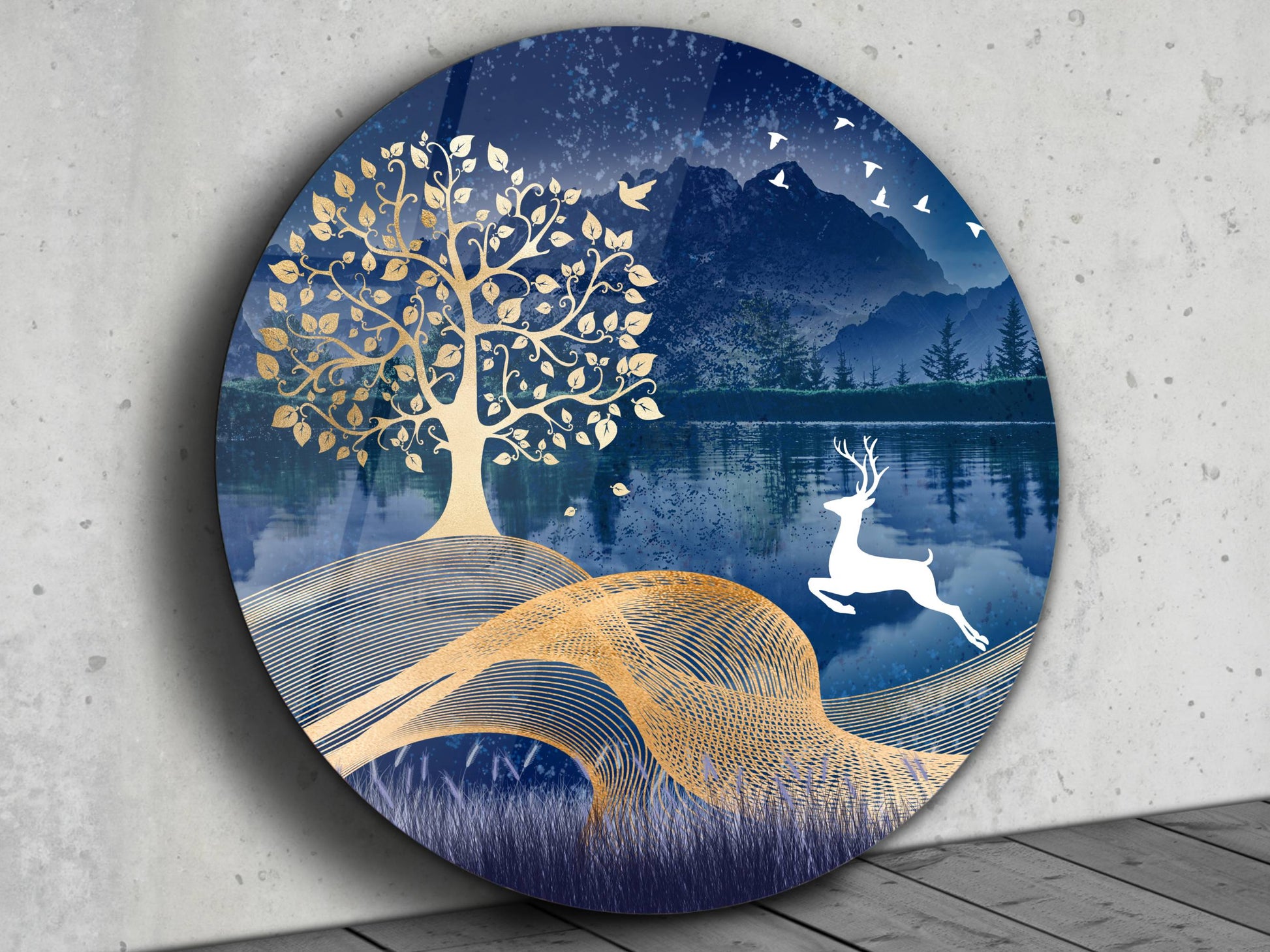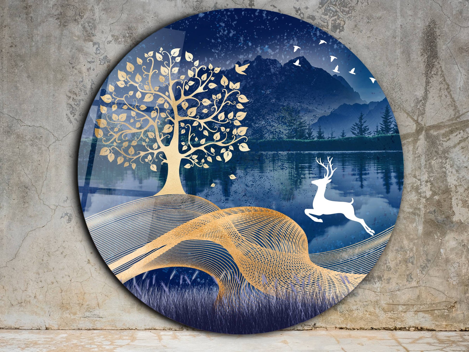 Geyik ve Gold Ağaç Cam Tablo – Yuvarlak Doğa Manzaralı Duvar Dekoru