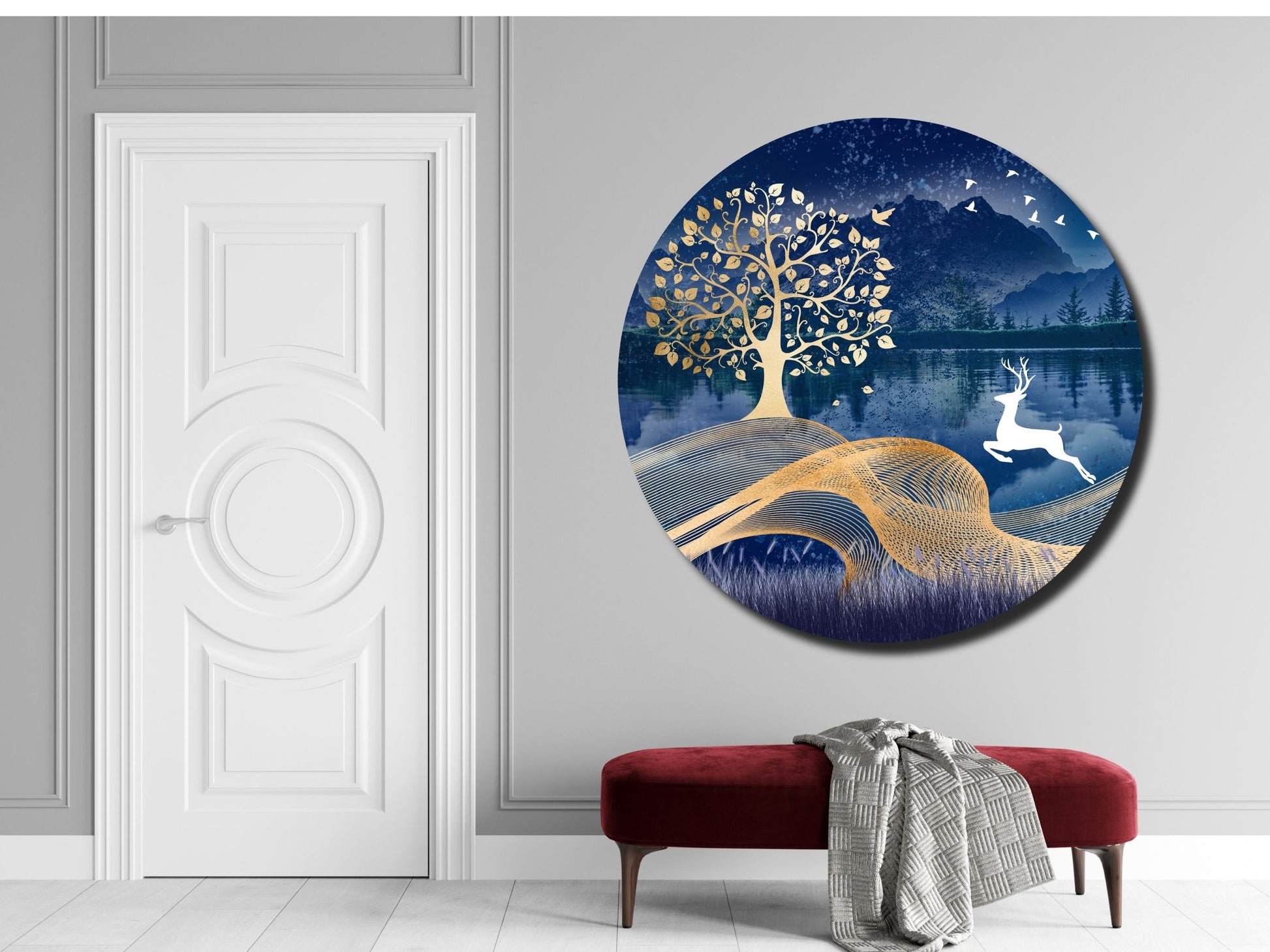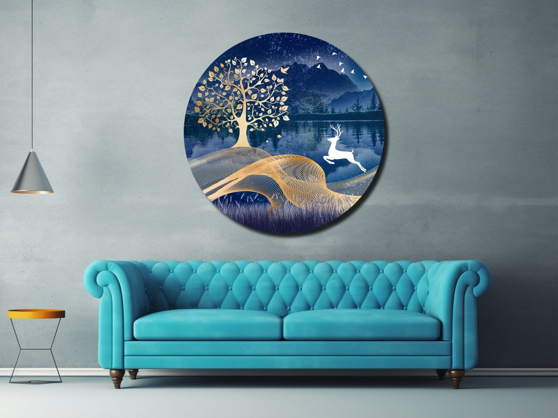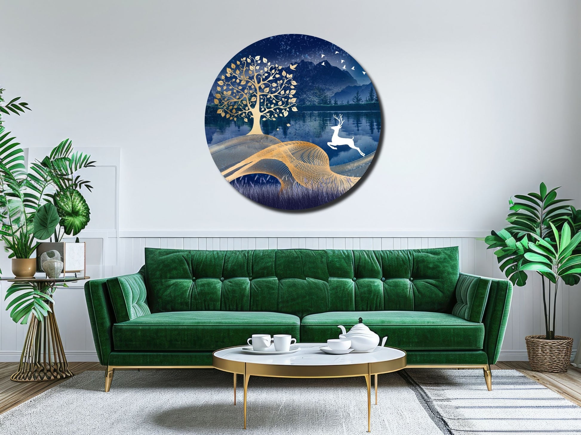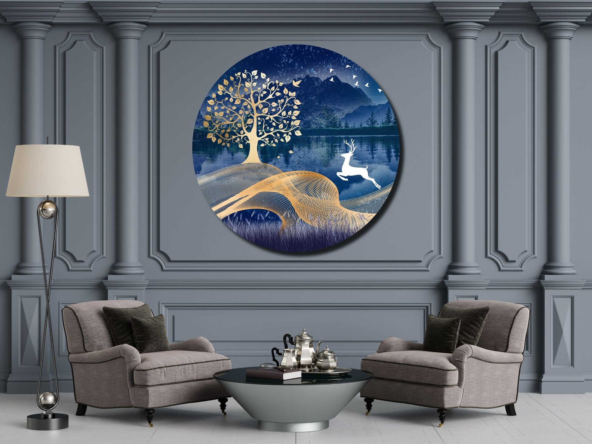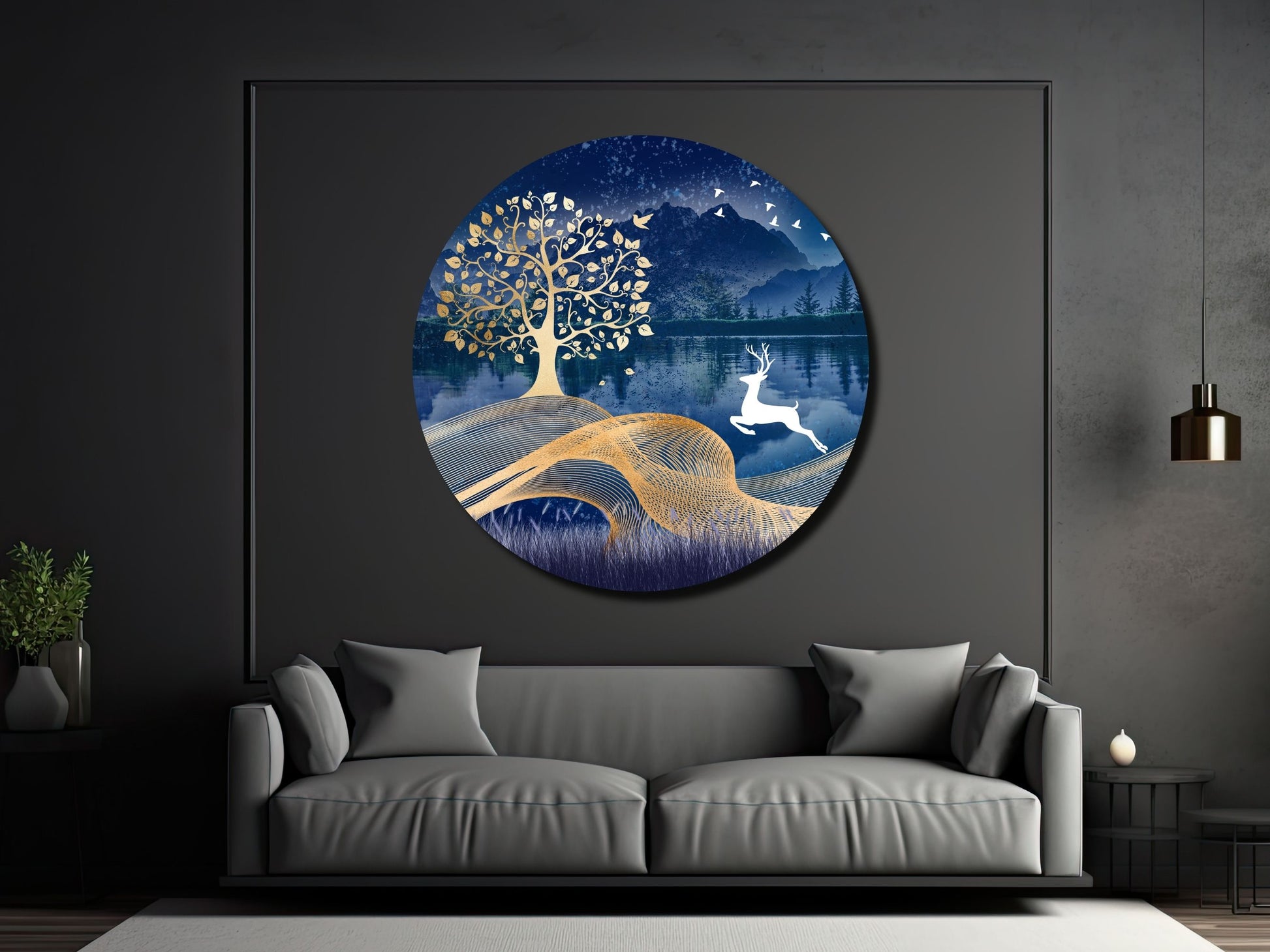 Geyik ve Gold Ağaç Cam Tablo – Yuvarlak Doğa Manzaralı Duvar Dekoru