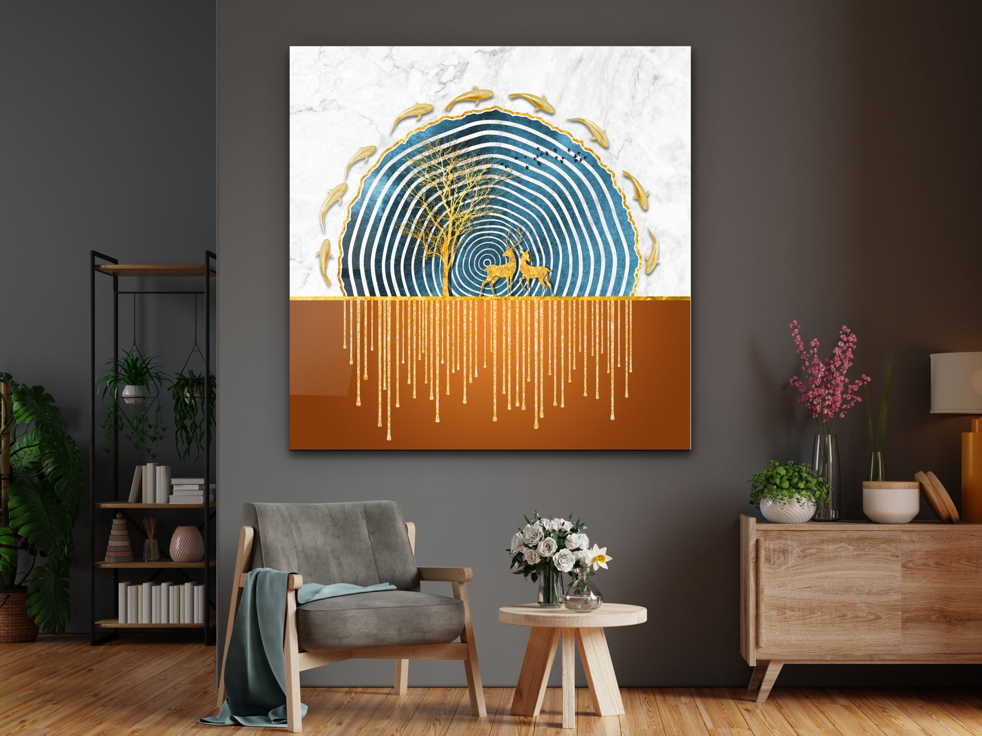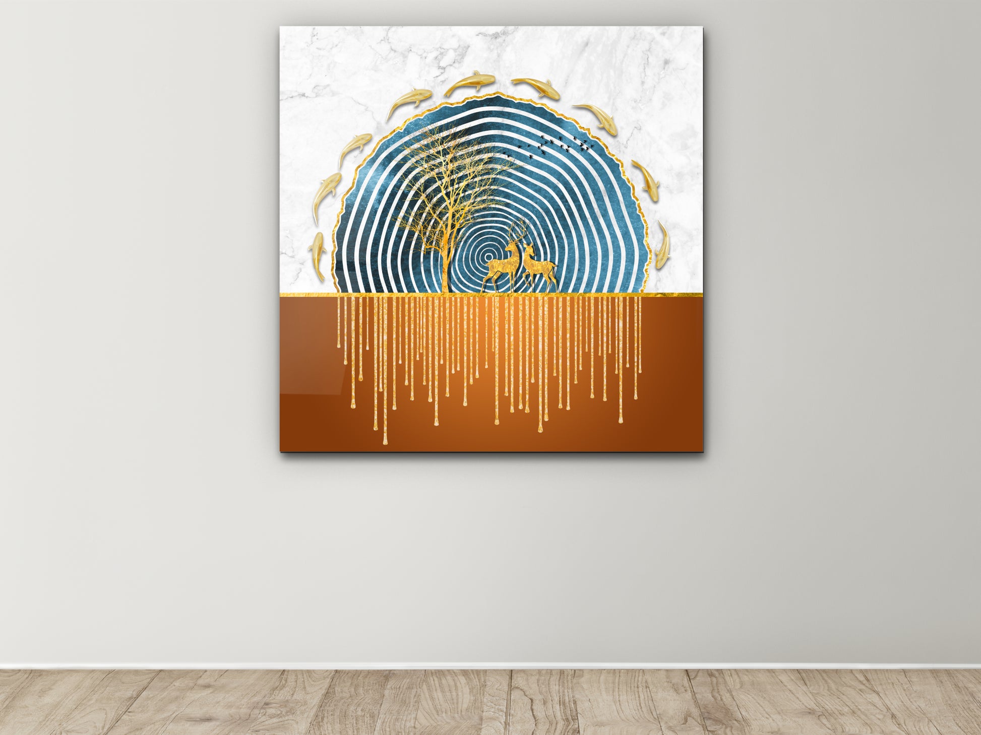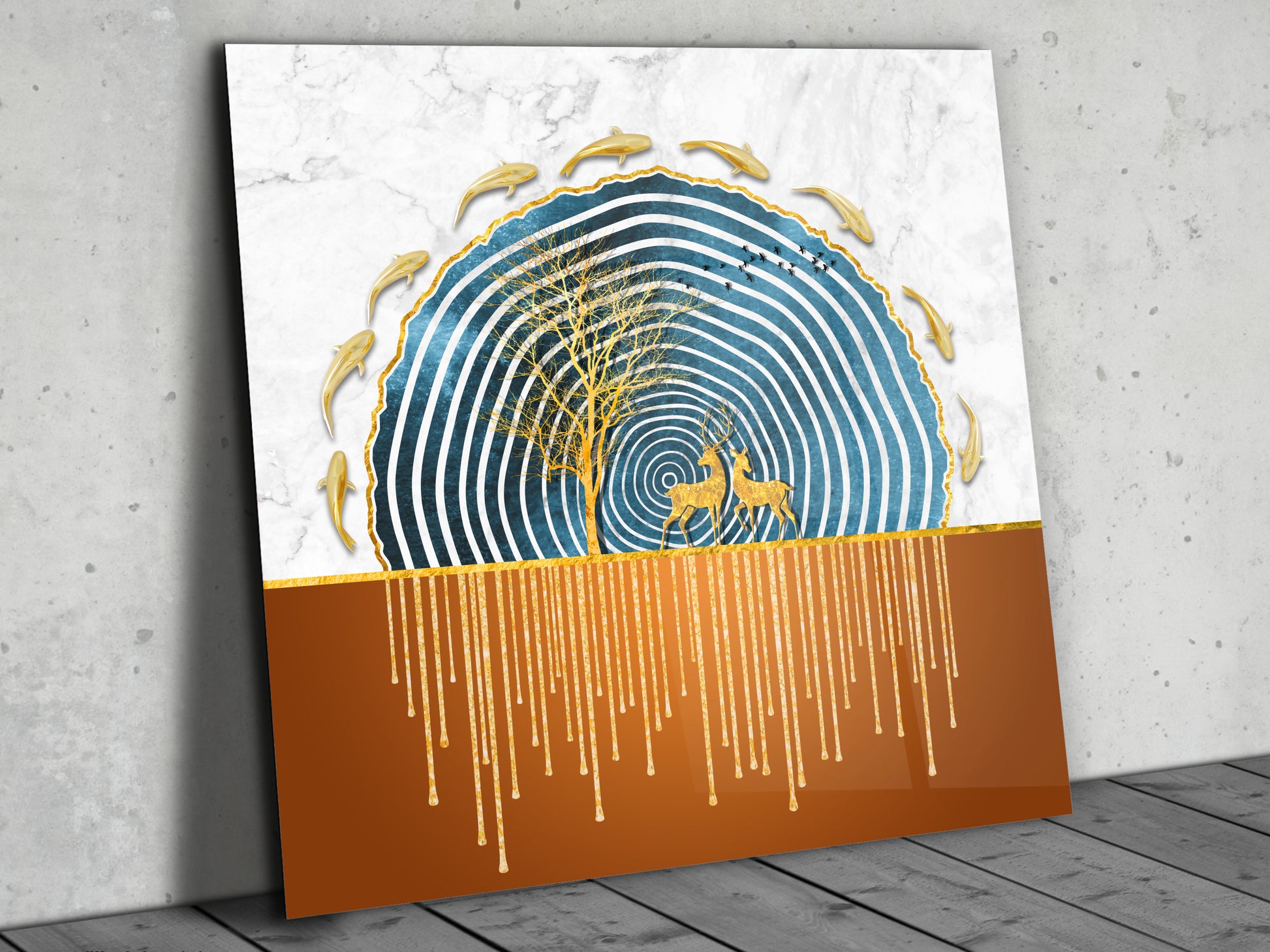 Gold Geyik ve Balık Desenli Soyut Cam Tablo – Modern Doğa Temalı Duvar Dekoru