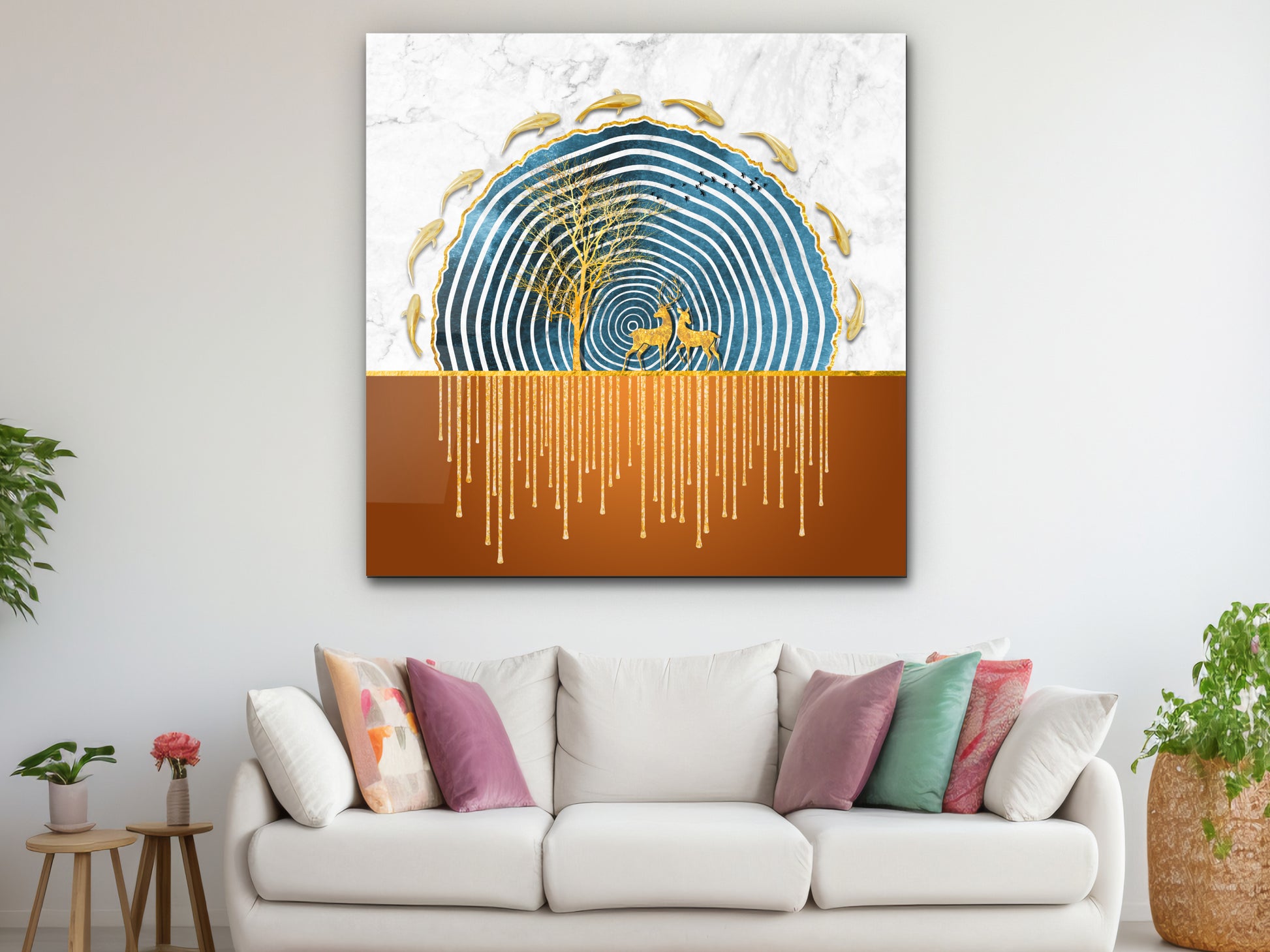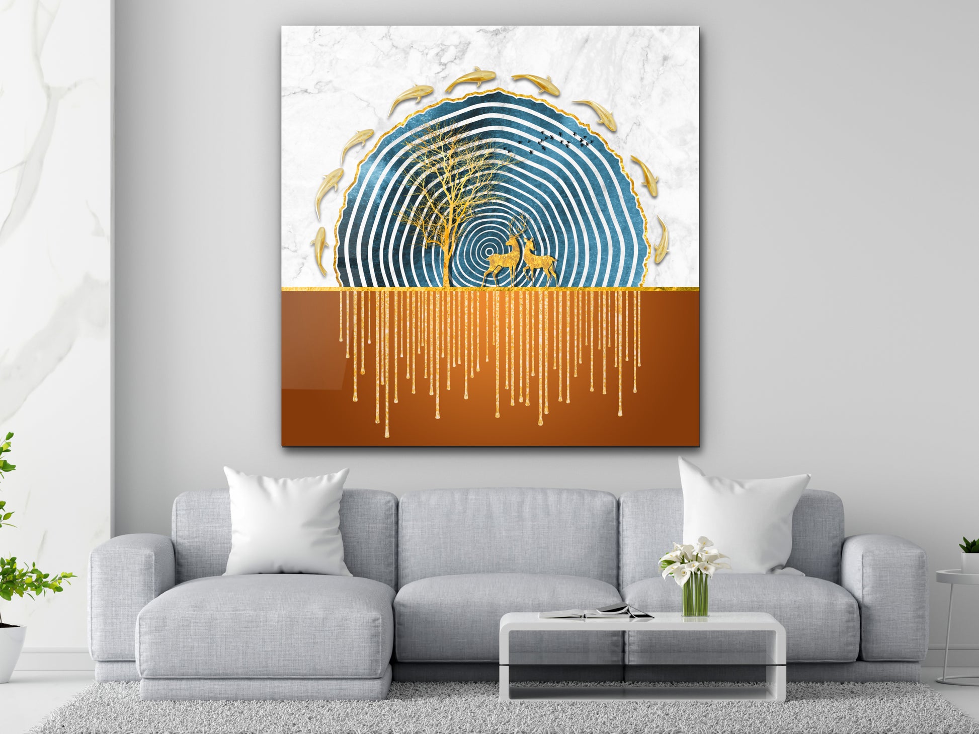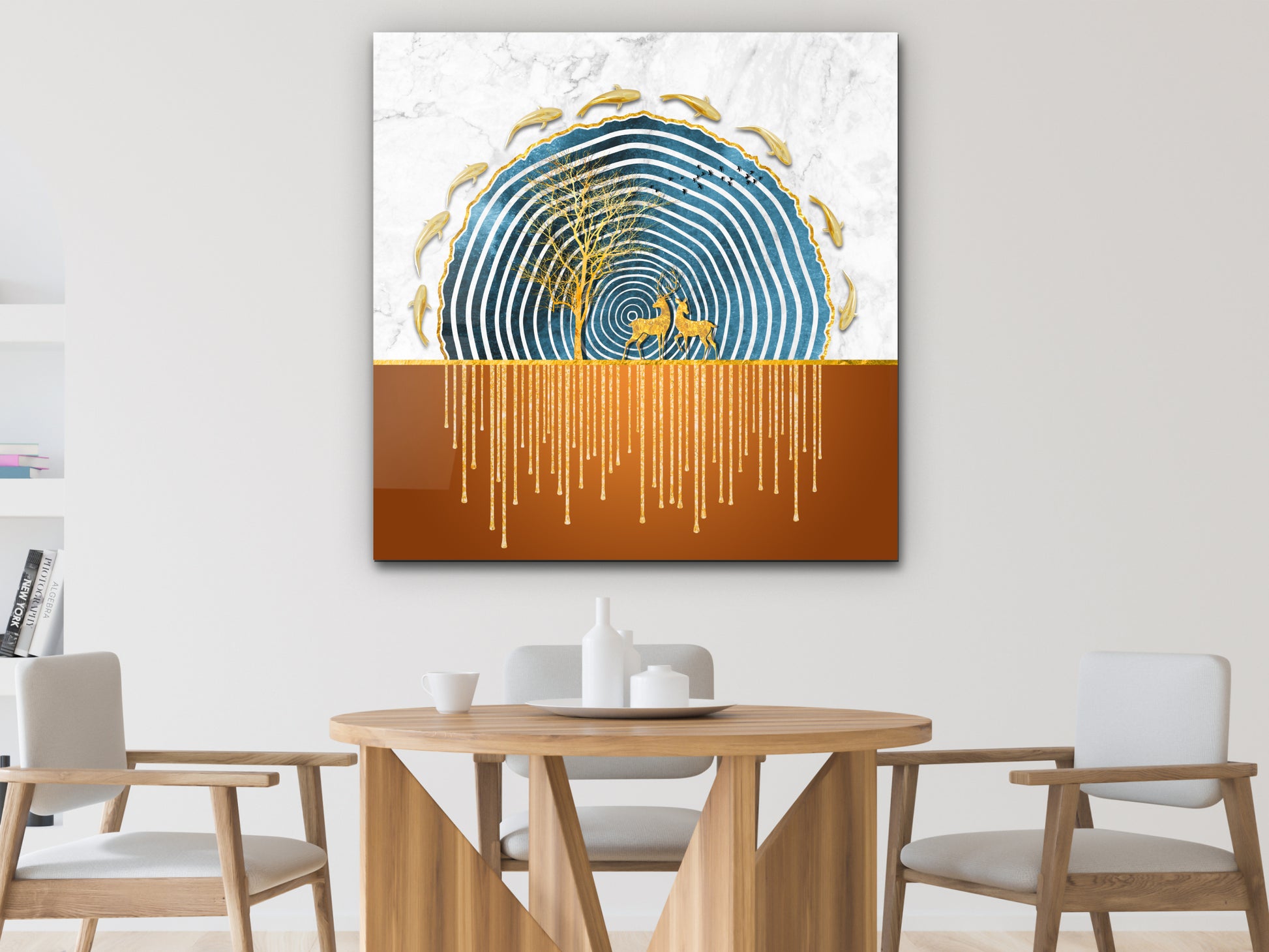 Gold Geyik ve Balık Desenli Soyut Cam Tablo – Modern Doğa Temalı Duvar Dekoru