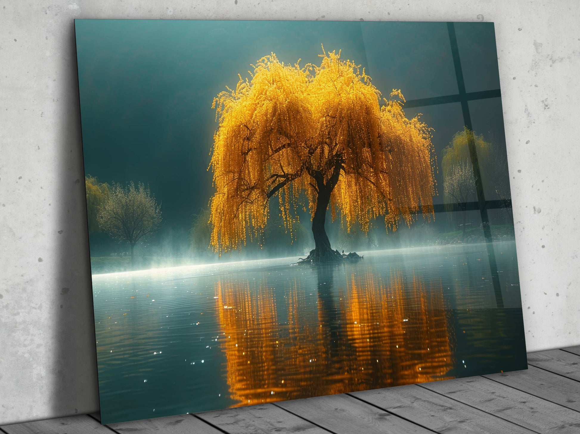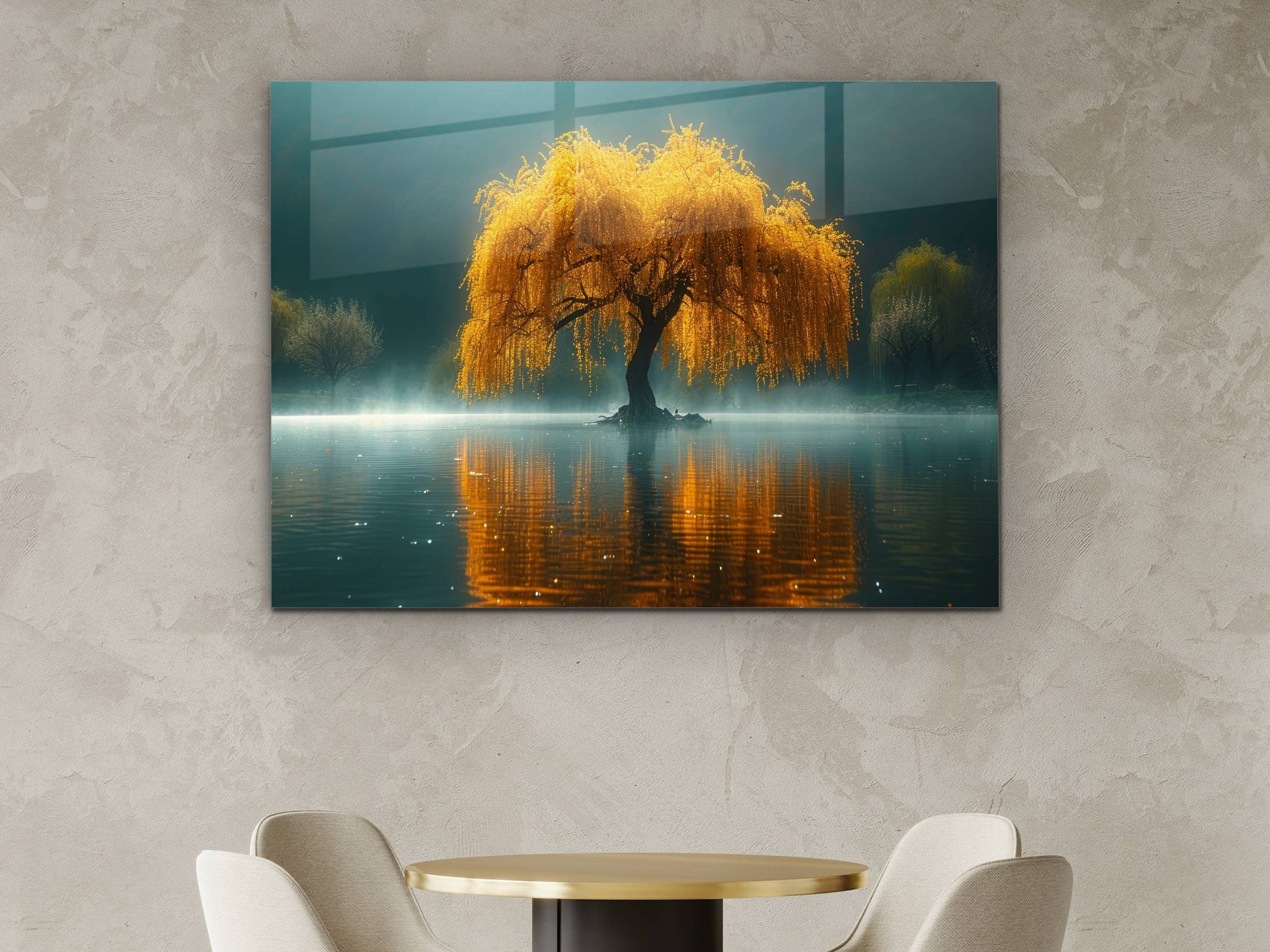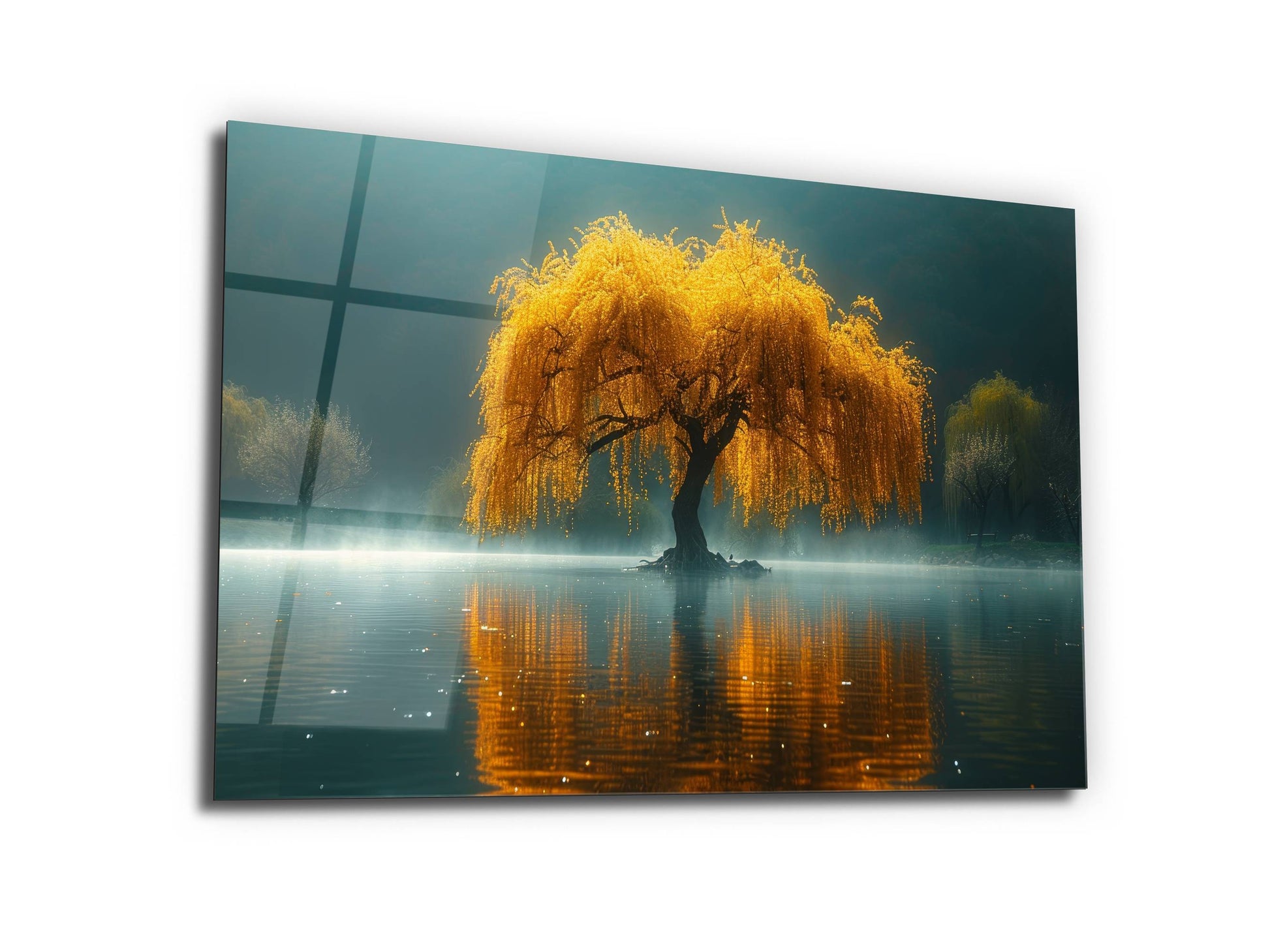 Gold Söğüt Ağacı ve Yansıması Duvar Dekoru – Doğal Minimalist Manzara Cam Tablo