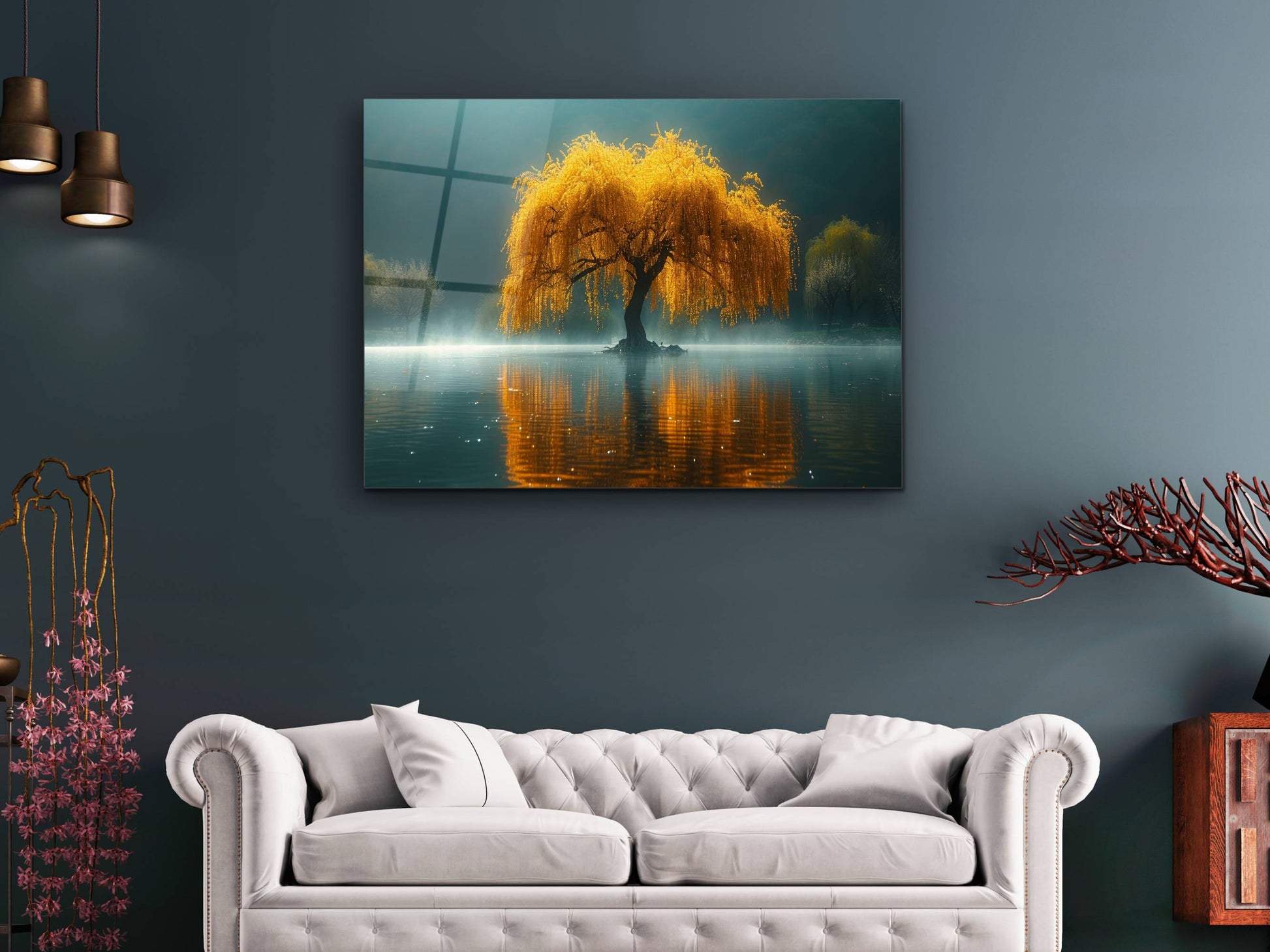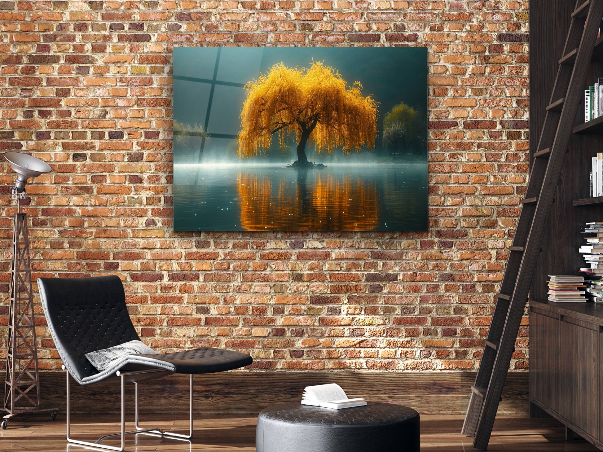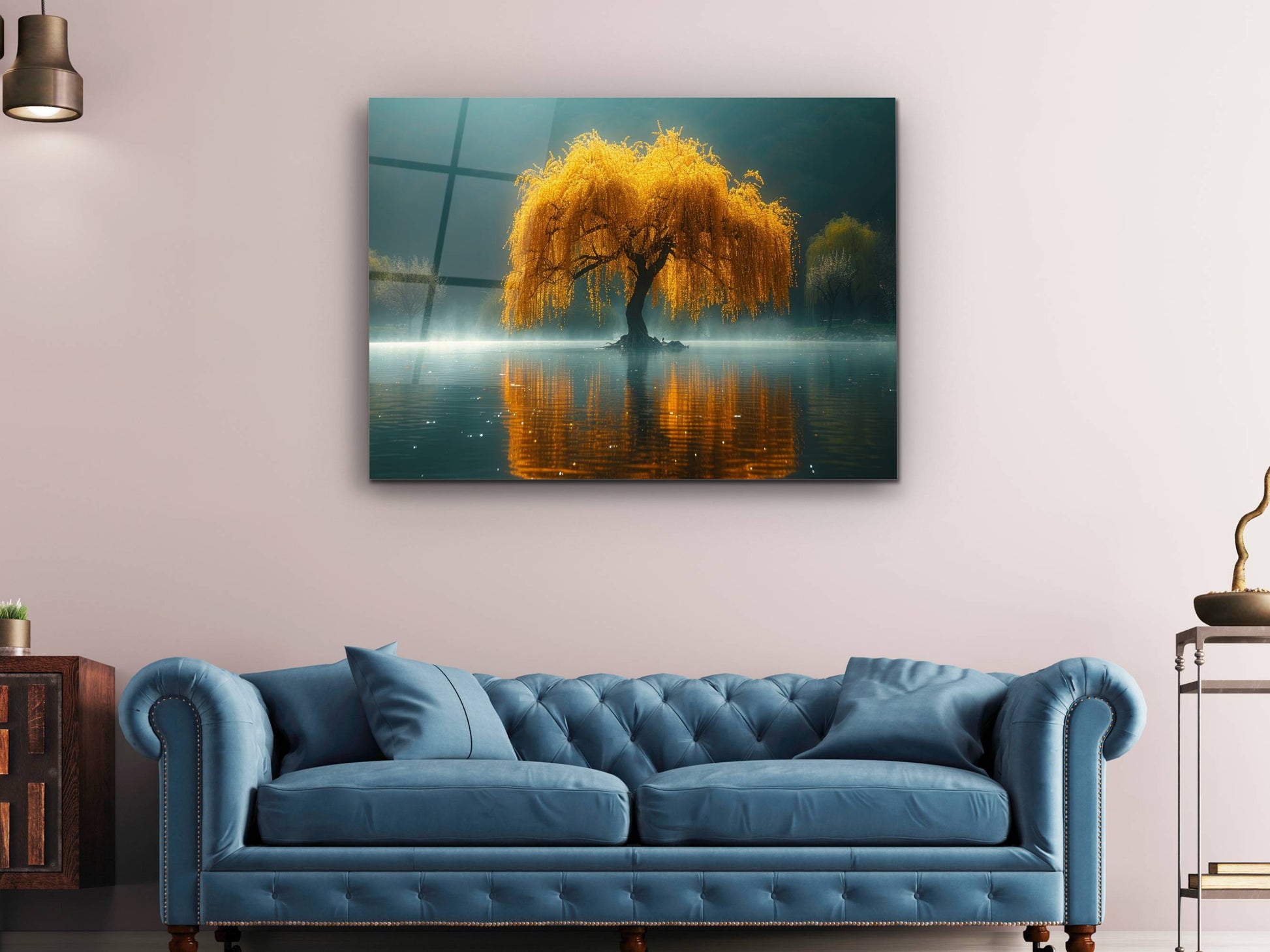 Gold Söğüt Ağacı ve Yansıması Duvar Dekoru – Doğal Minimalist Manzara Cam Tablo