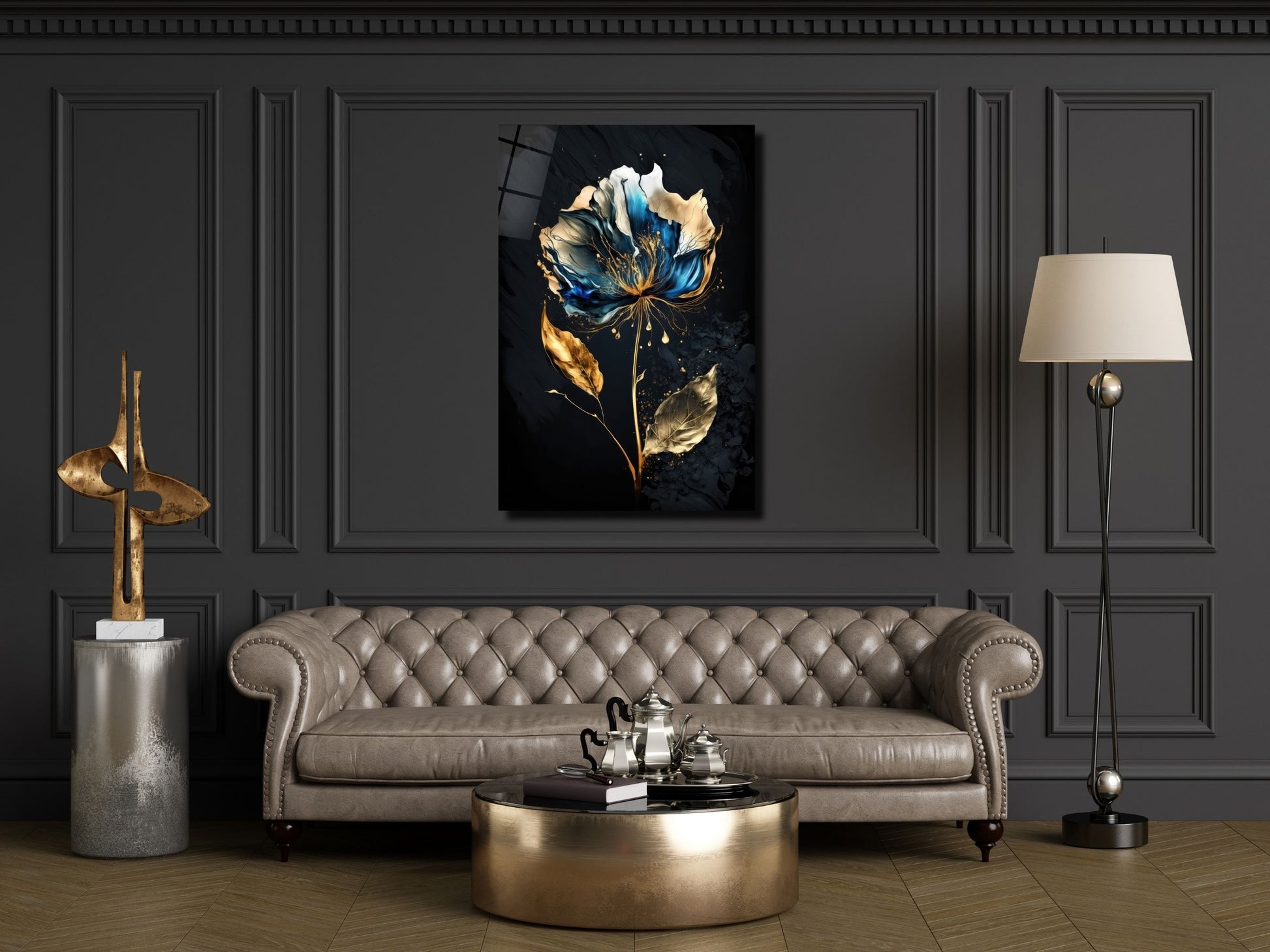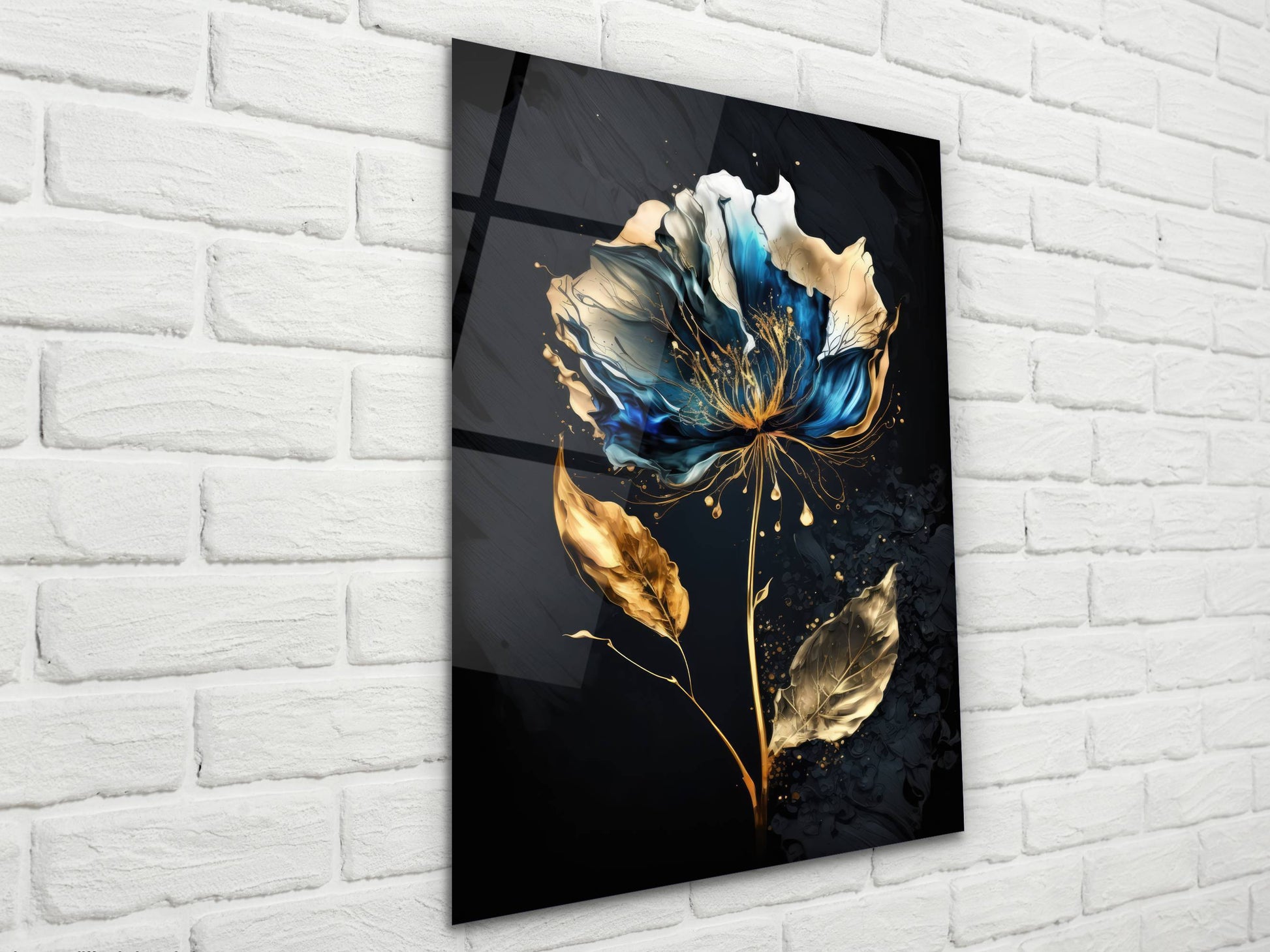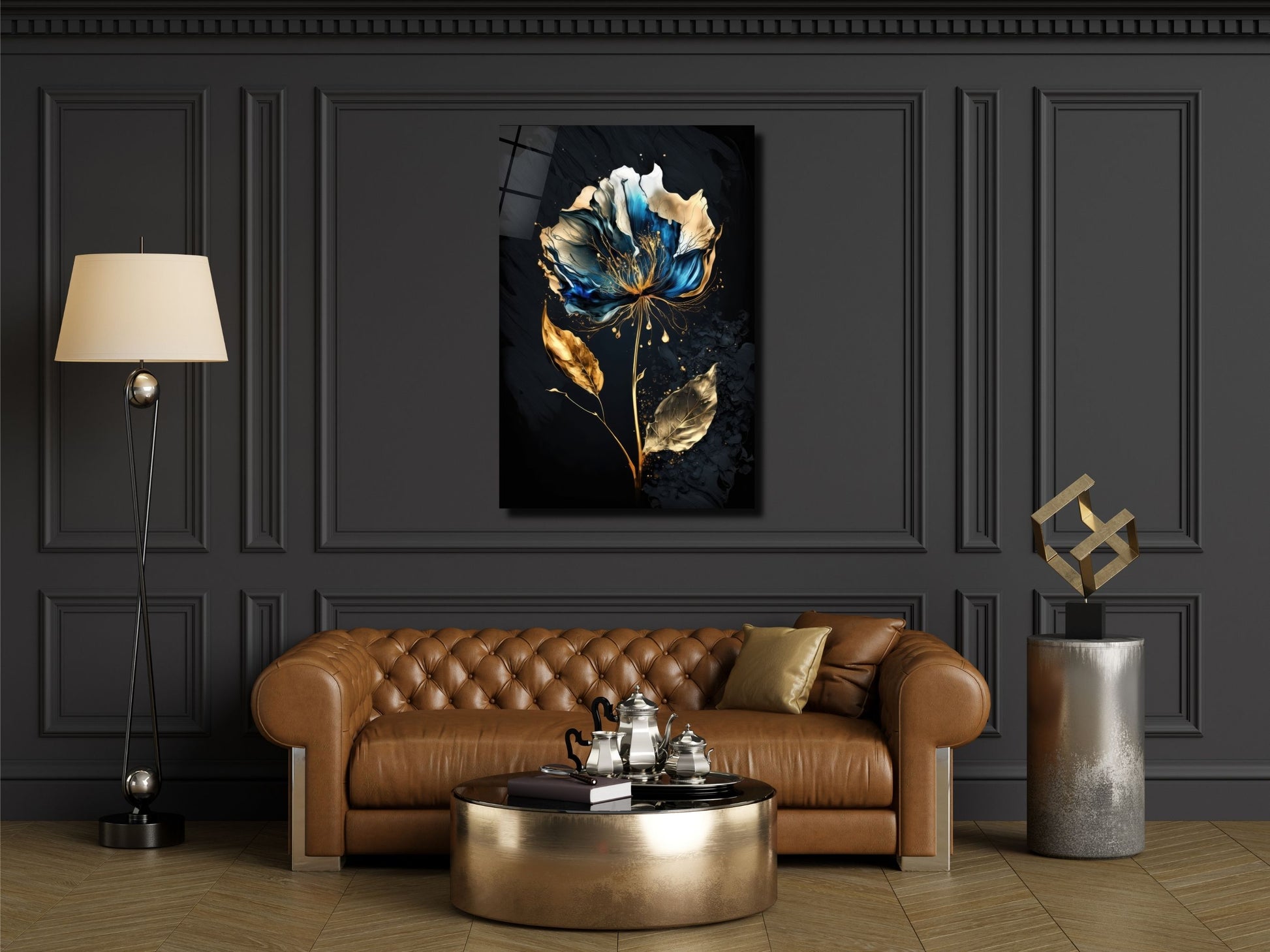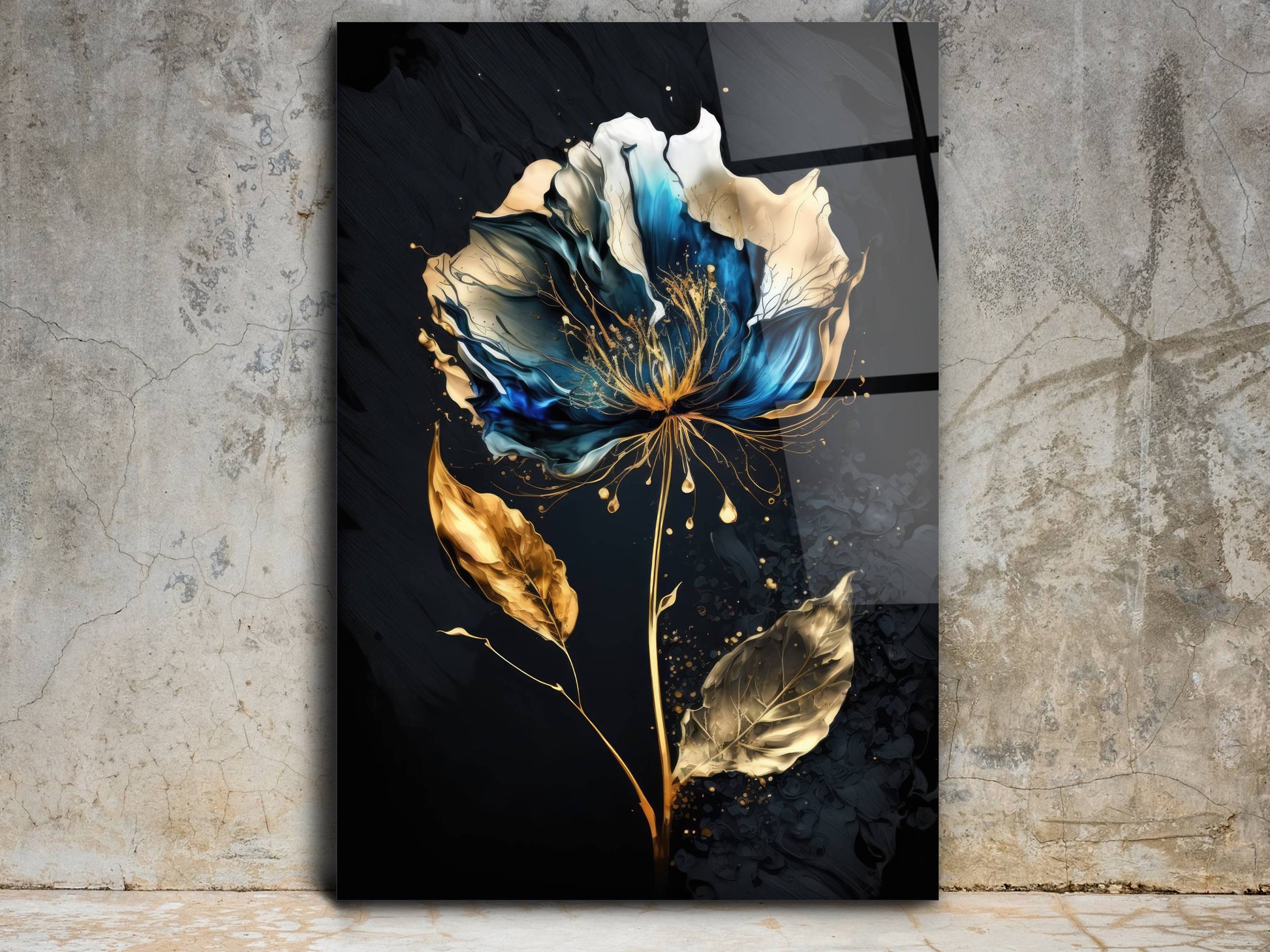 Gold ve Mavi Soyut Çiçek Cam Tablo - Dekoratif Duvar Tablosu