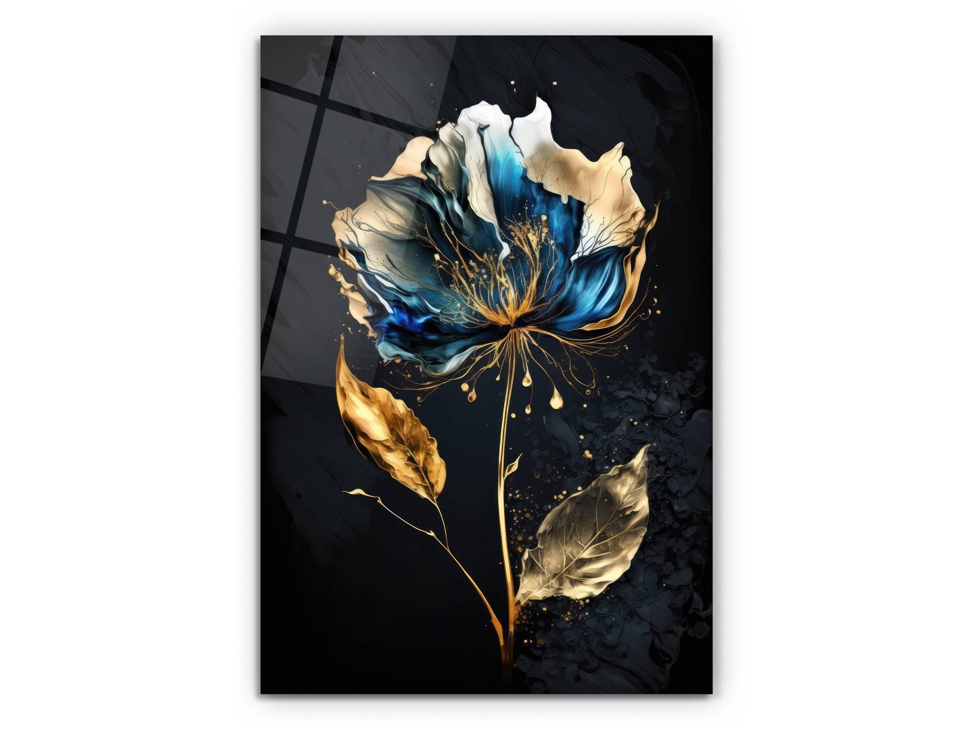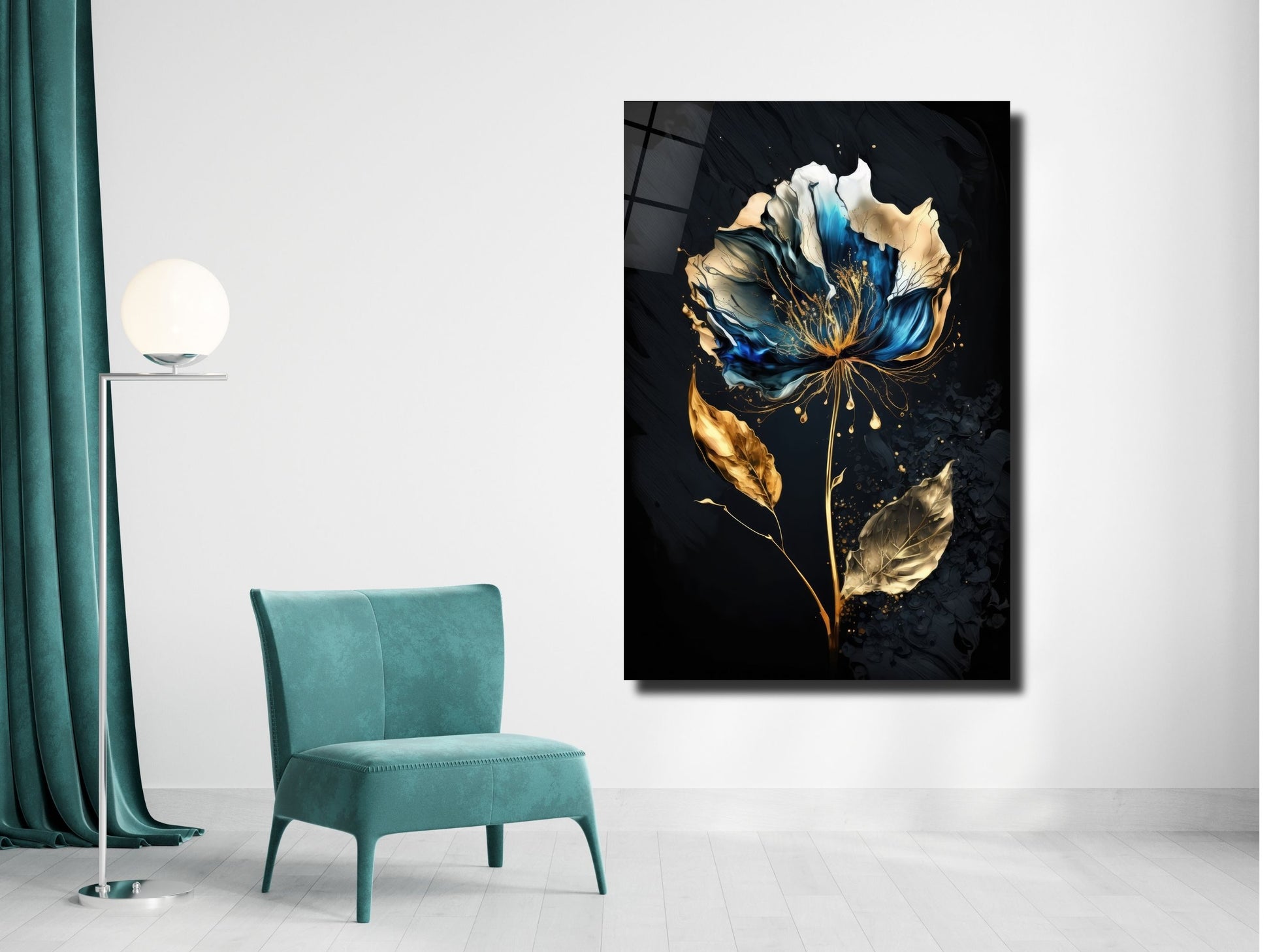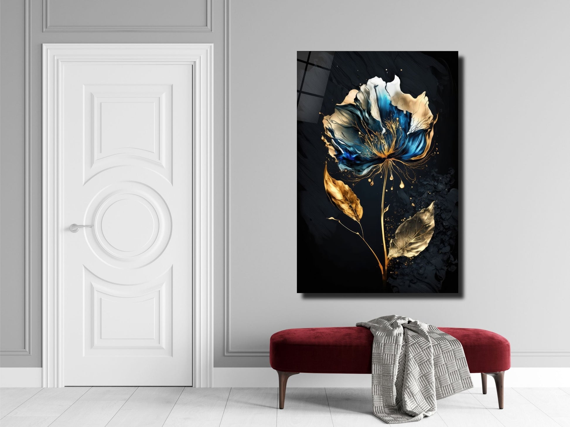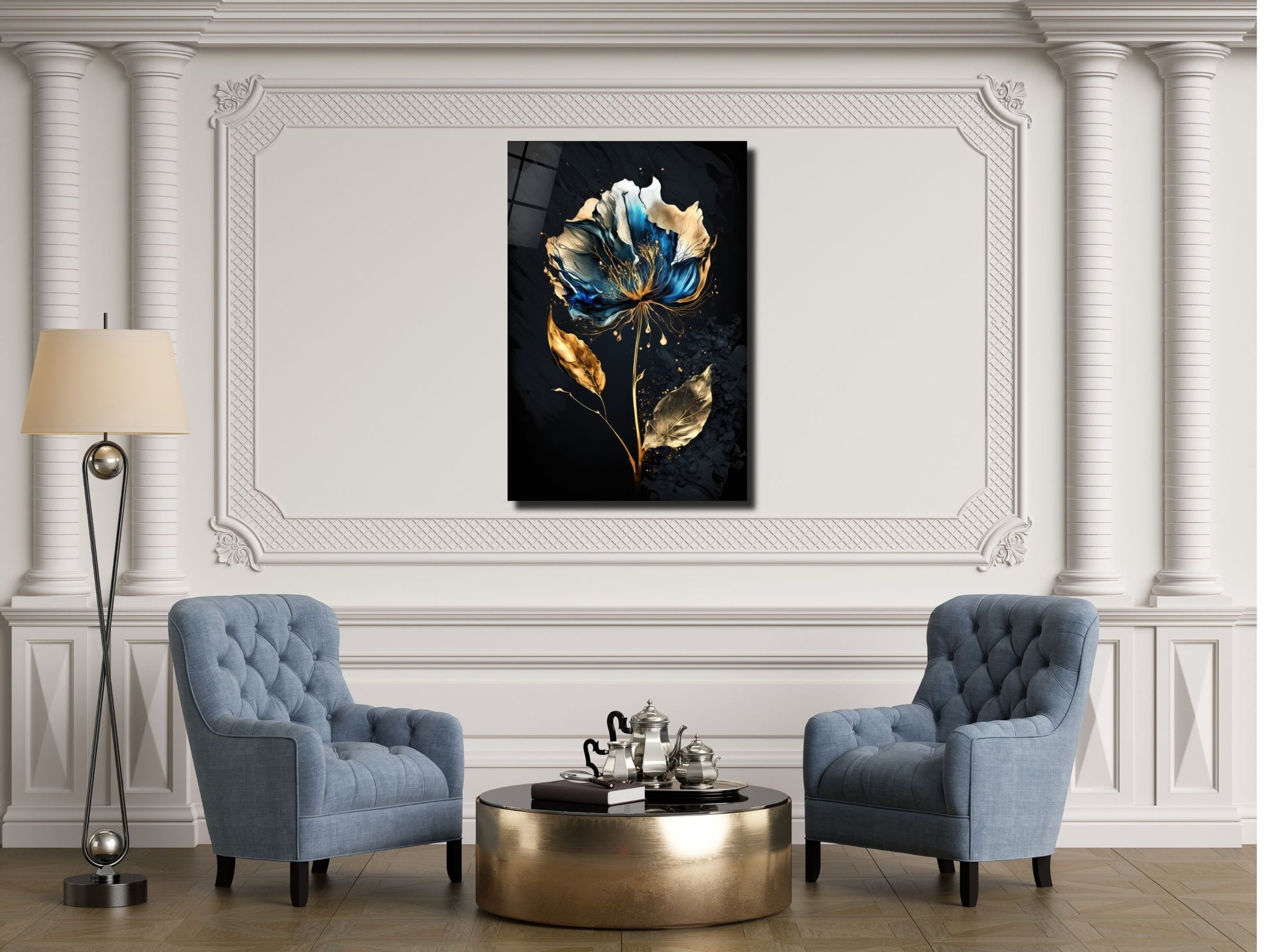 Gold ve Mavi Soyut Çiçek Cam Tablo - Dekoratif Duvar Tablosu