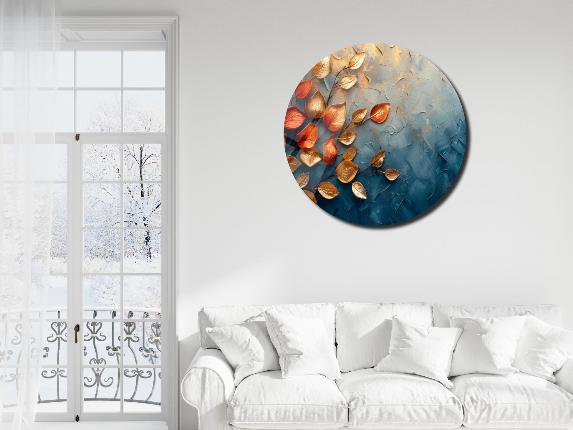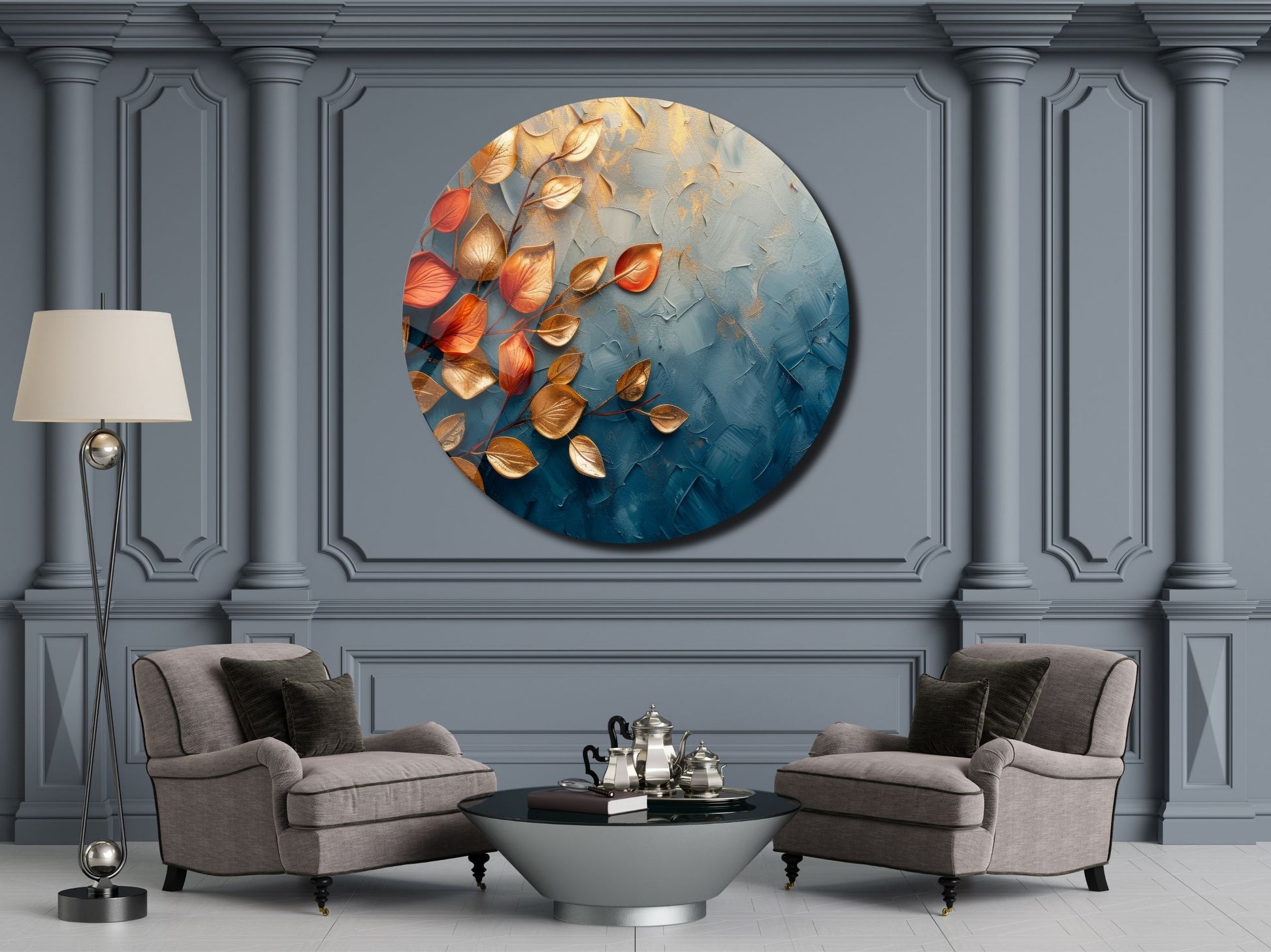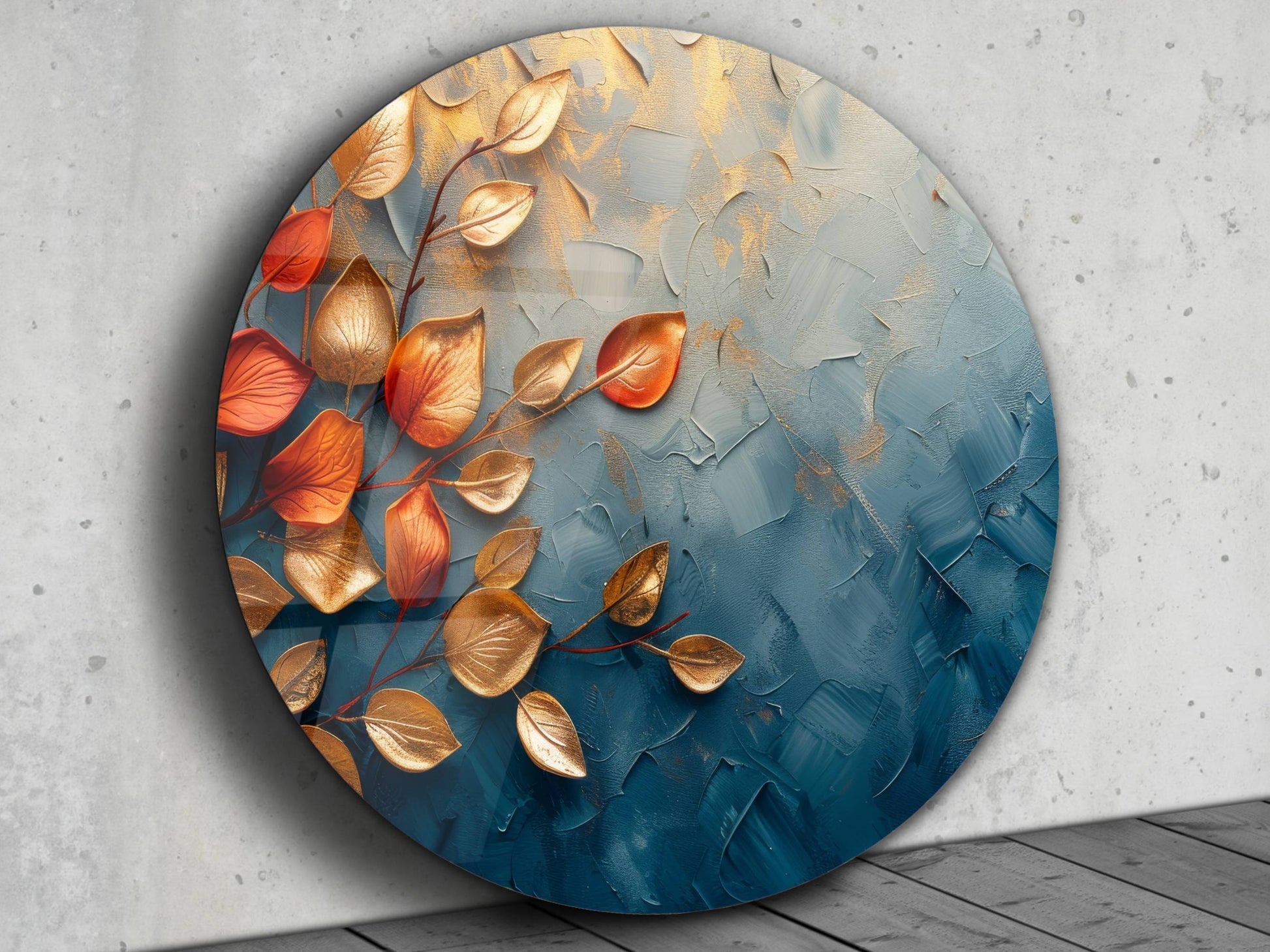 Gold ve Turuncu Yapraklı Yuvarlak Cam Tablo - Ev ve Ofis Duvar Dekorasyonu