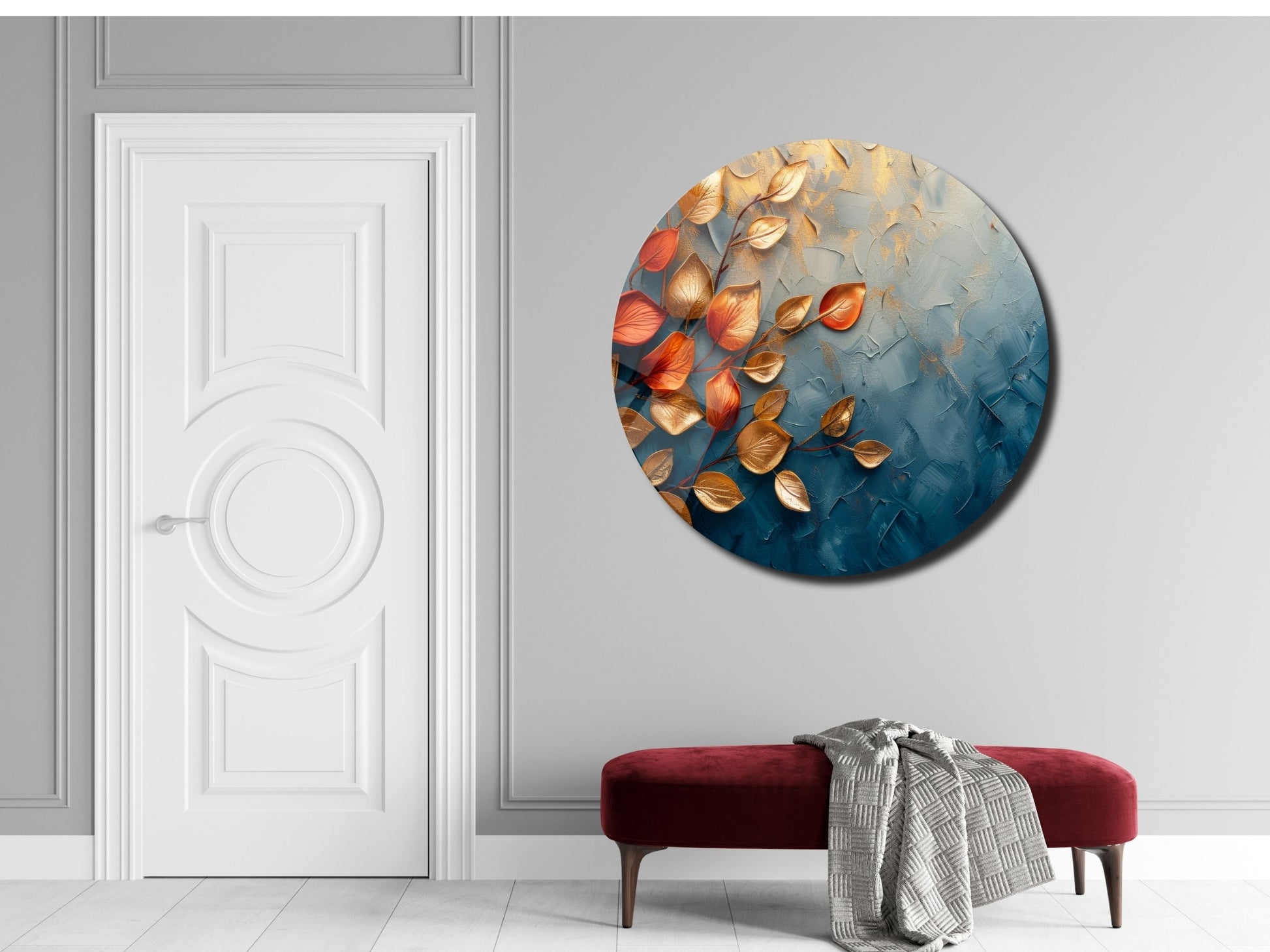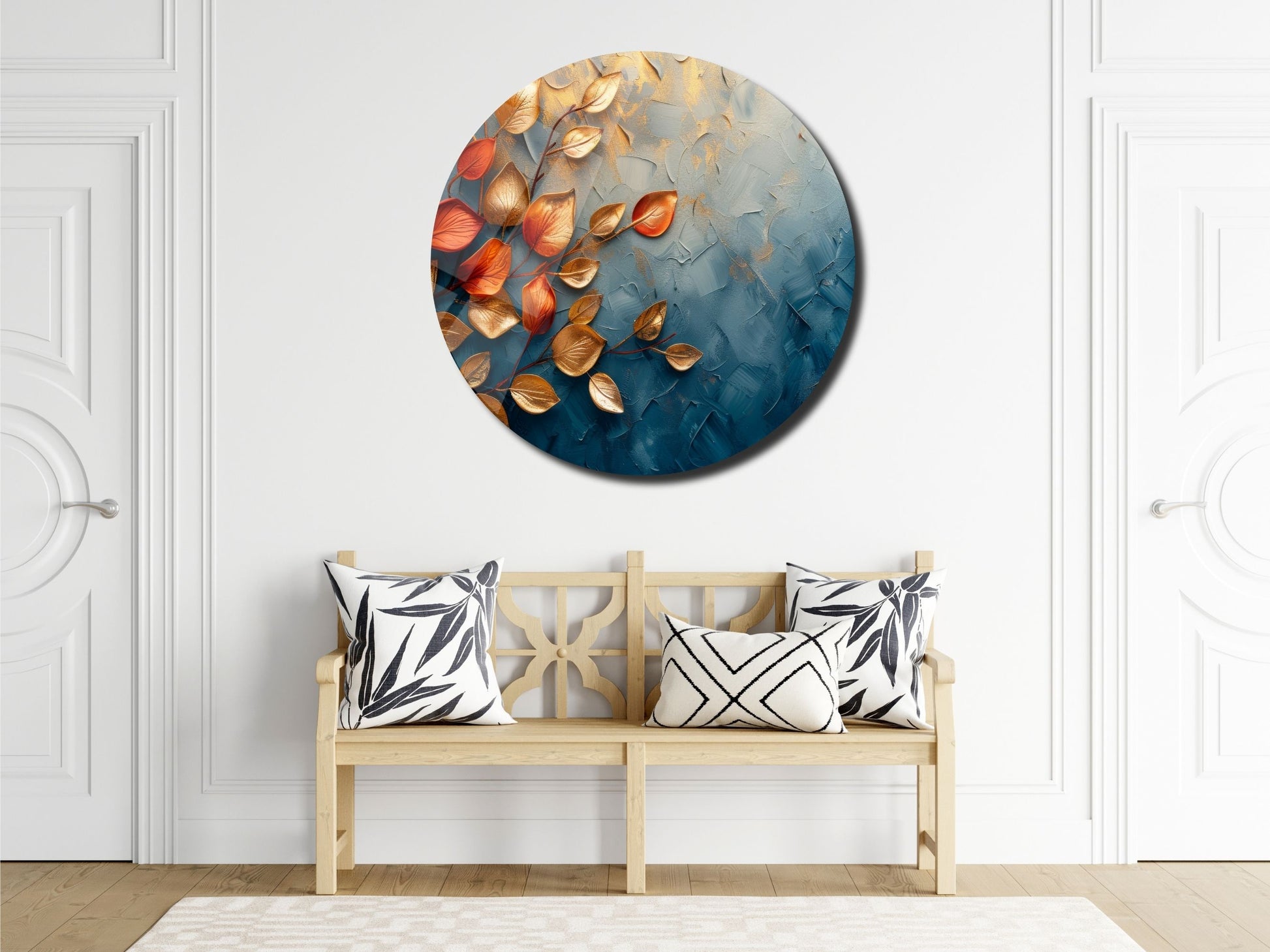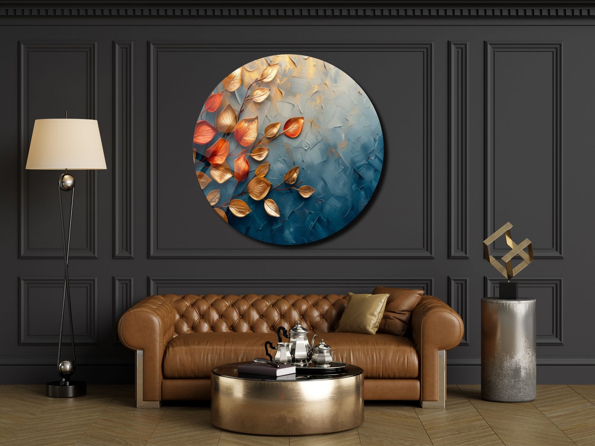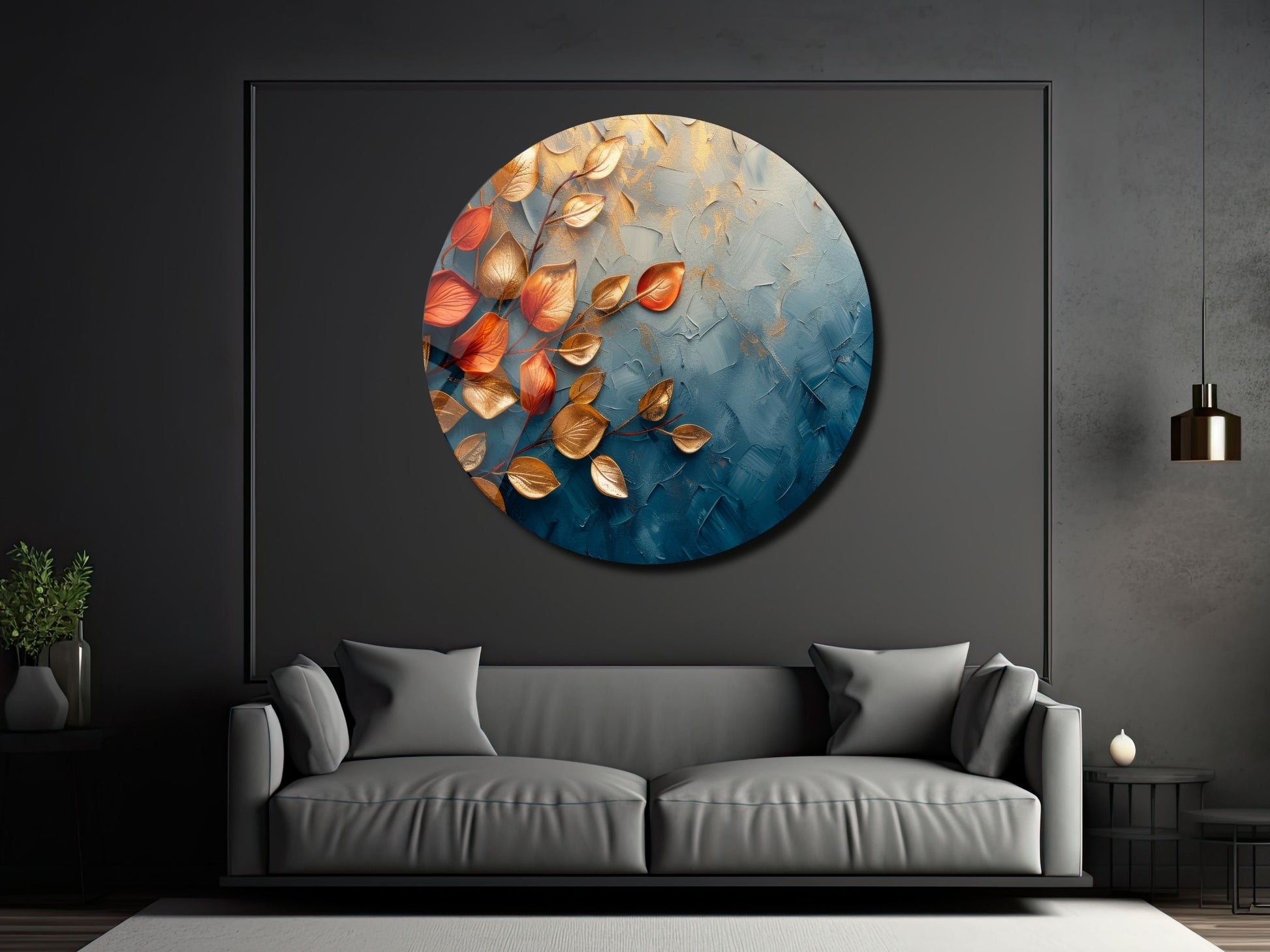 Gold ve Turuncu Yapraklı Yuvarlak Cam Tablo - Ev ve Ofis Duvar Dekorasyonu