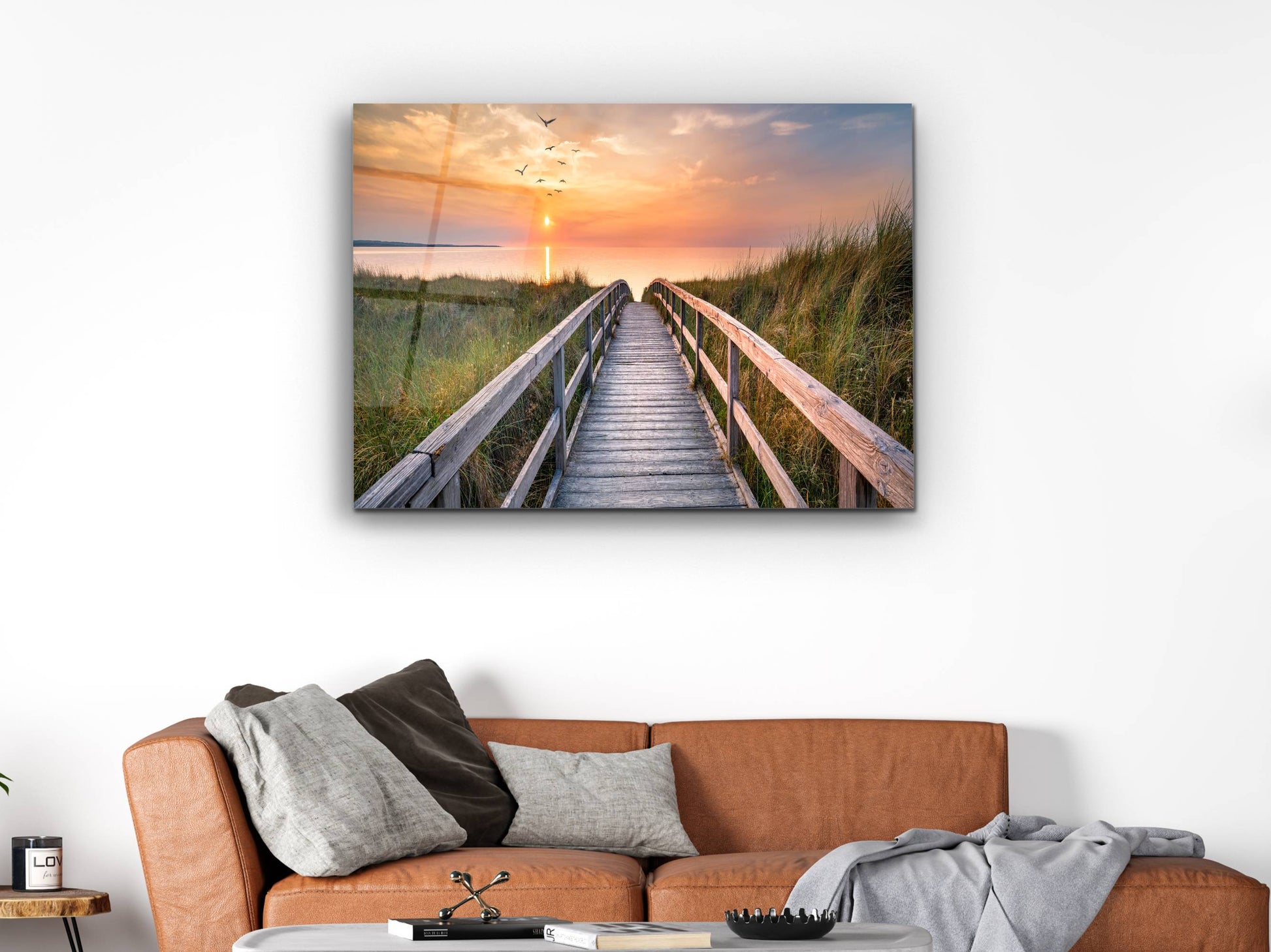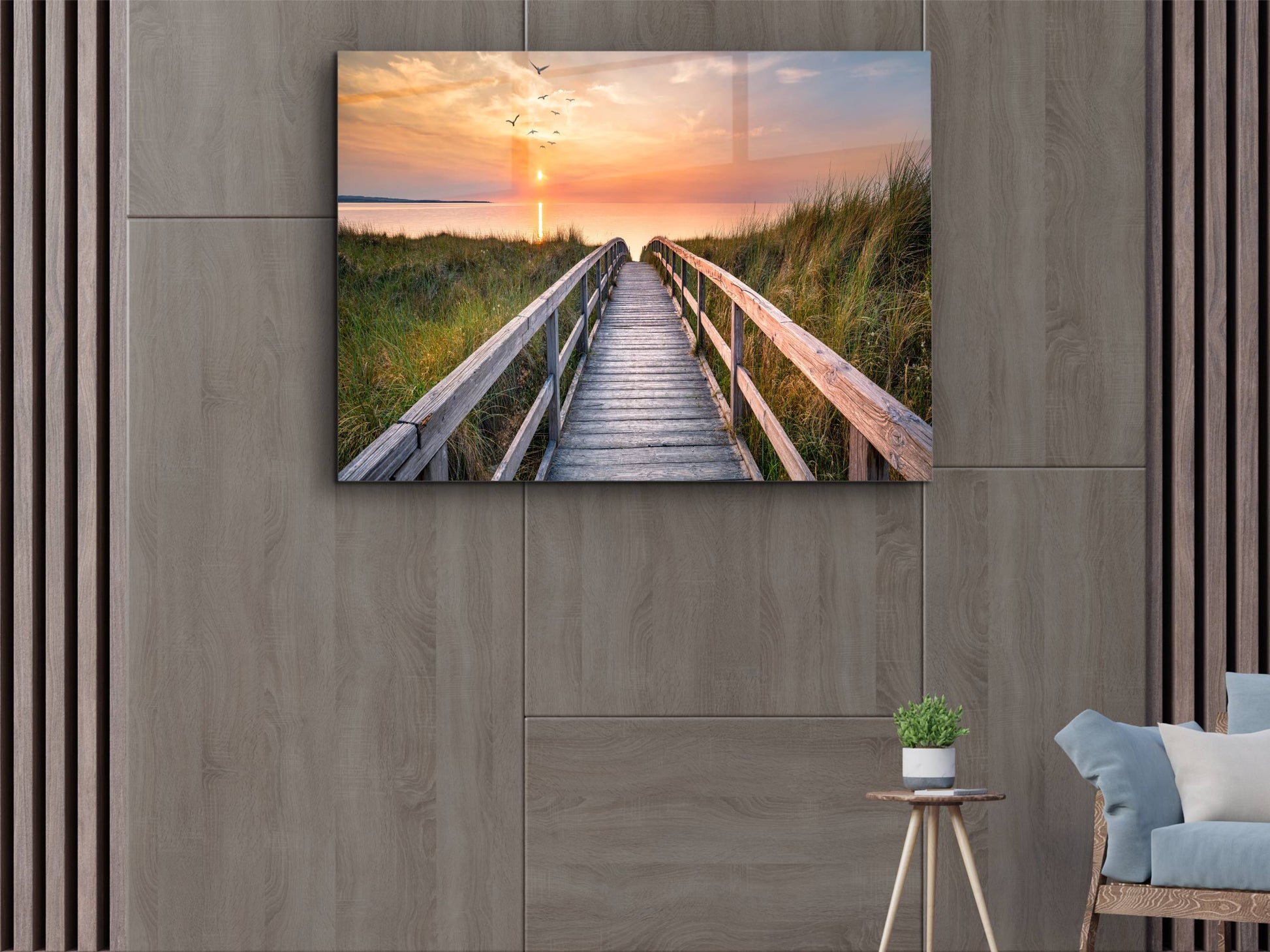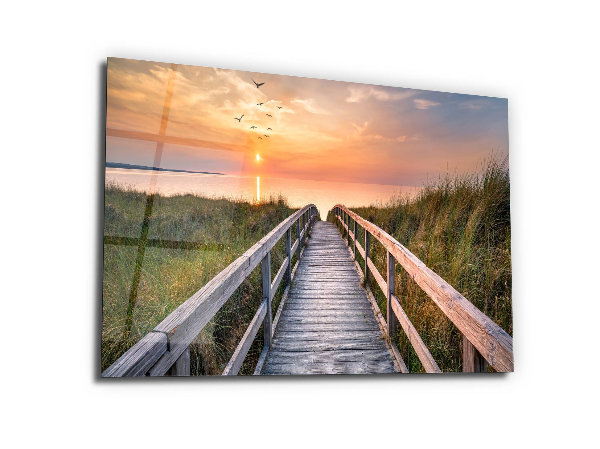 Gün Batımı Tahta Yol Manzarası Cam Tablo – Doğa Temalı Modern Duvar Tablosu