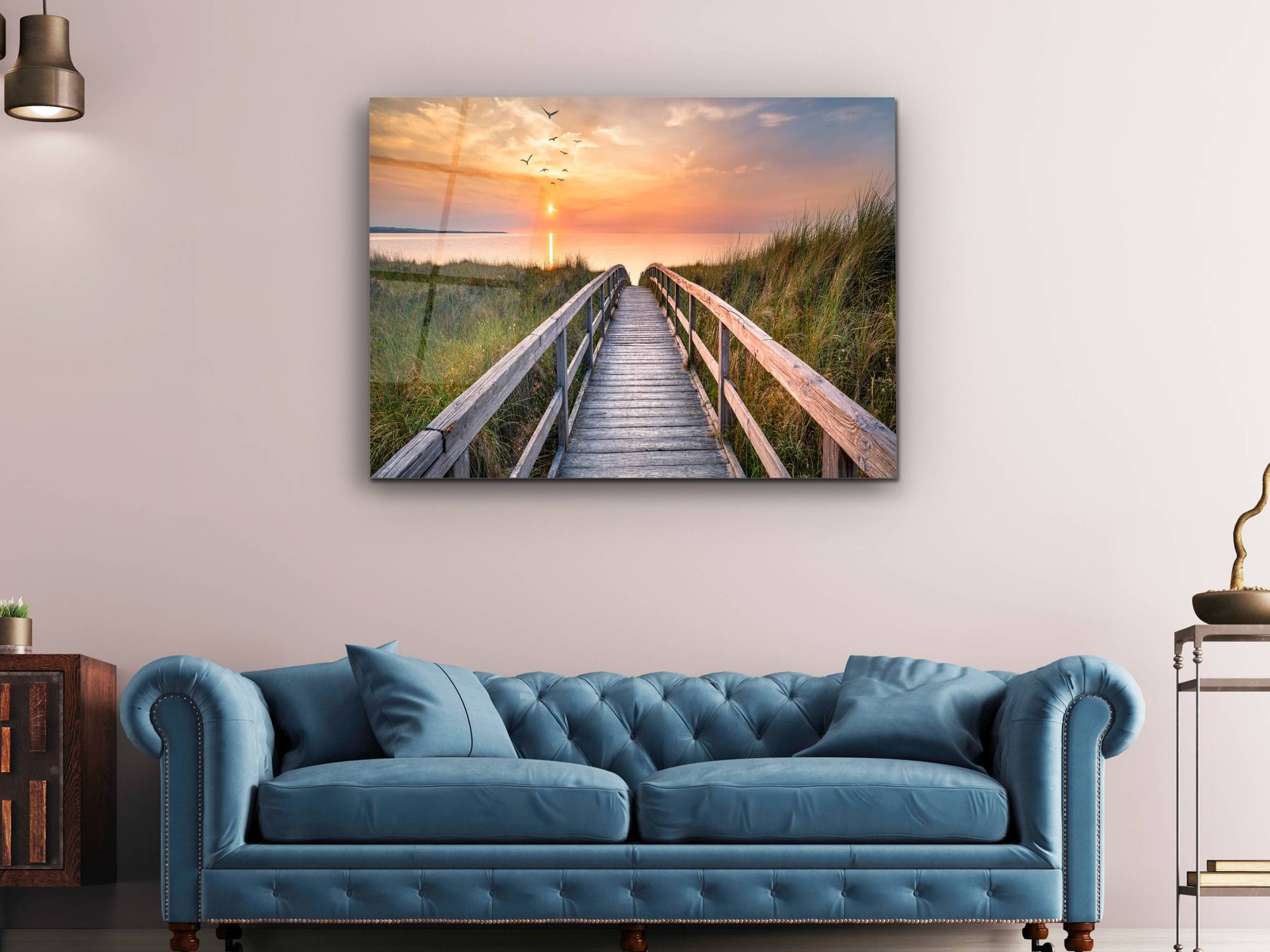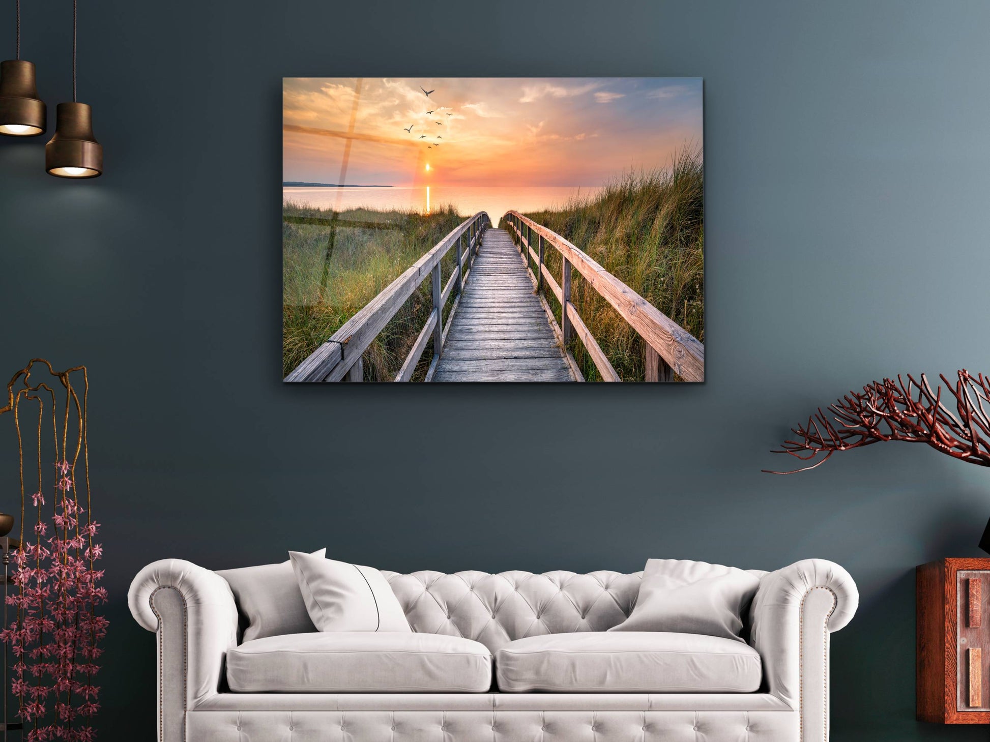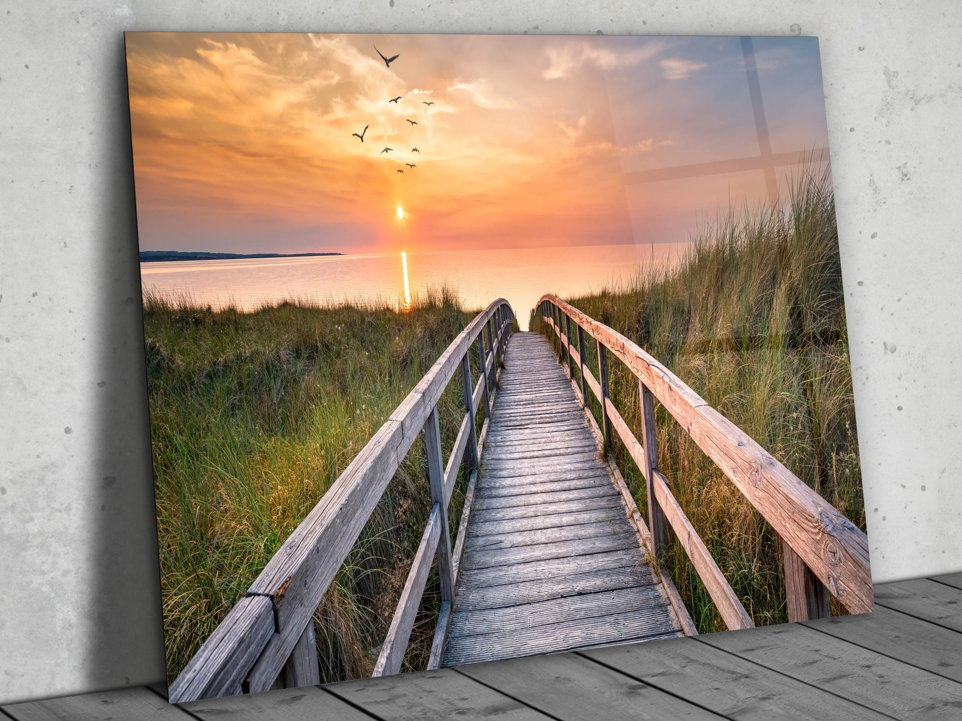 Gün Batımı Tahta Yol Manzarası Cam Tablo – Doğa Temalı Modern Duvar Tablosu