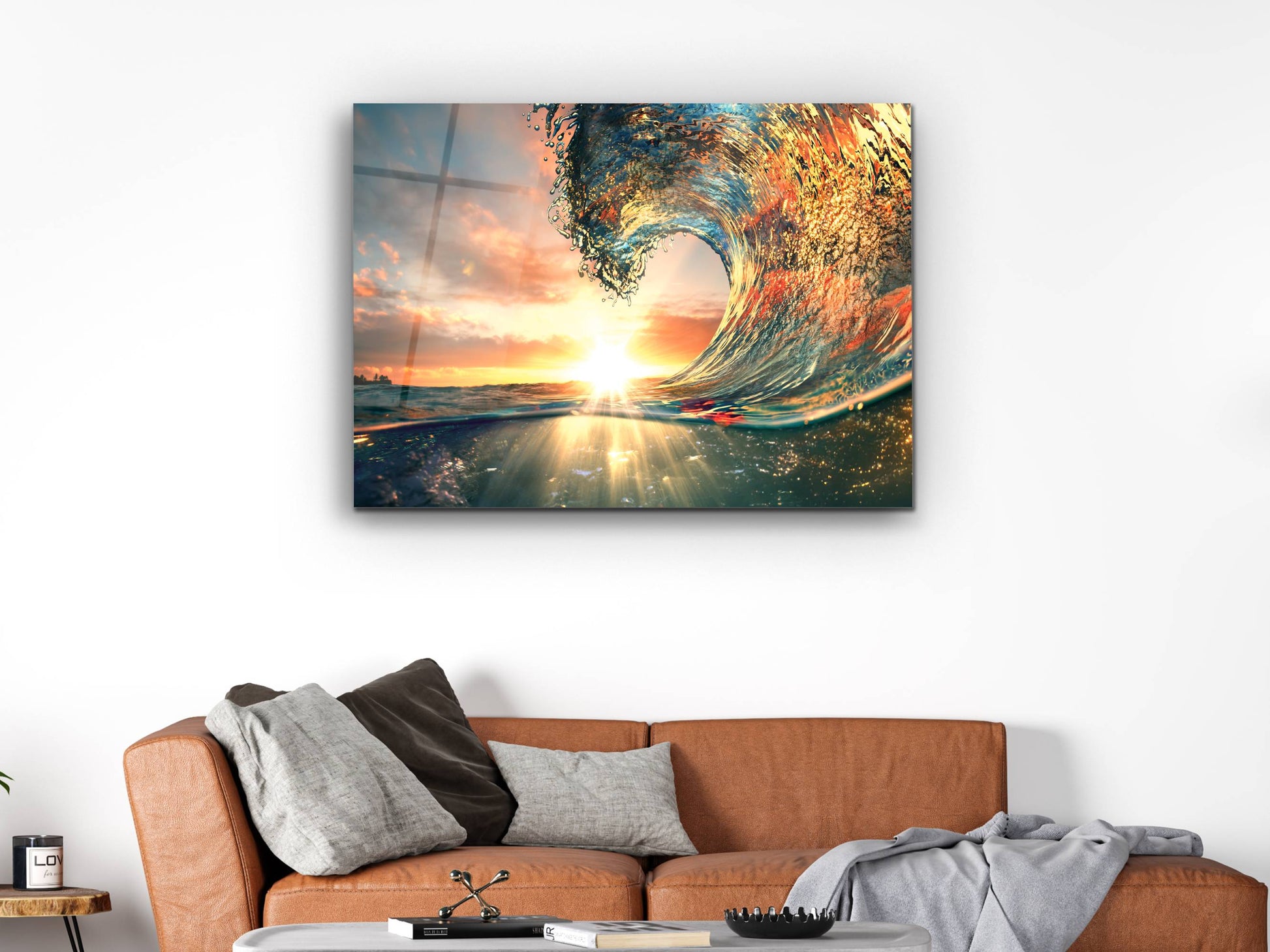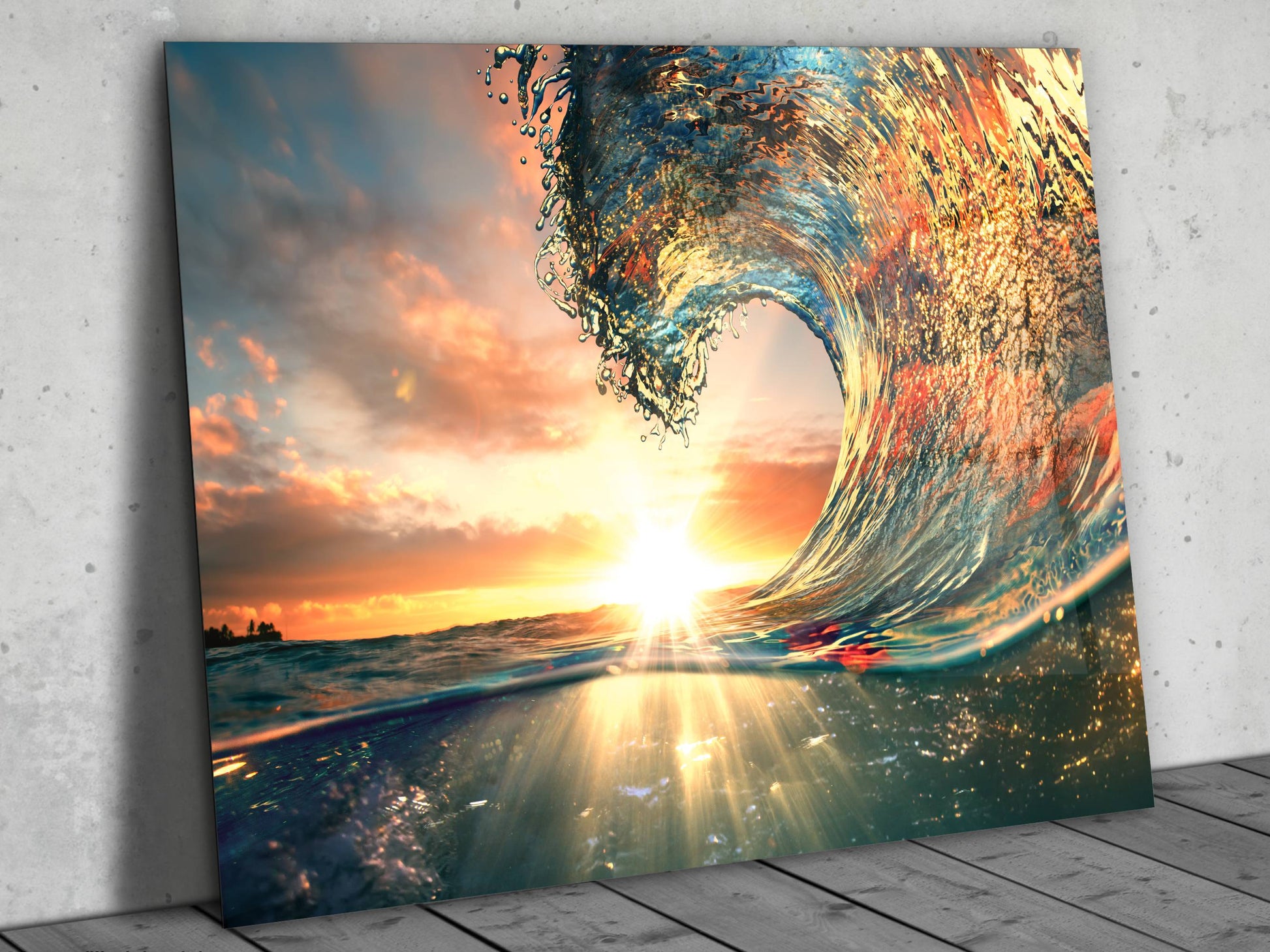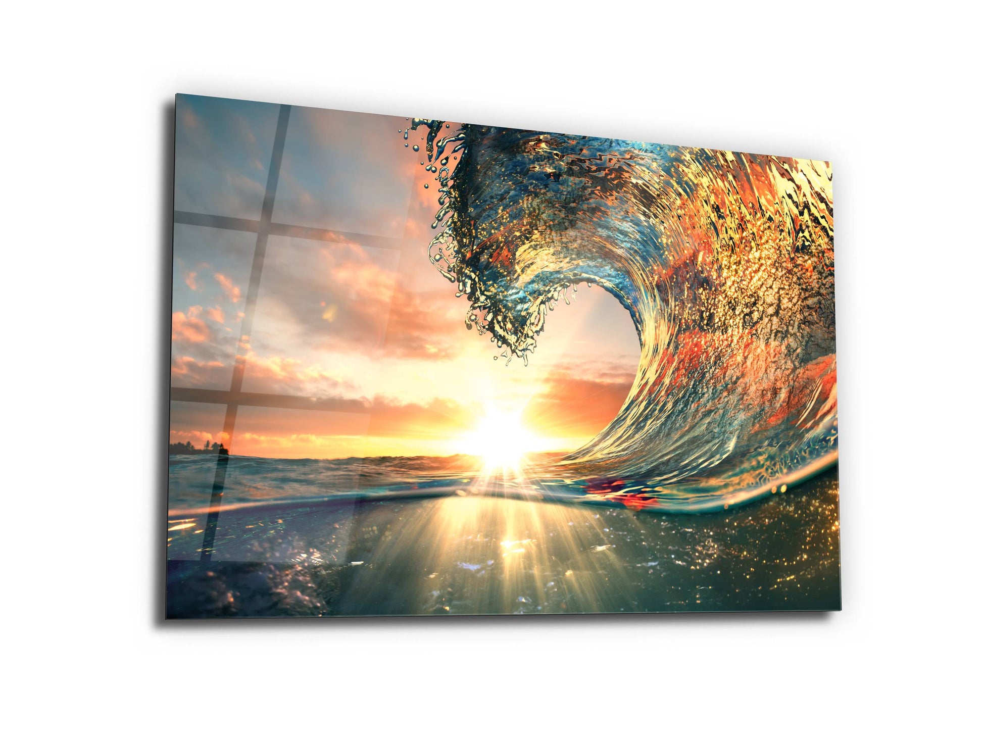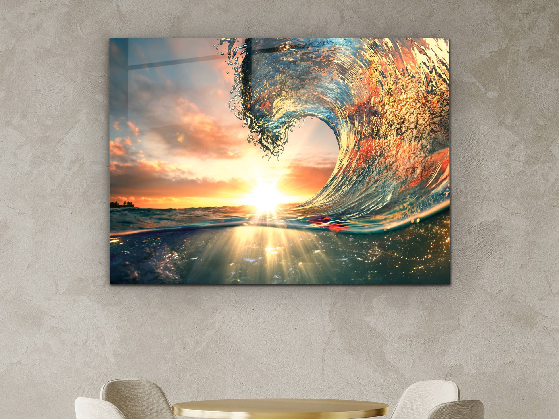 Gün Batımı ve Dalga Cam Duvar Tablosu – Manzara Temalı Dekoratif Ev ve Ofis Tablosu