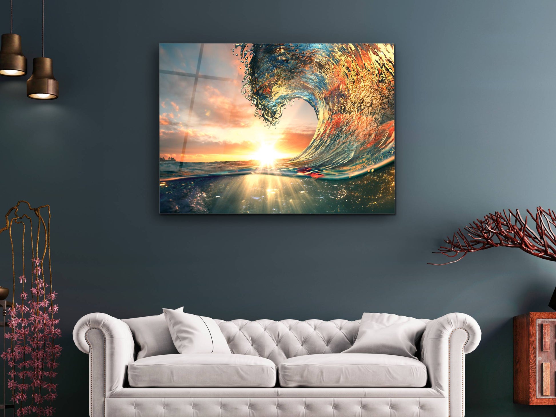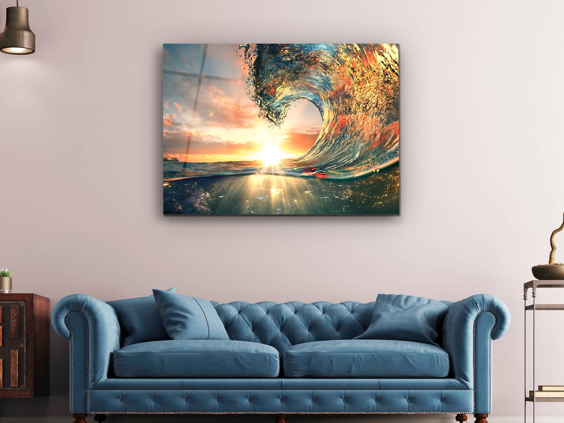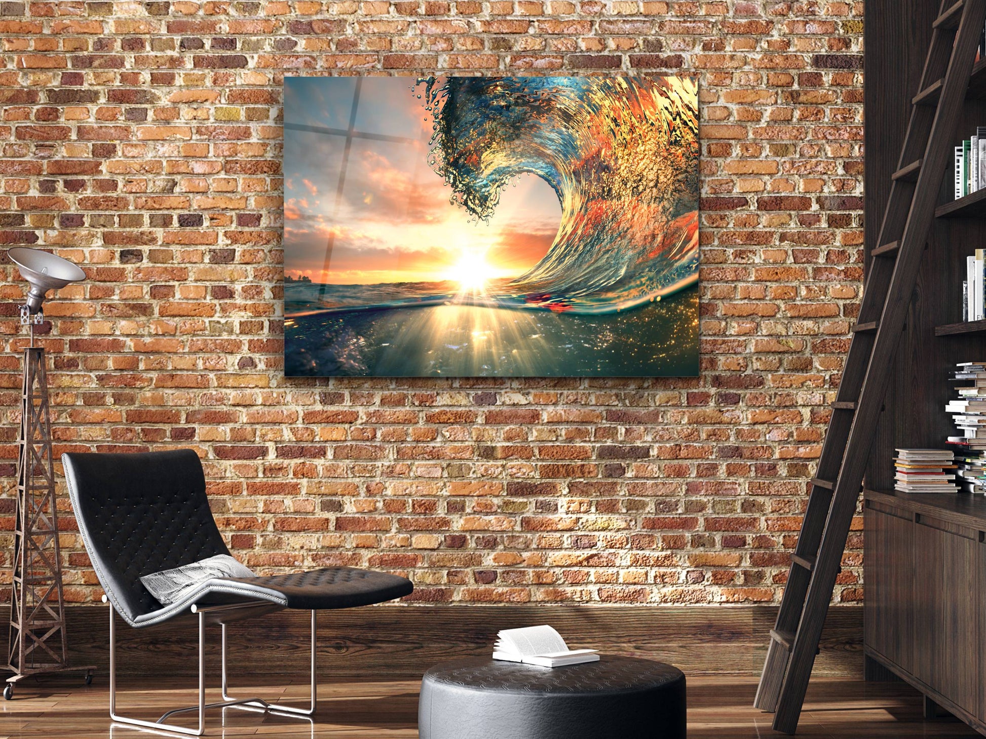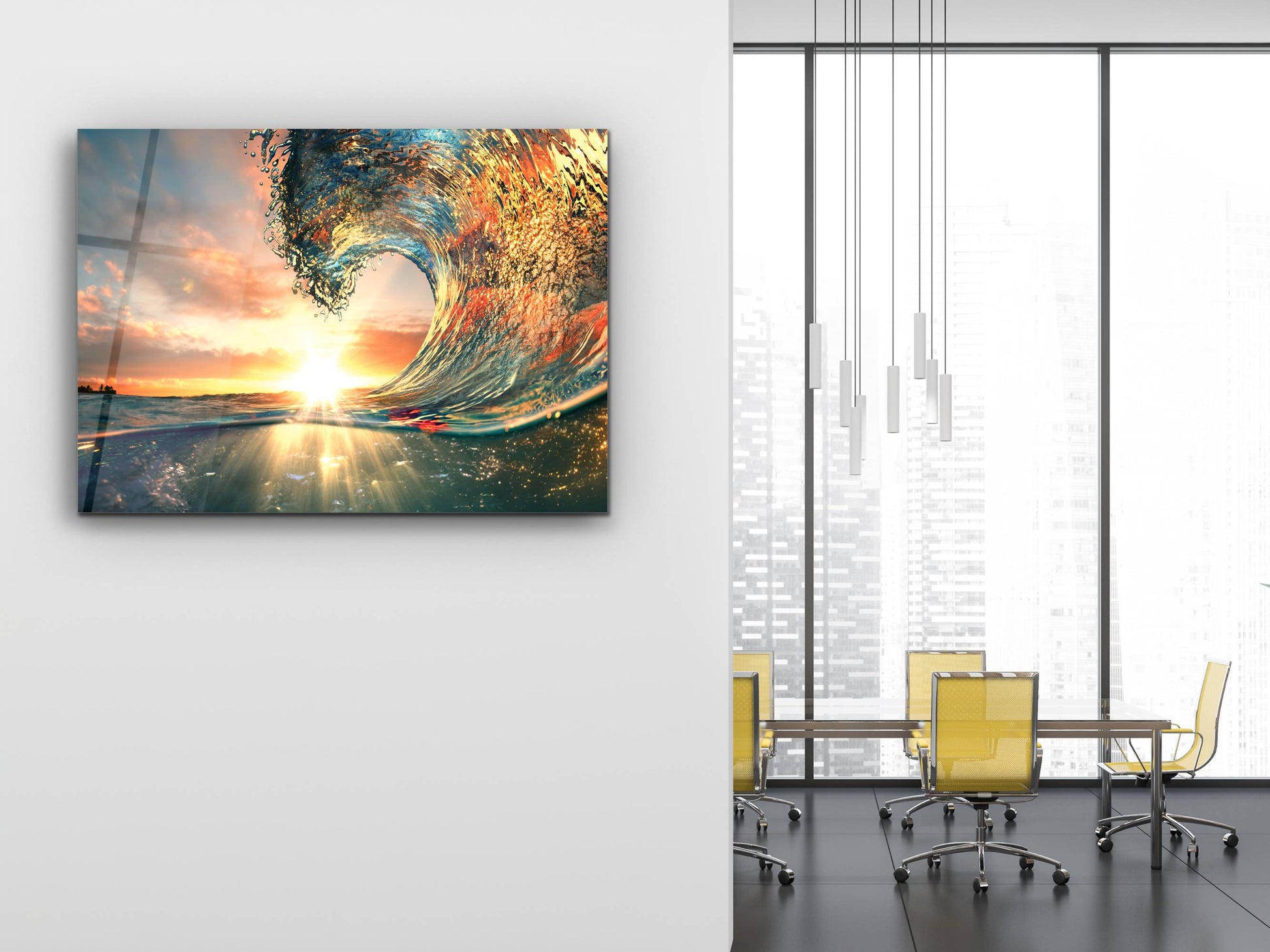 Gün Batımı ve Dalga Cam Duvar Tablosu – Manzara Temalı Dekoratif Ev ve Ofis Tablosu