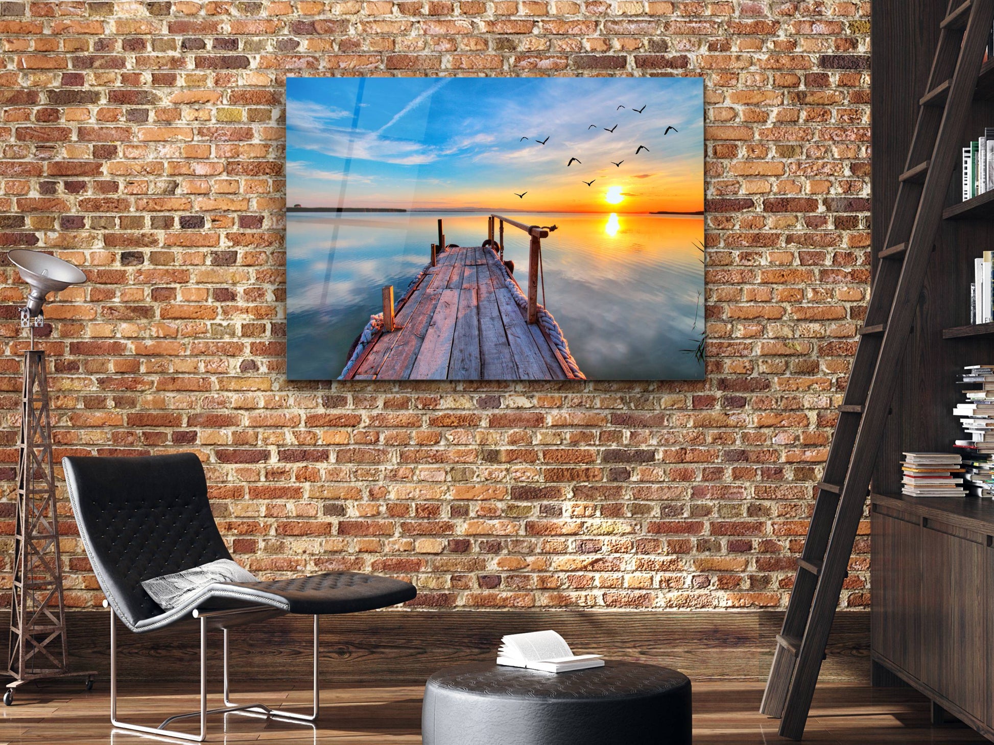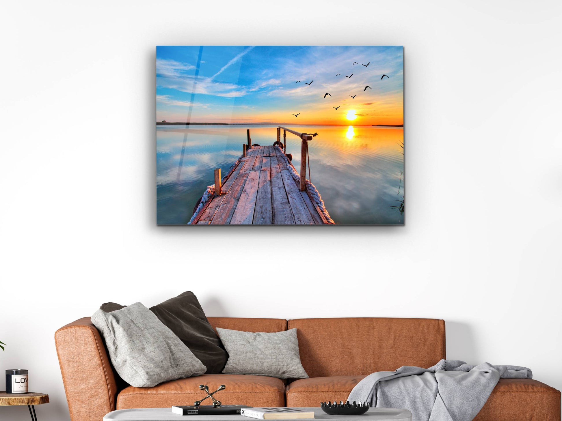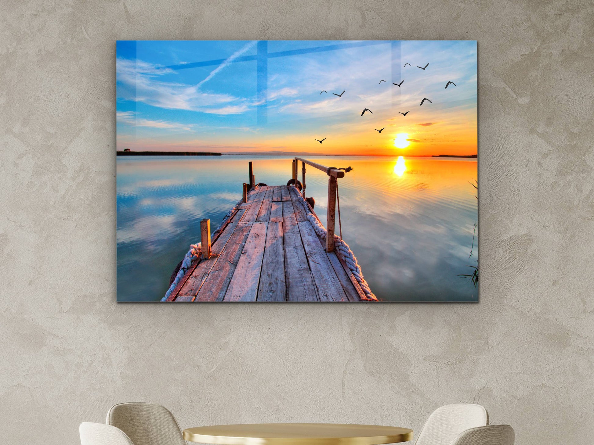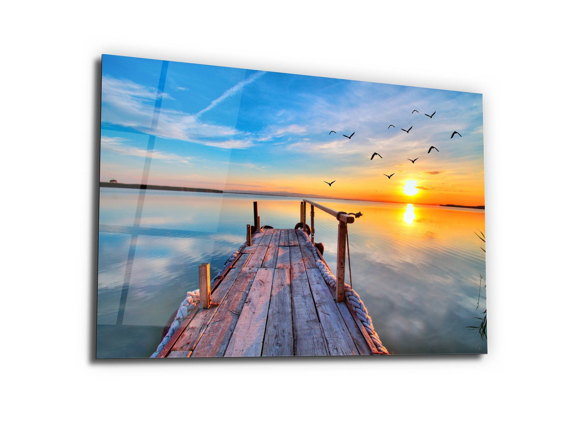 Gün Batımı ve İskele Cam Duvar Tablosu – Manzara Temalı Dekoratif Ev ve Ofis Tablosu