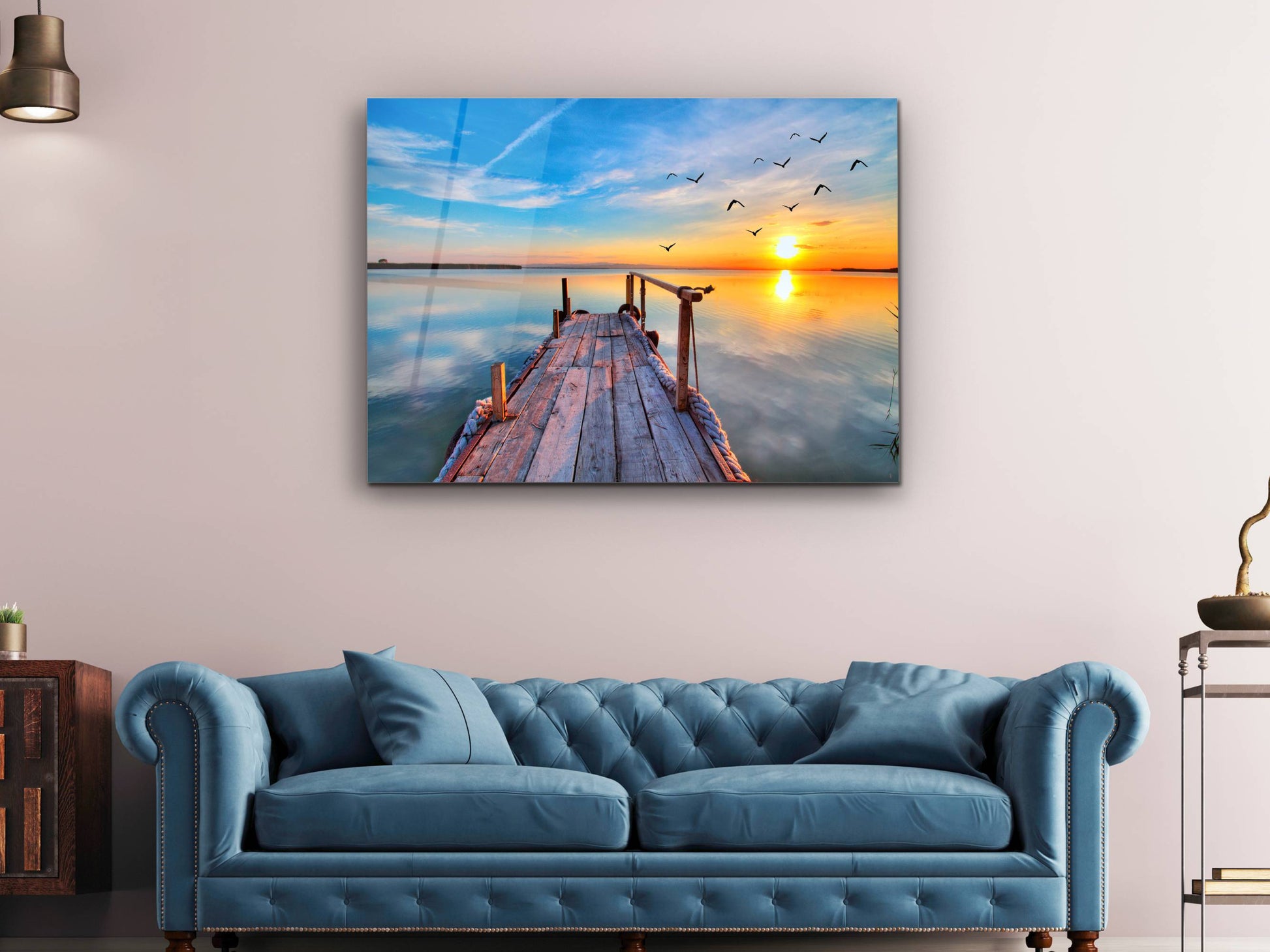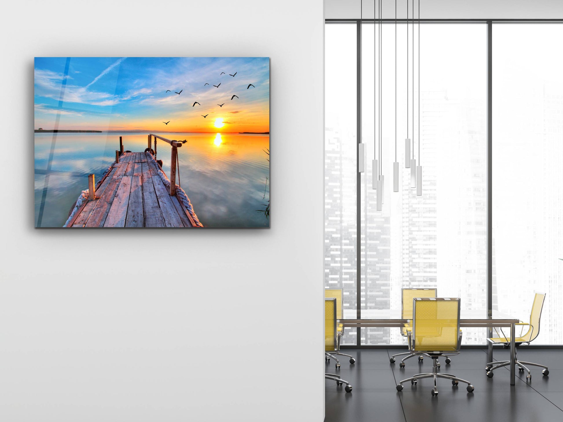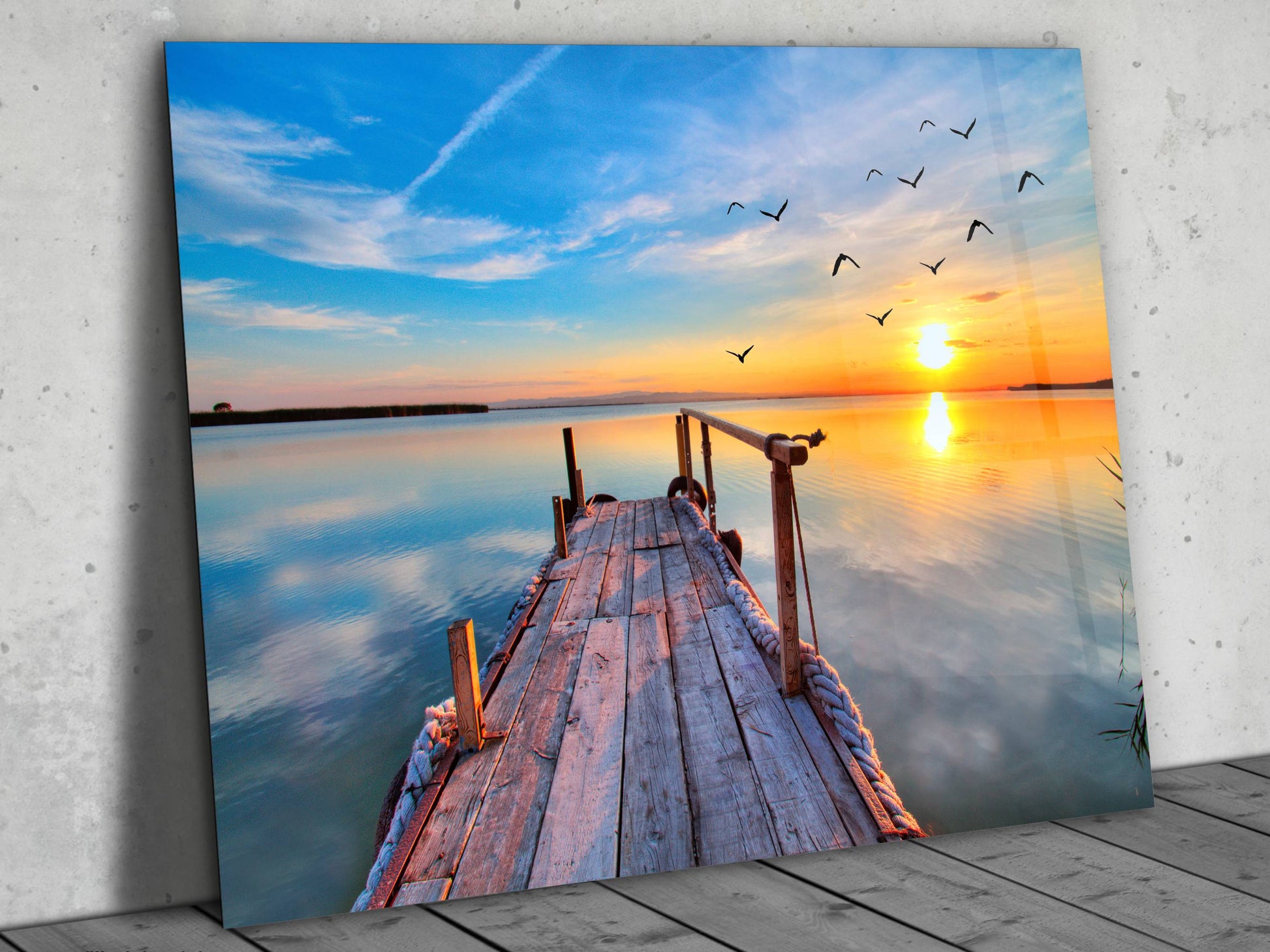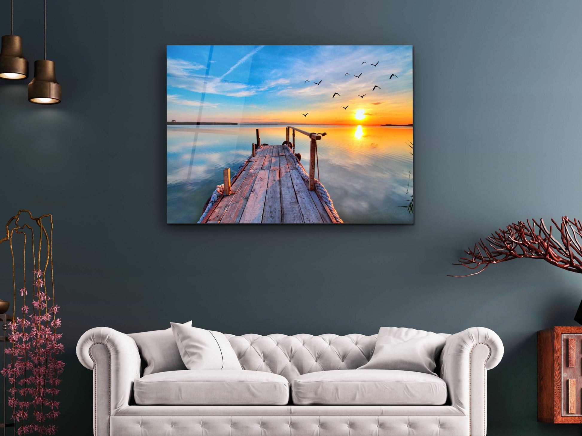 Gün Batımı ve İskele Cam Duvar Tablosu – Manzara Temalı Dekoratif Ev ve Ofis Tablosu