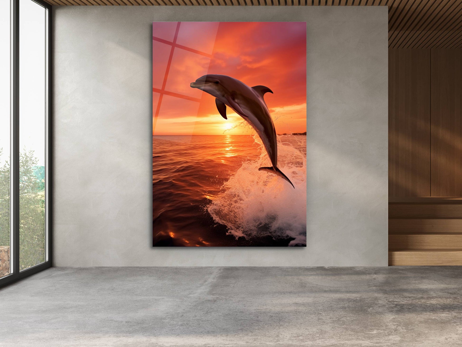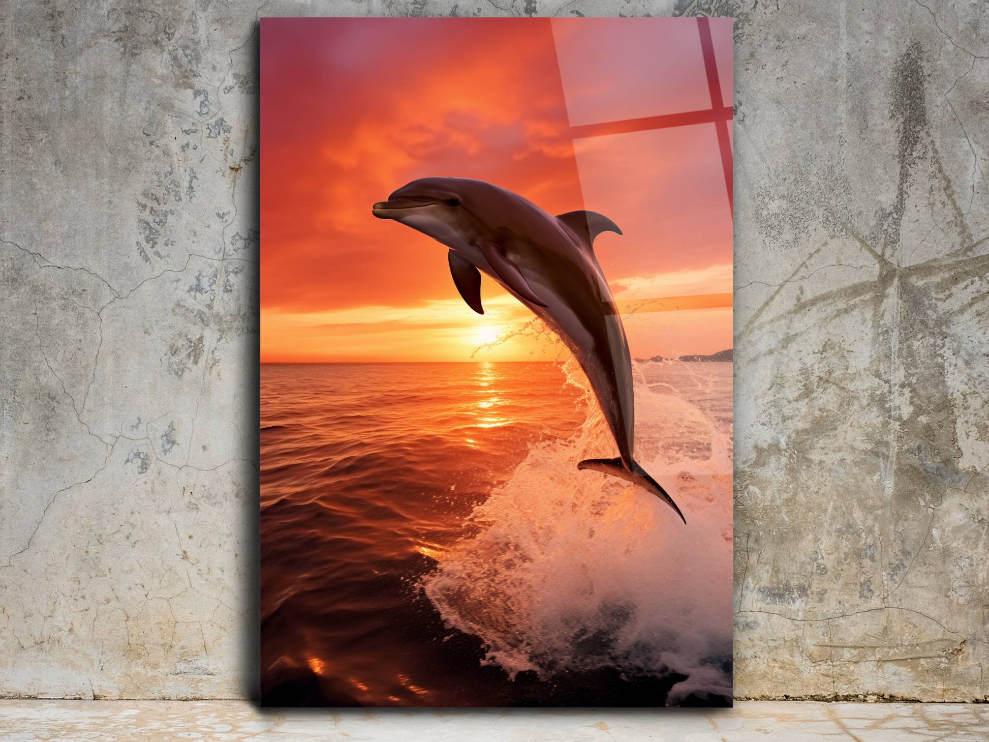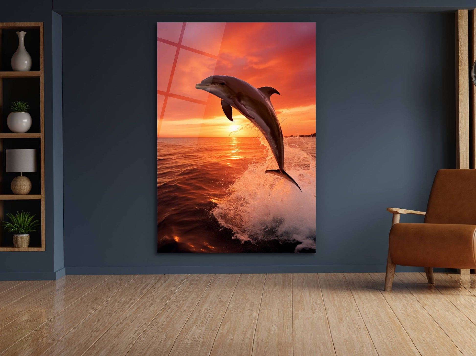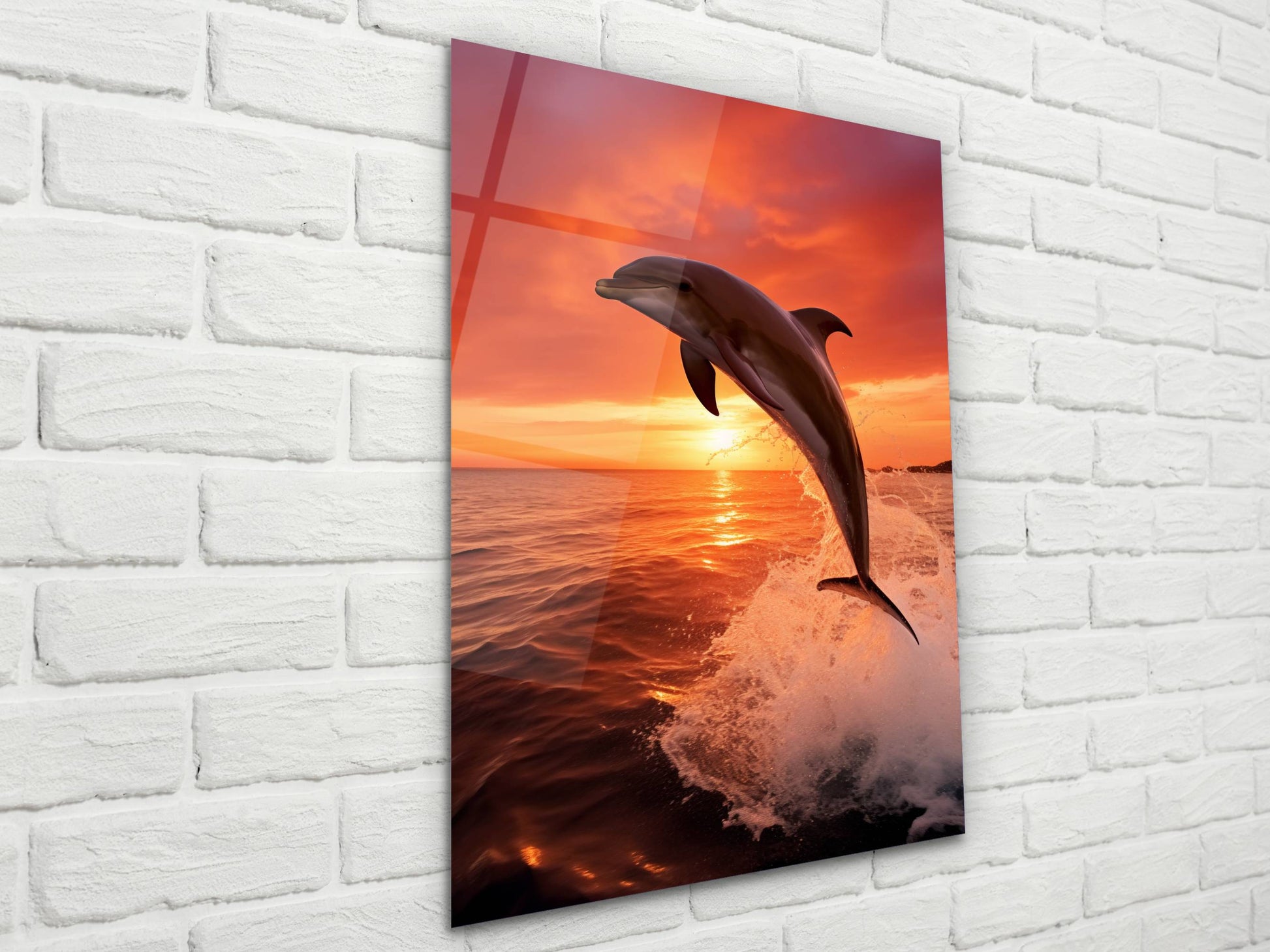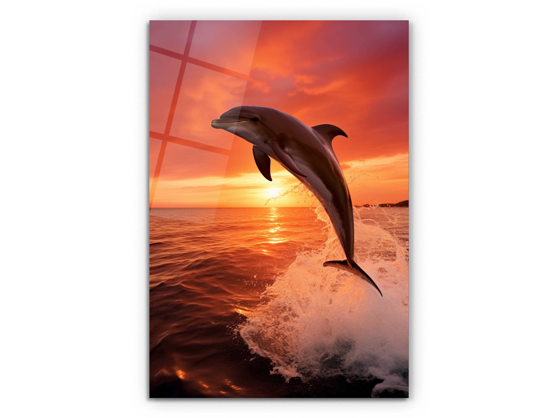 Gün Batımı Yunus Cam Tablo – Deniz ve Doğa Temalı Renkli Duvar Dekoru