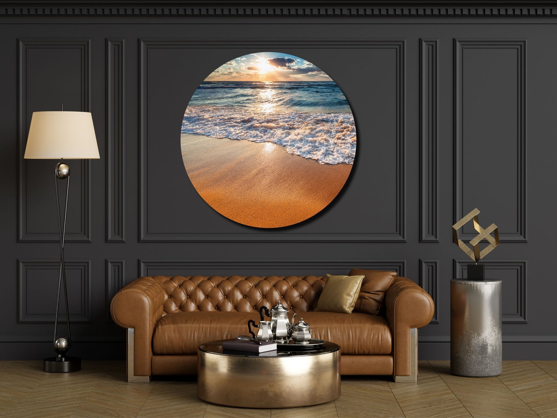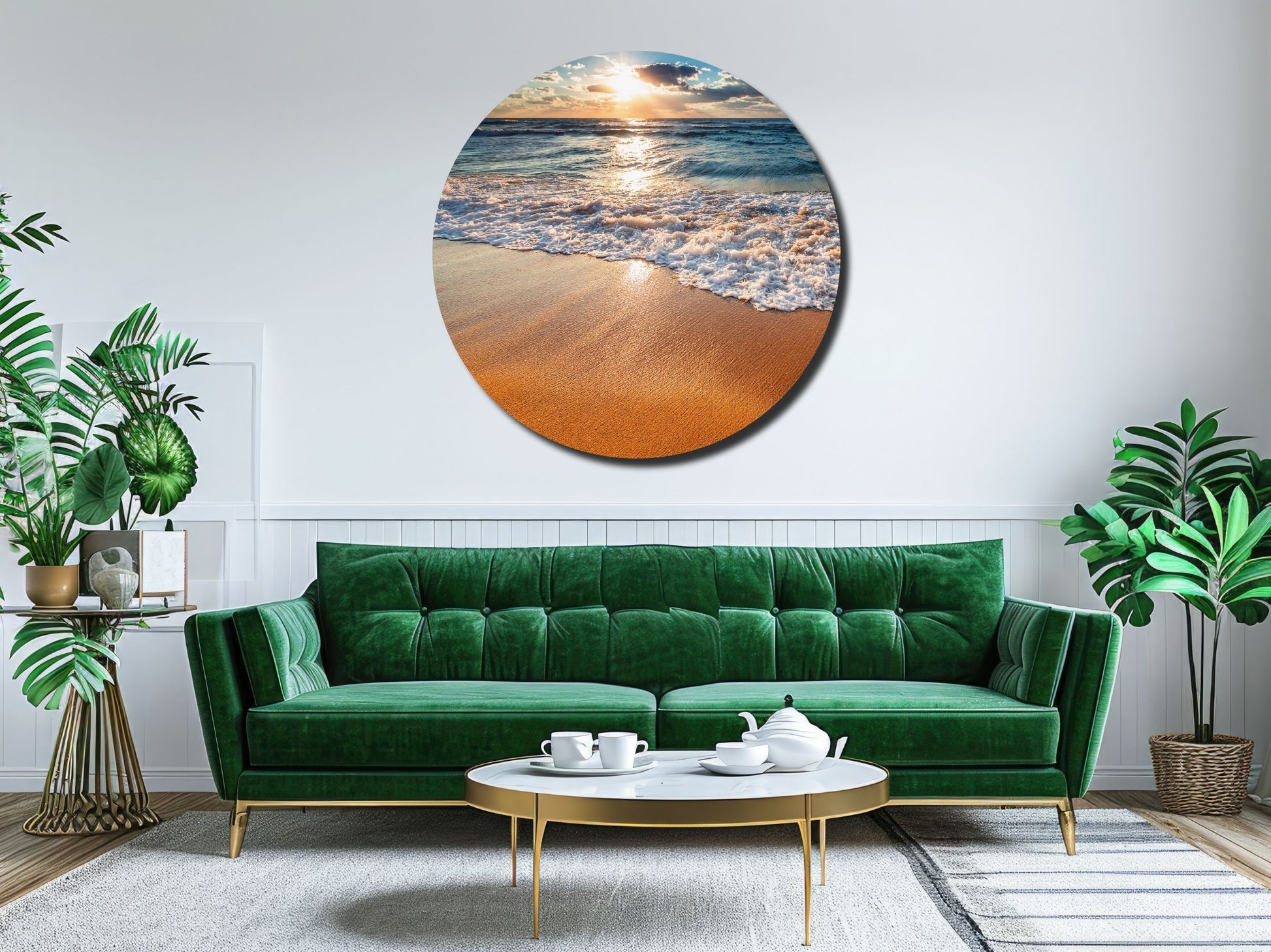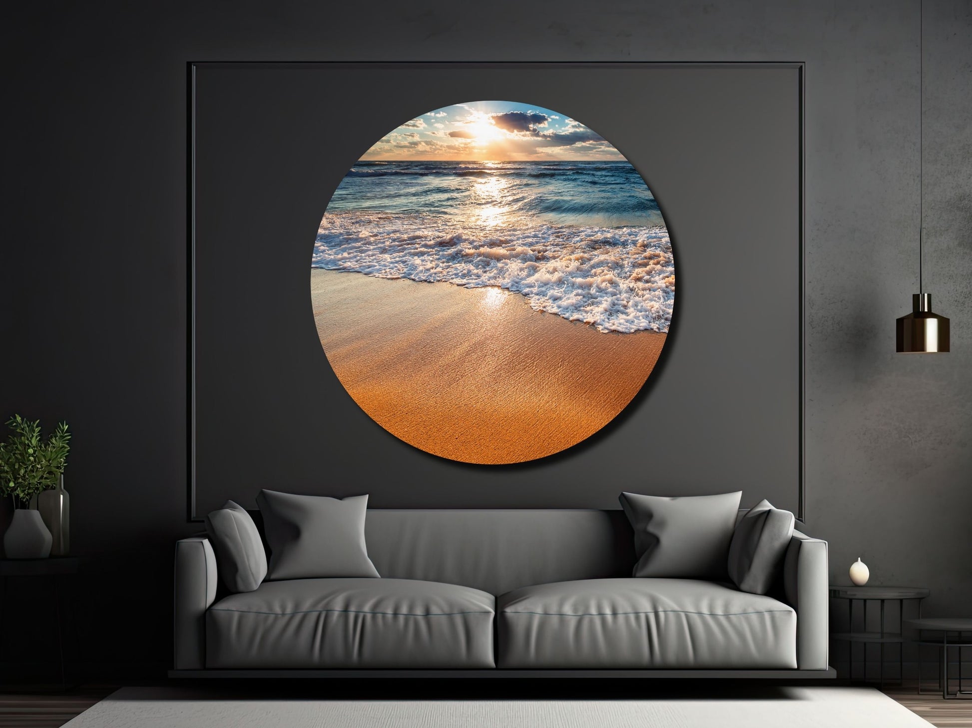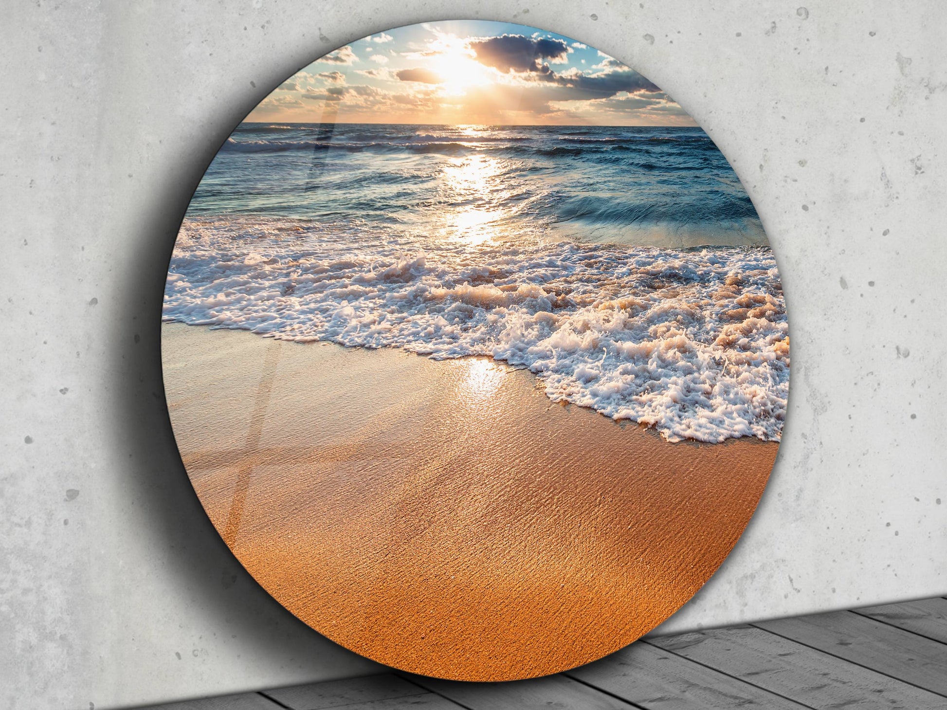 Gün Batımında Kumsal ve Dalgalar Yuvarlak Cam Tablo – Deniz Manzaralı Duvar Dekoru