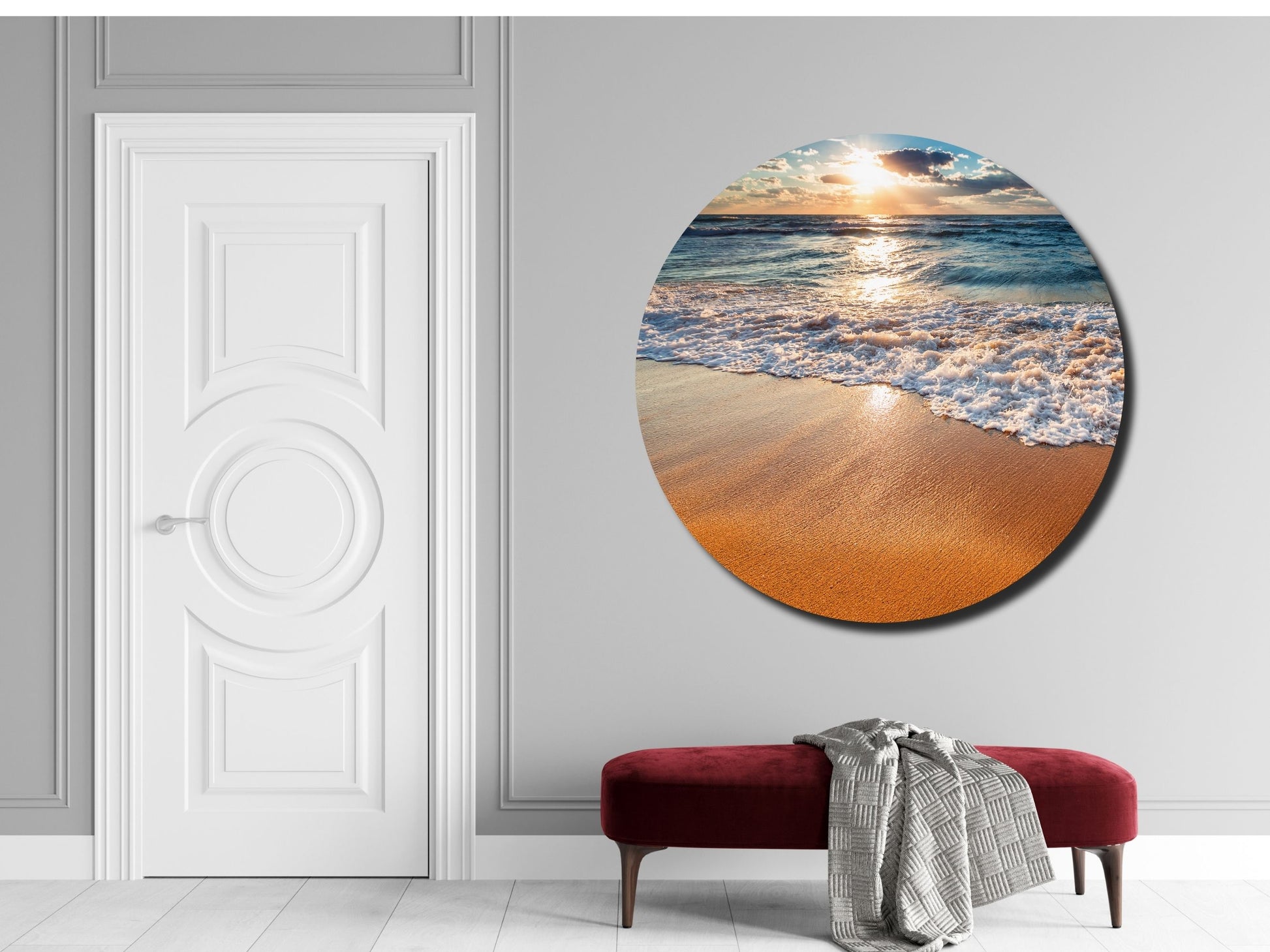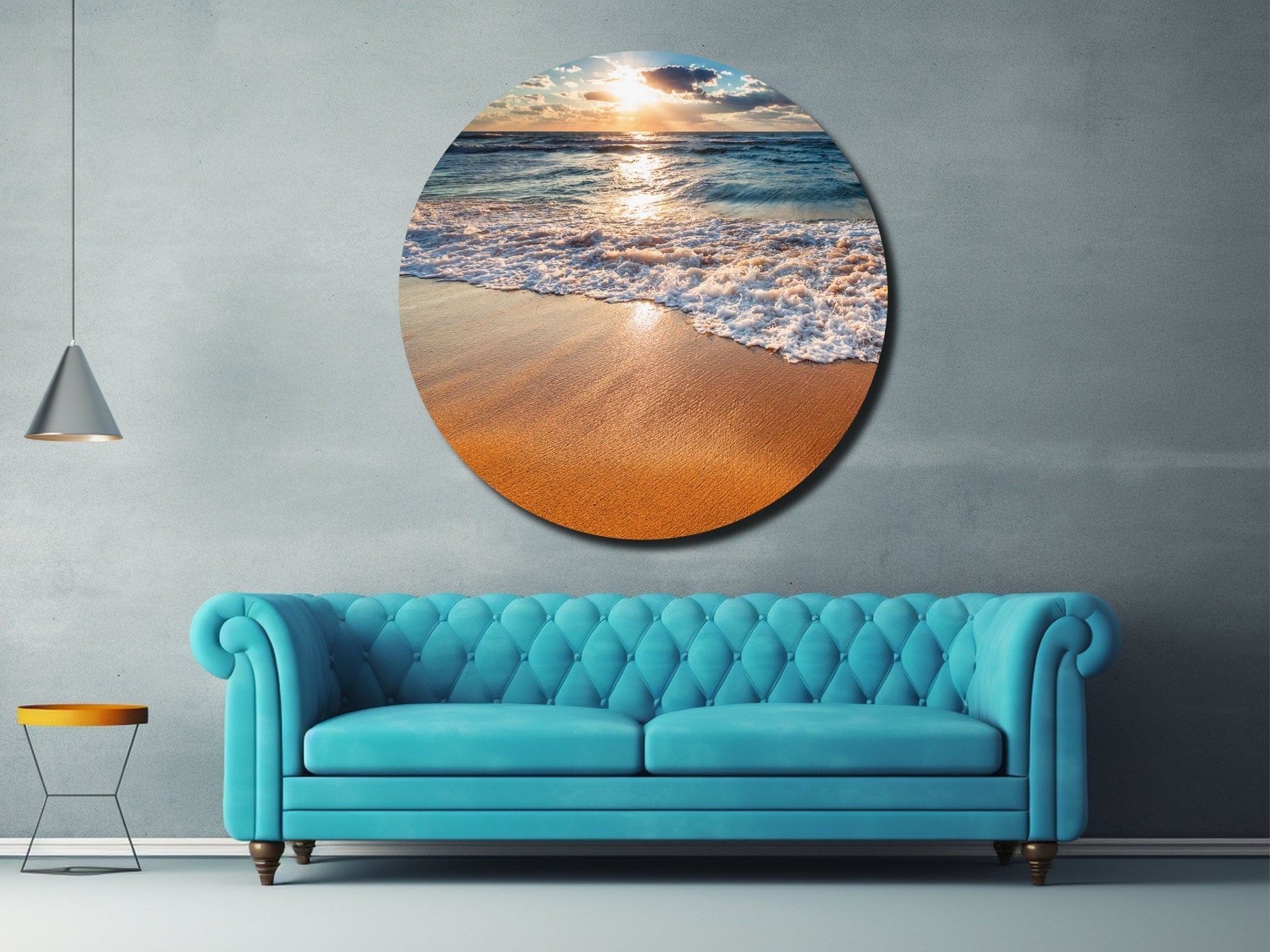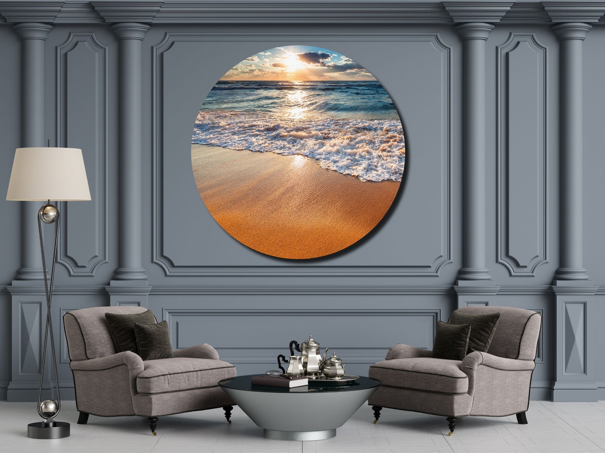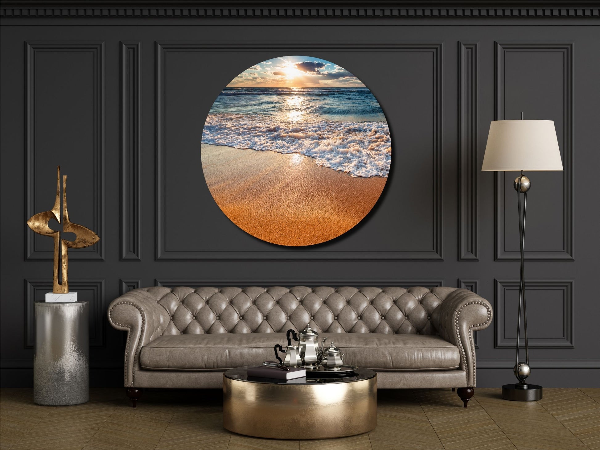 Gün Batımında Kumsal ve Dalgalar Yuvarlak Cam Tablo – Deniz Manzaralı Duvar Dekoru