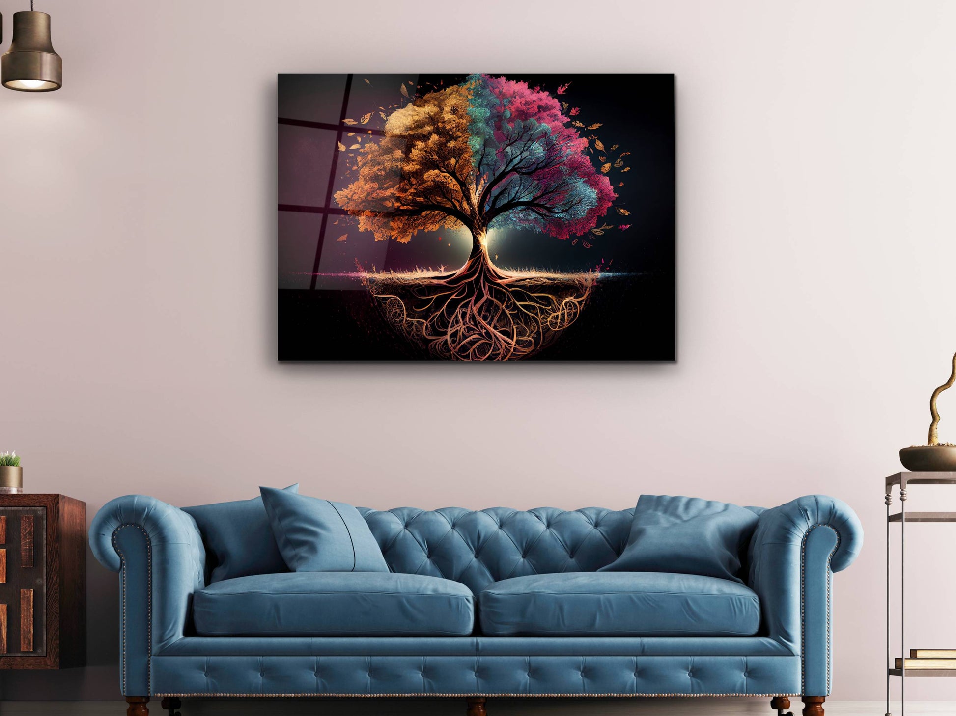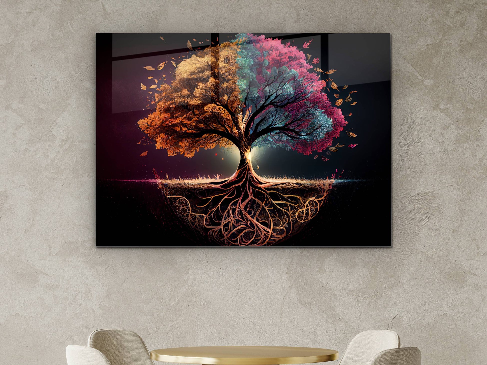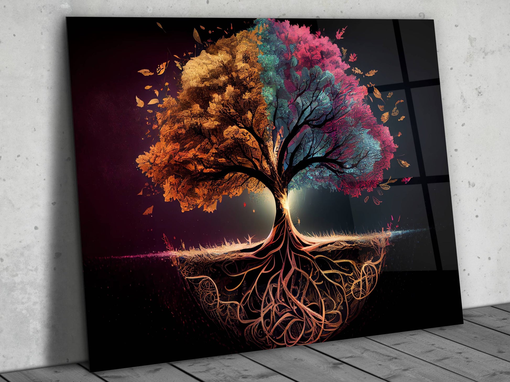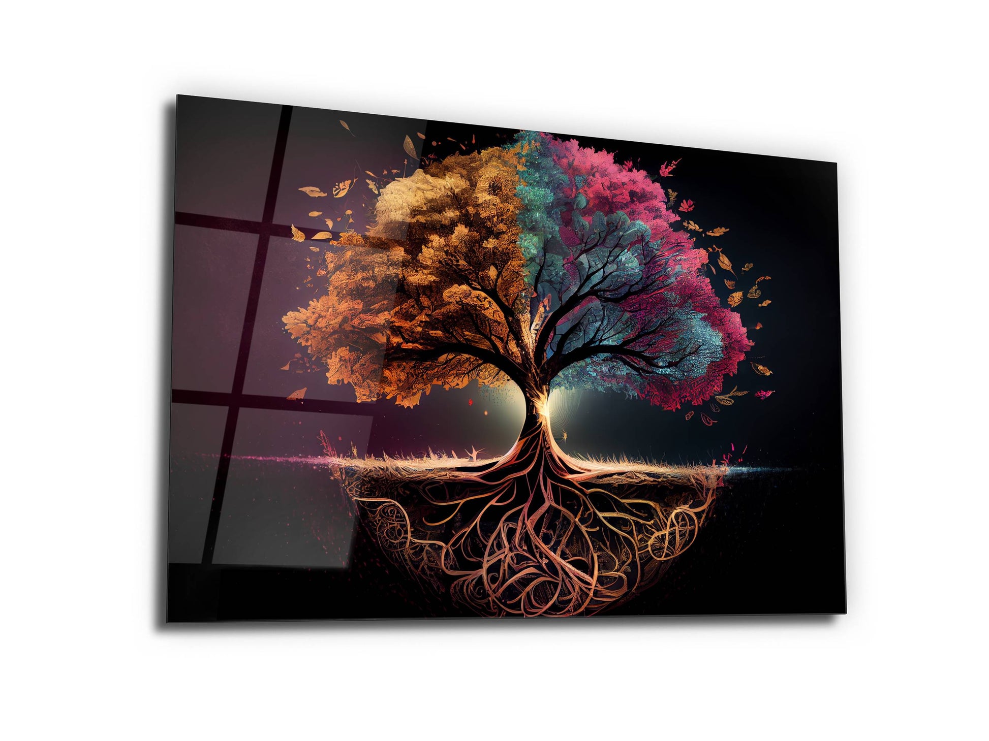 Hayat Ağacı Cam Tablo – Dört Mevsim Spiritüel Dekoratif Tablo