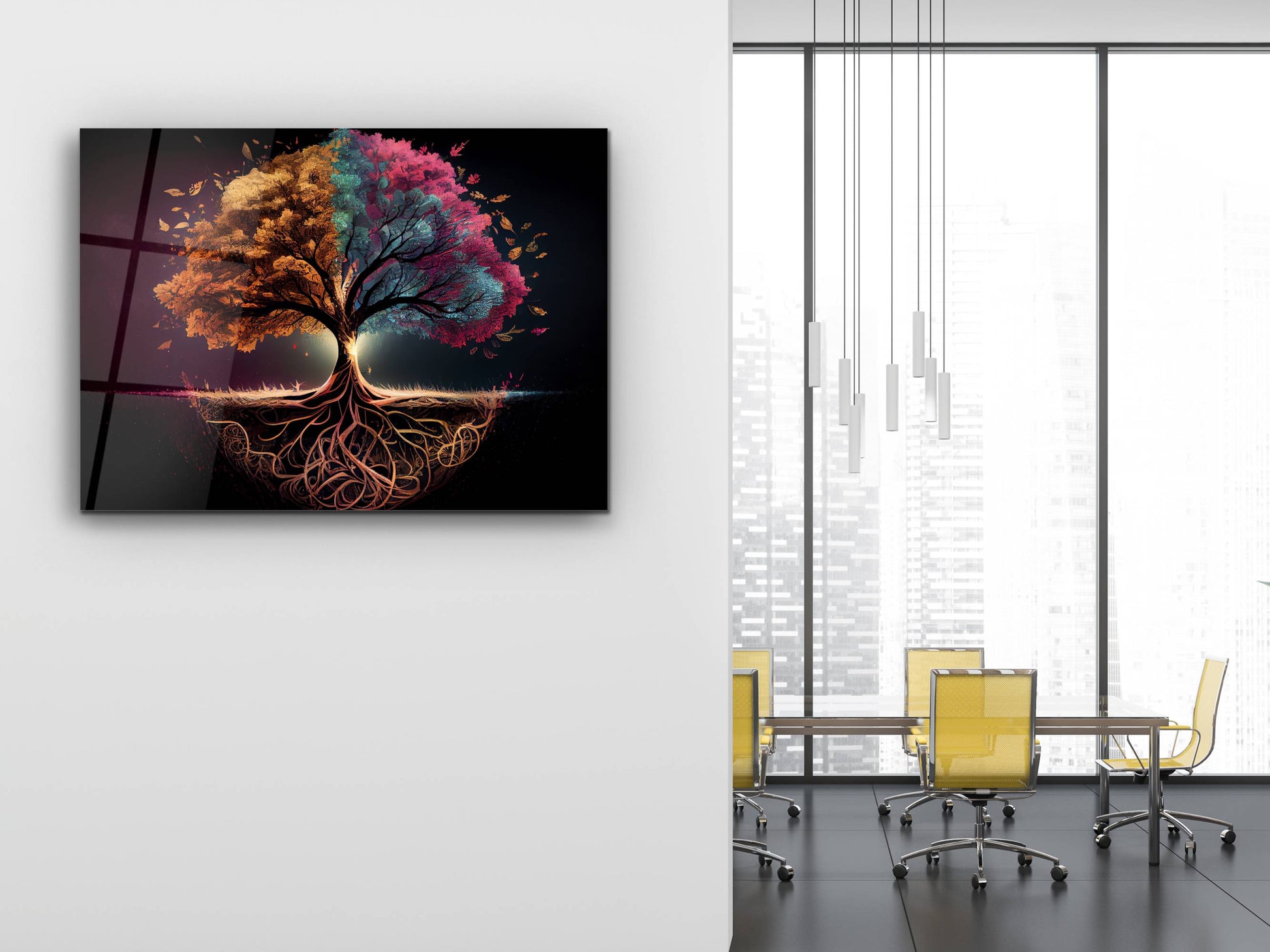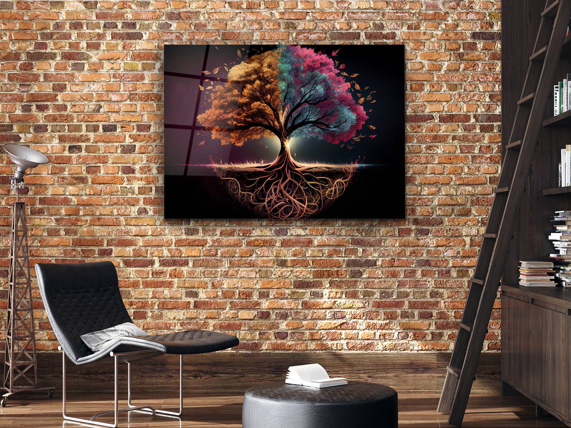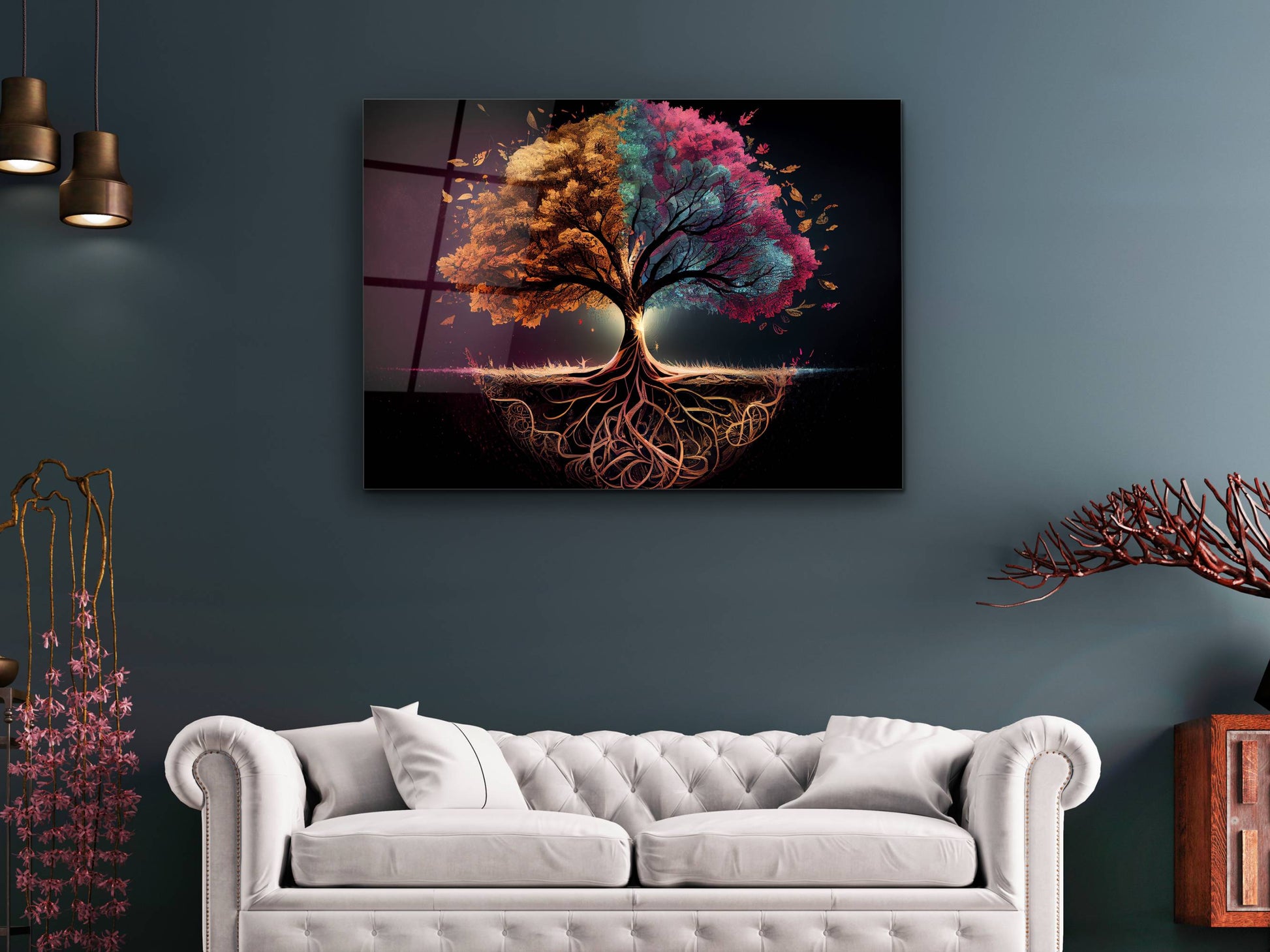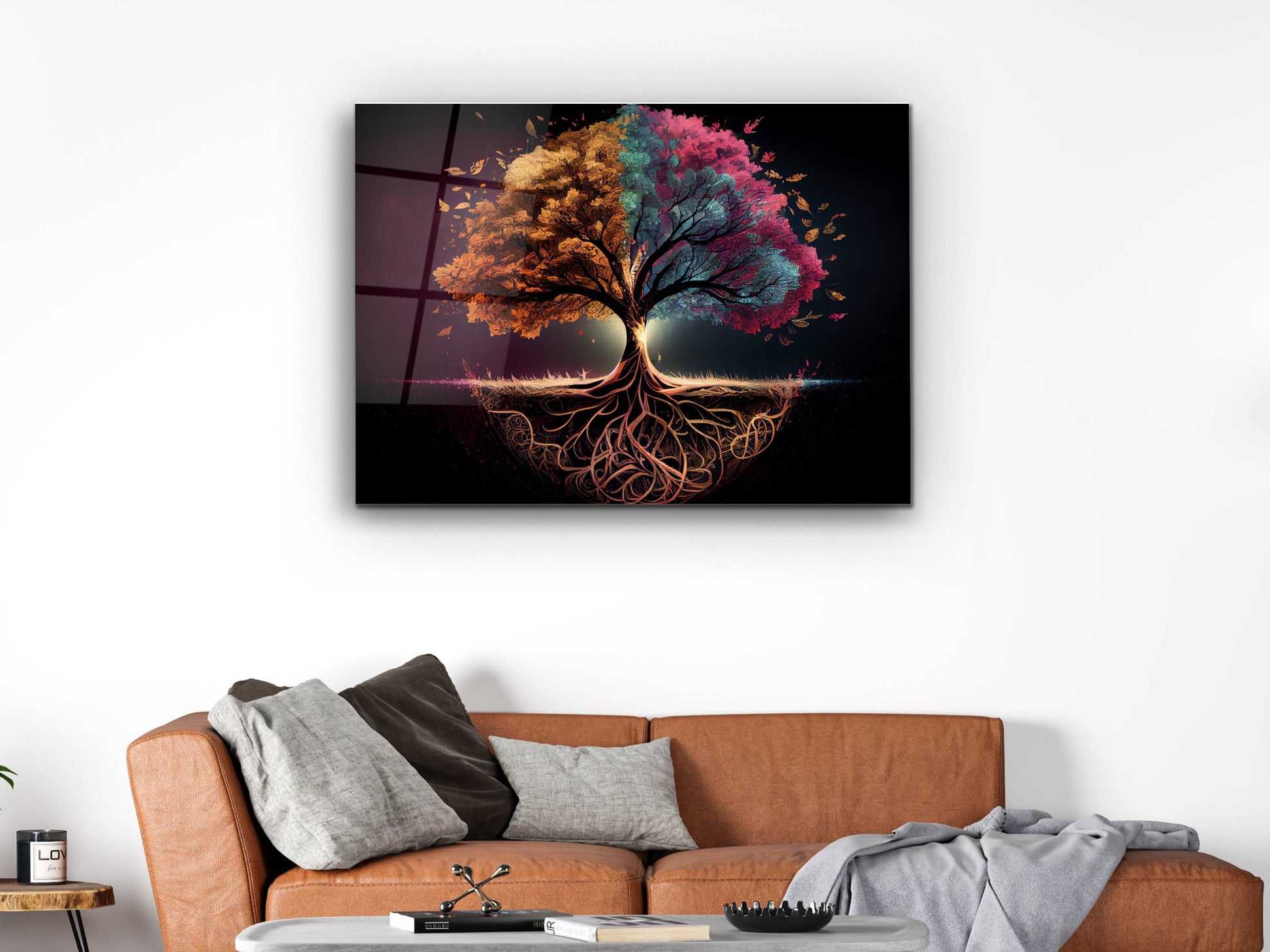 Hayat Ağacı Cam Tablo – Dört Mevsim Spiritüel Dekoratif Tablo