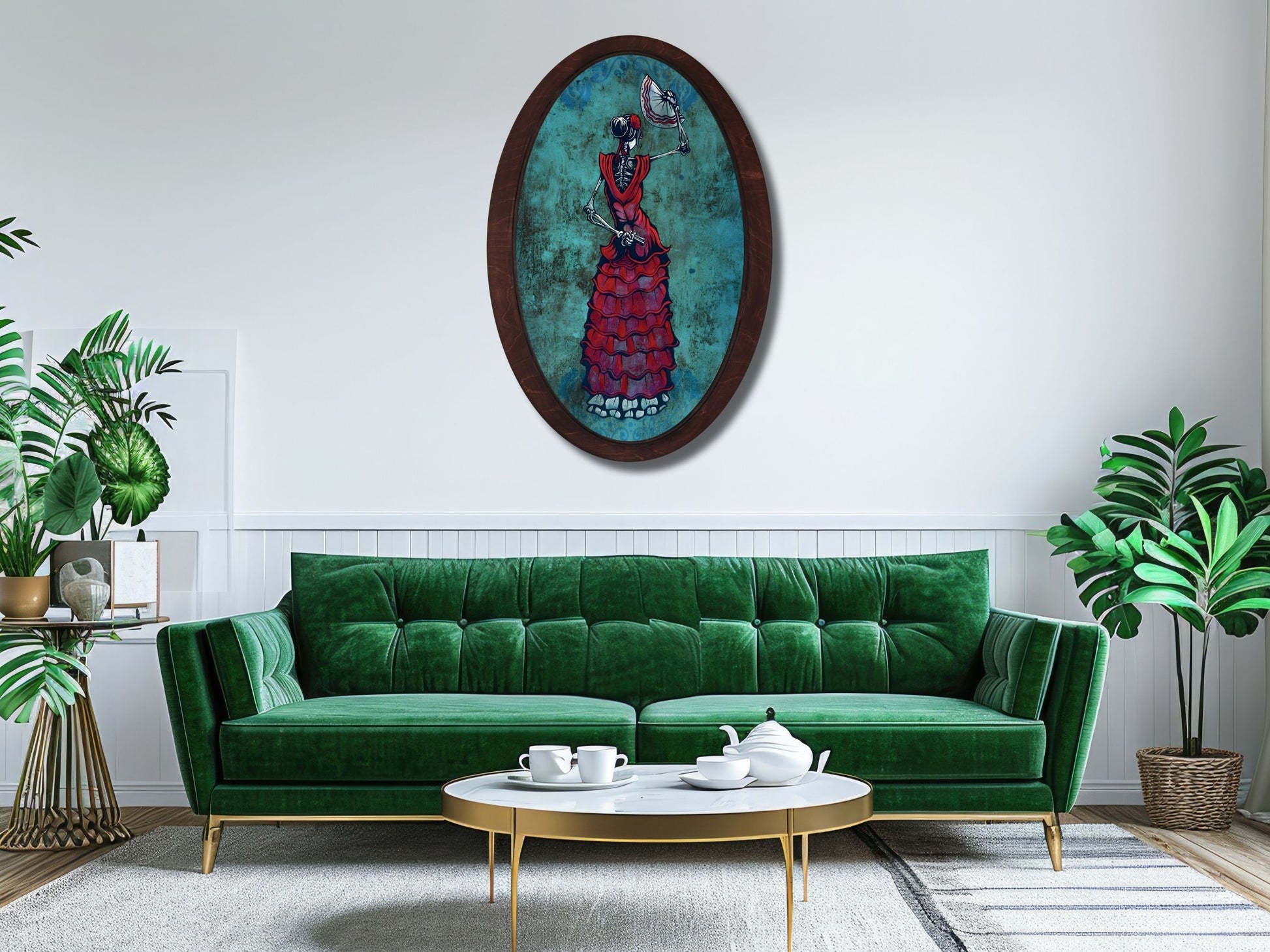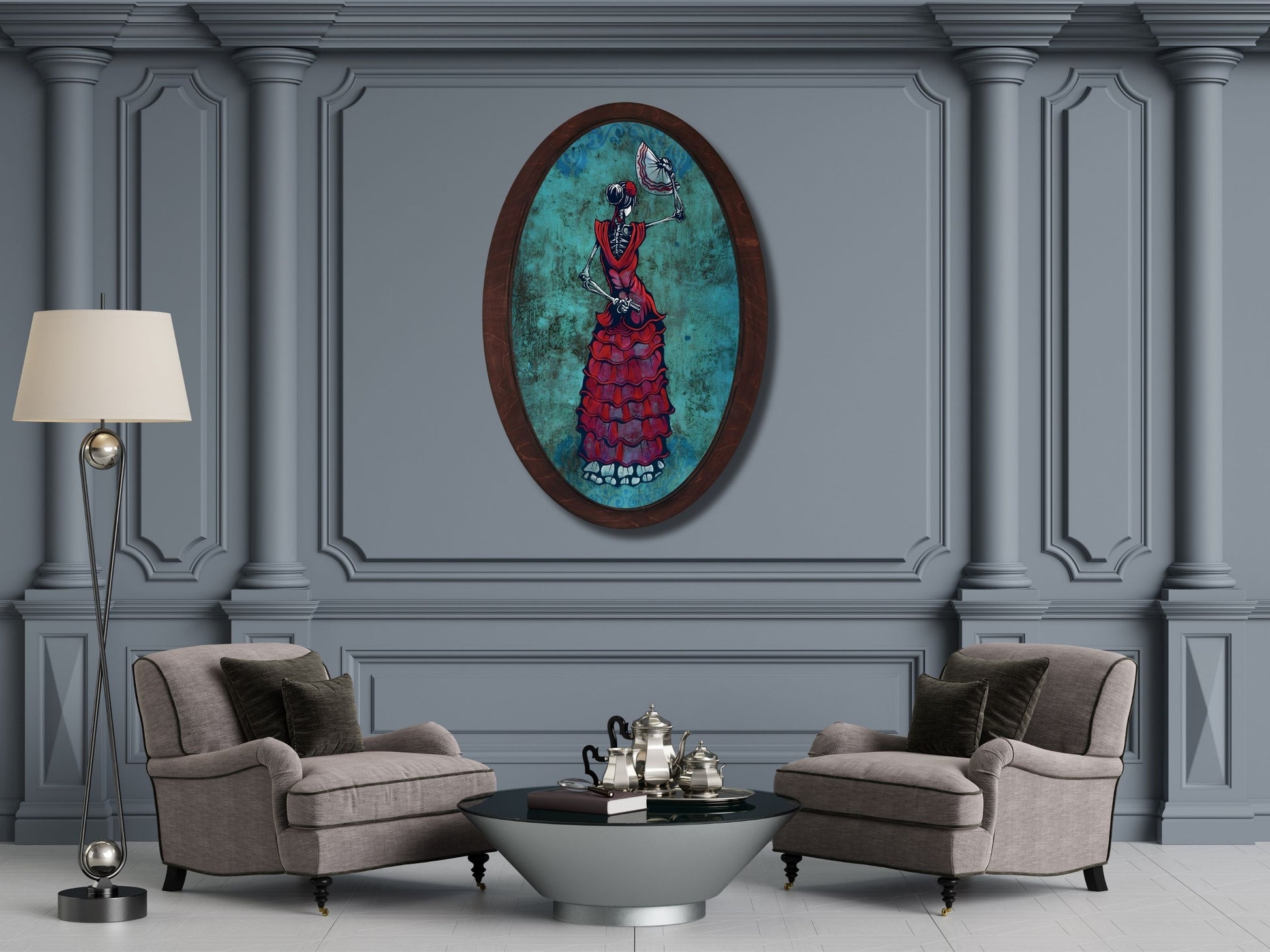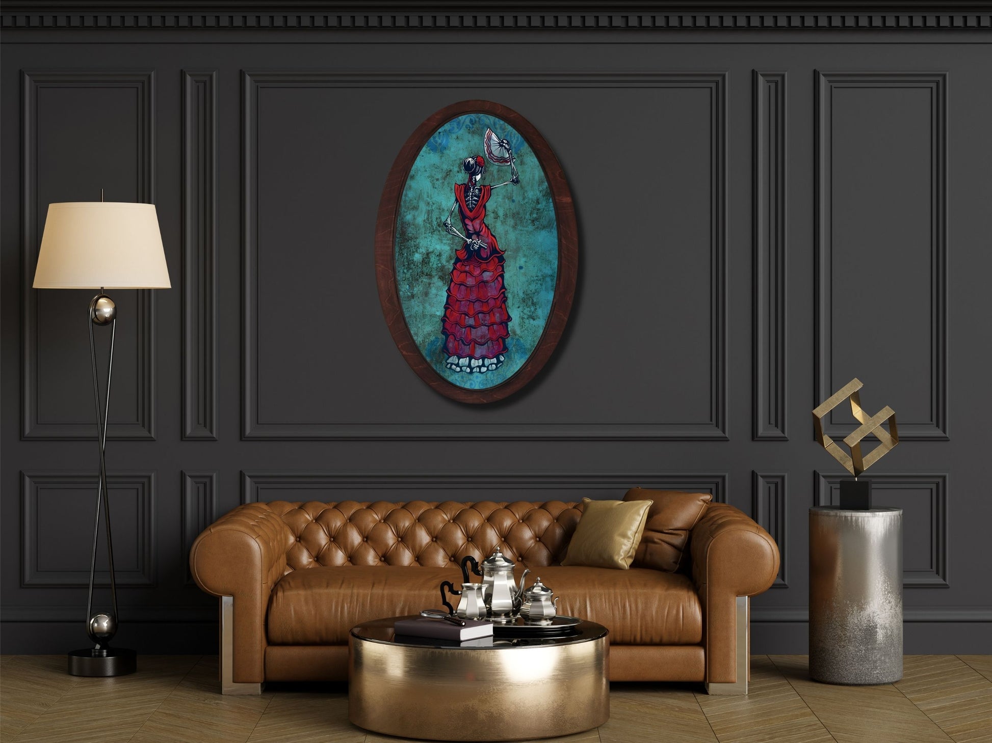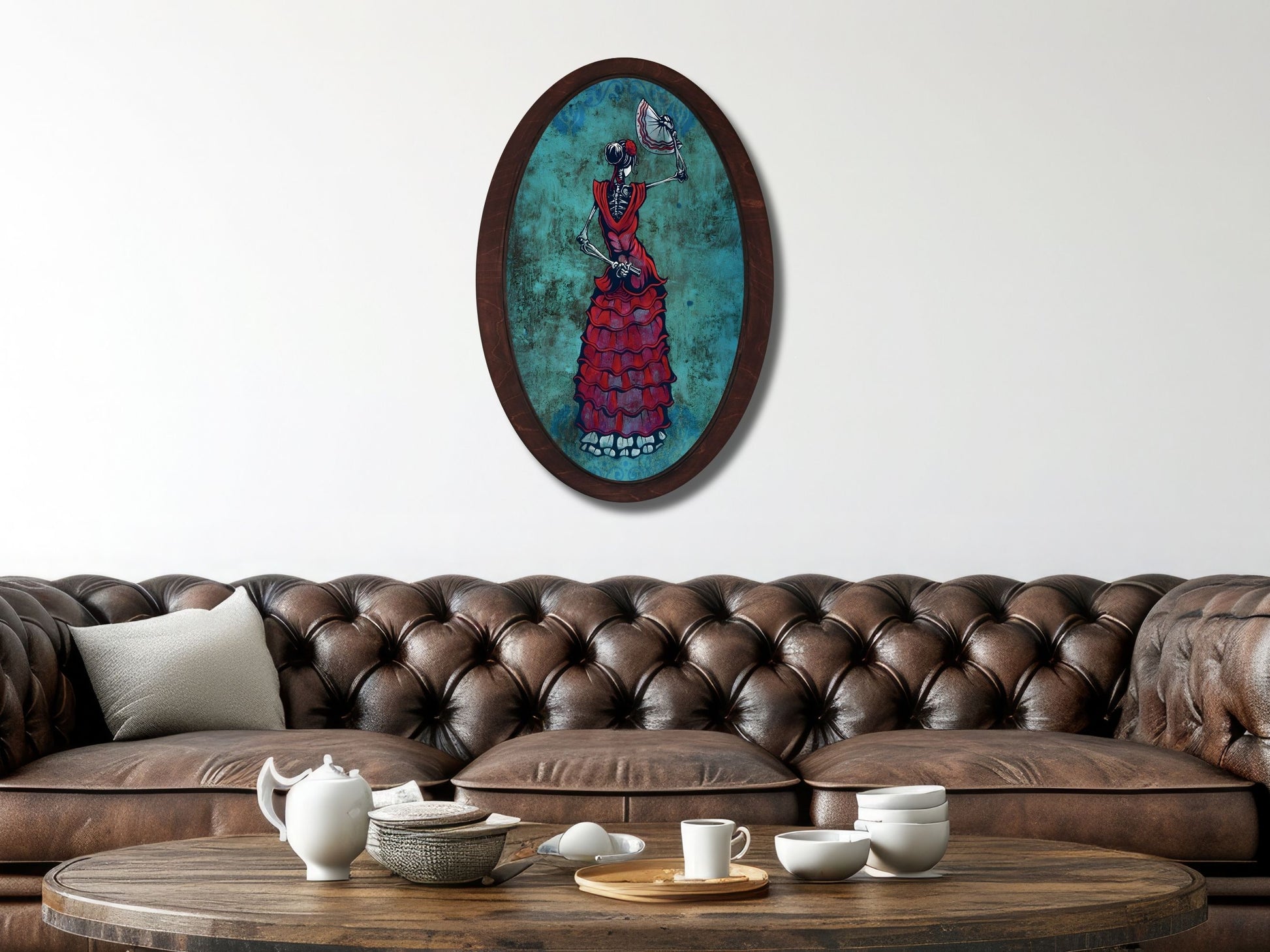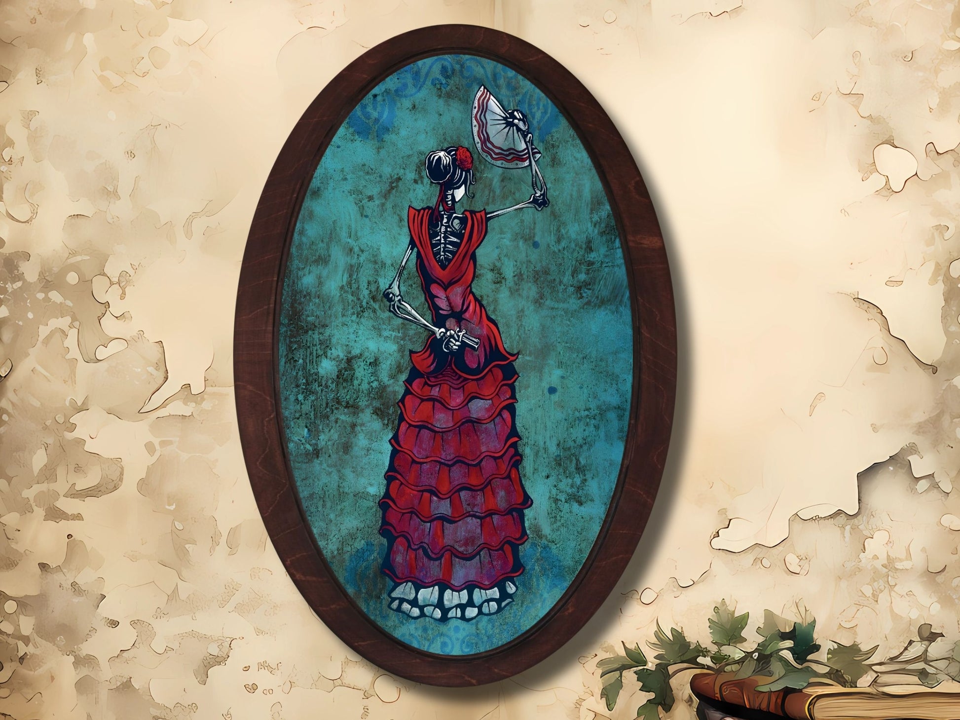 İskelet Kadın Gotik Stil Ahşap Tablo – Meksika Esintili Oval Duvar Dekoru - Vintage Ev Ofis Dekoru