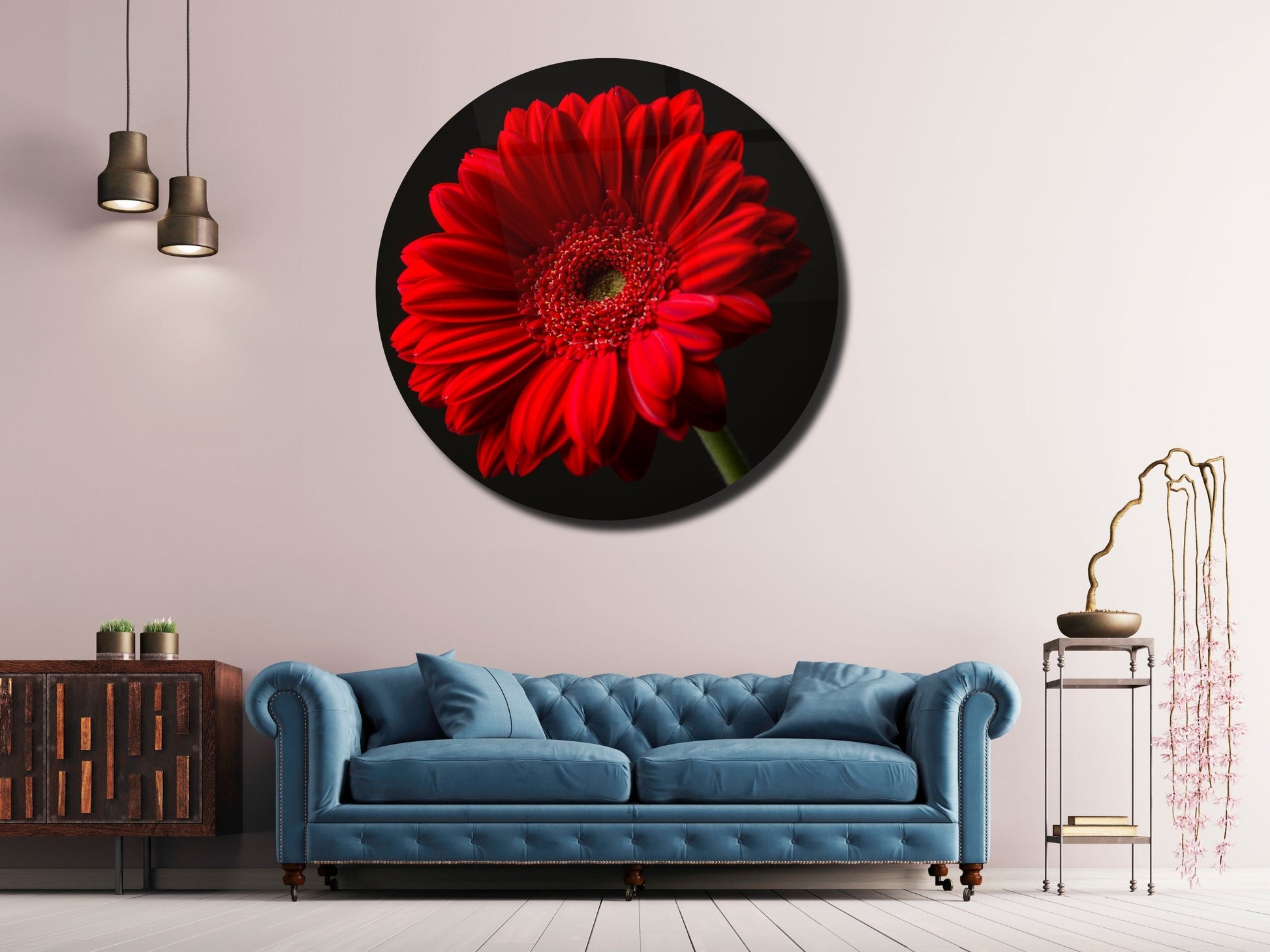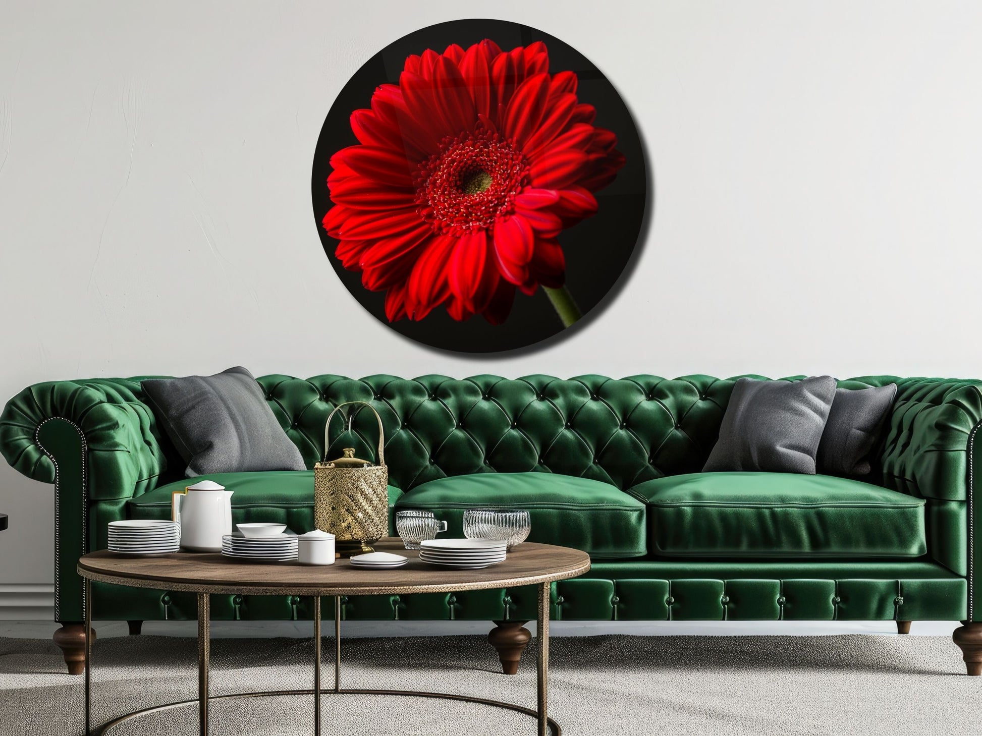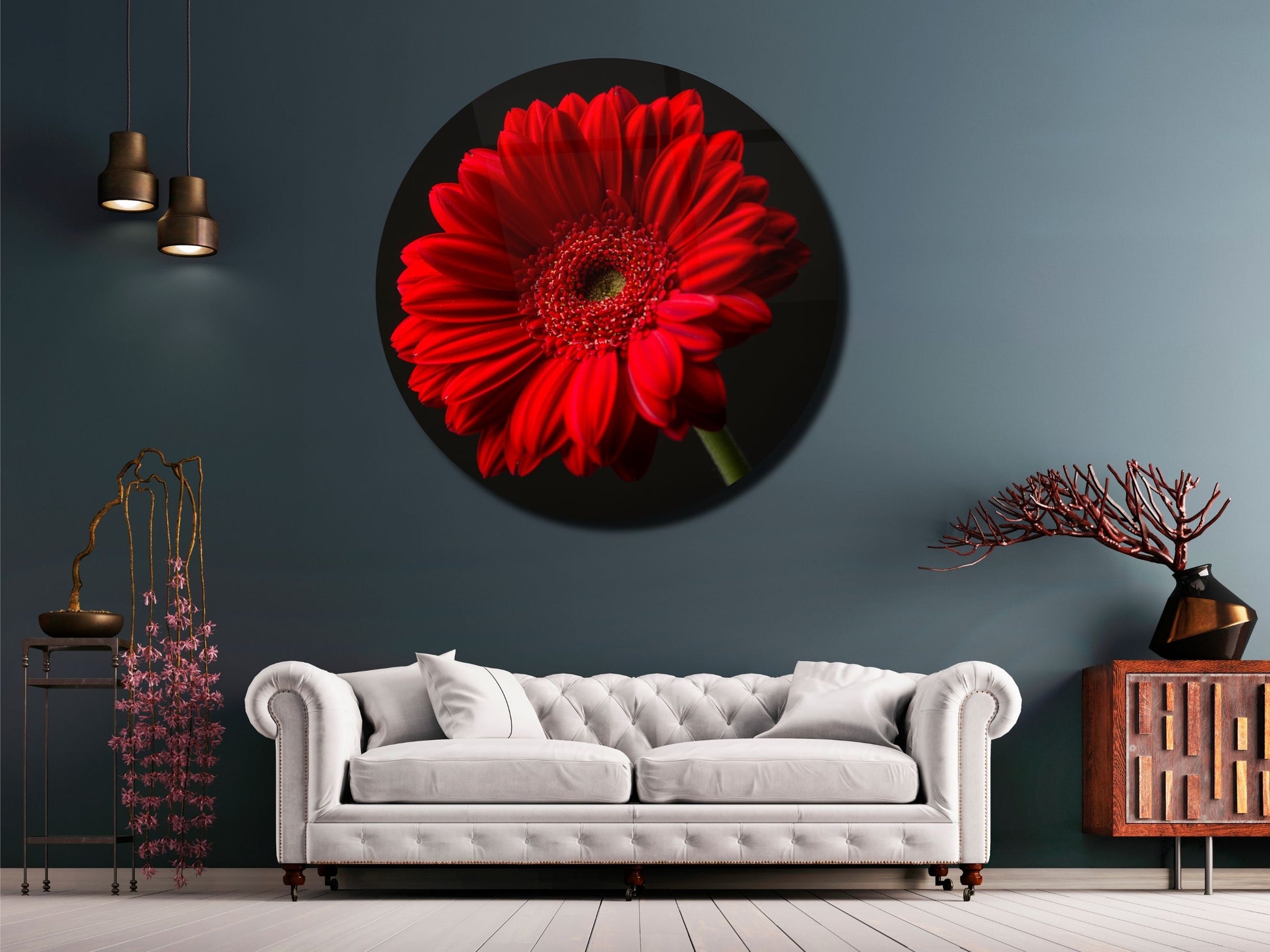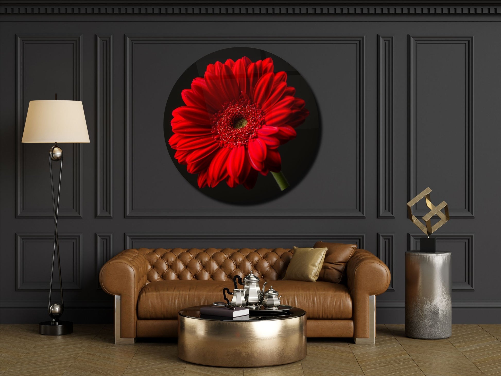 Kırmızı Karanfi Cam Tablo - Yuvarlak Modern Çiçek Duvar Dekoru
