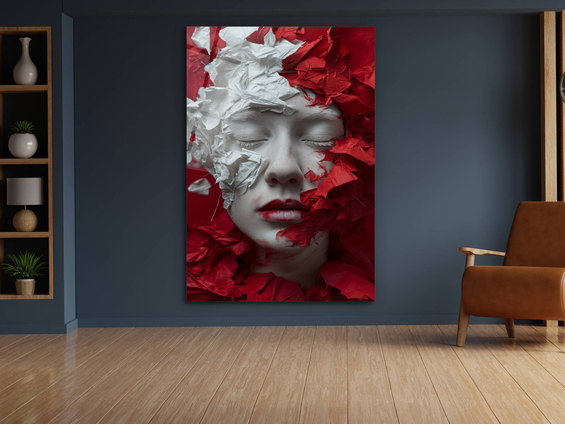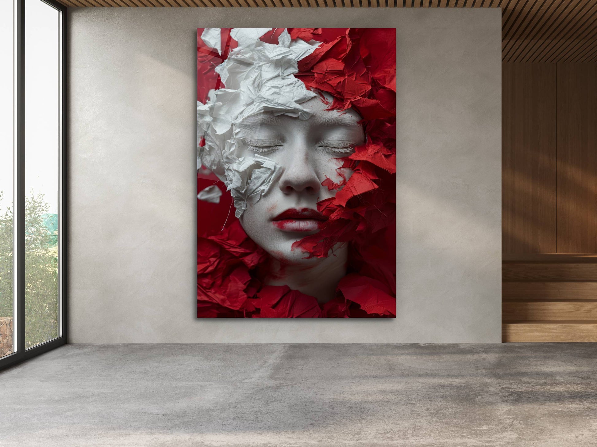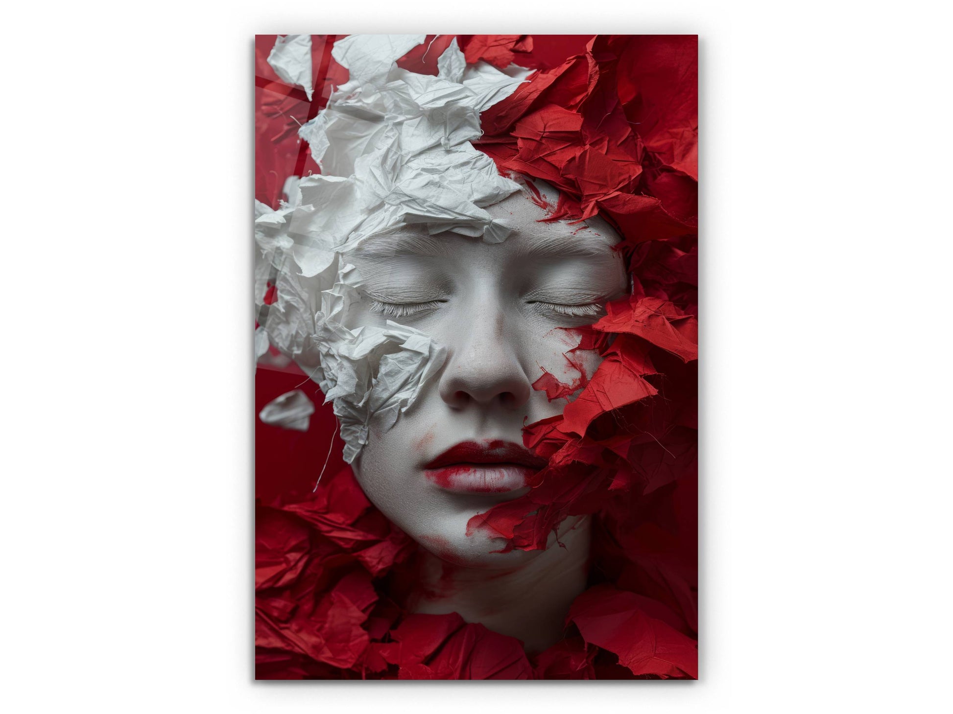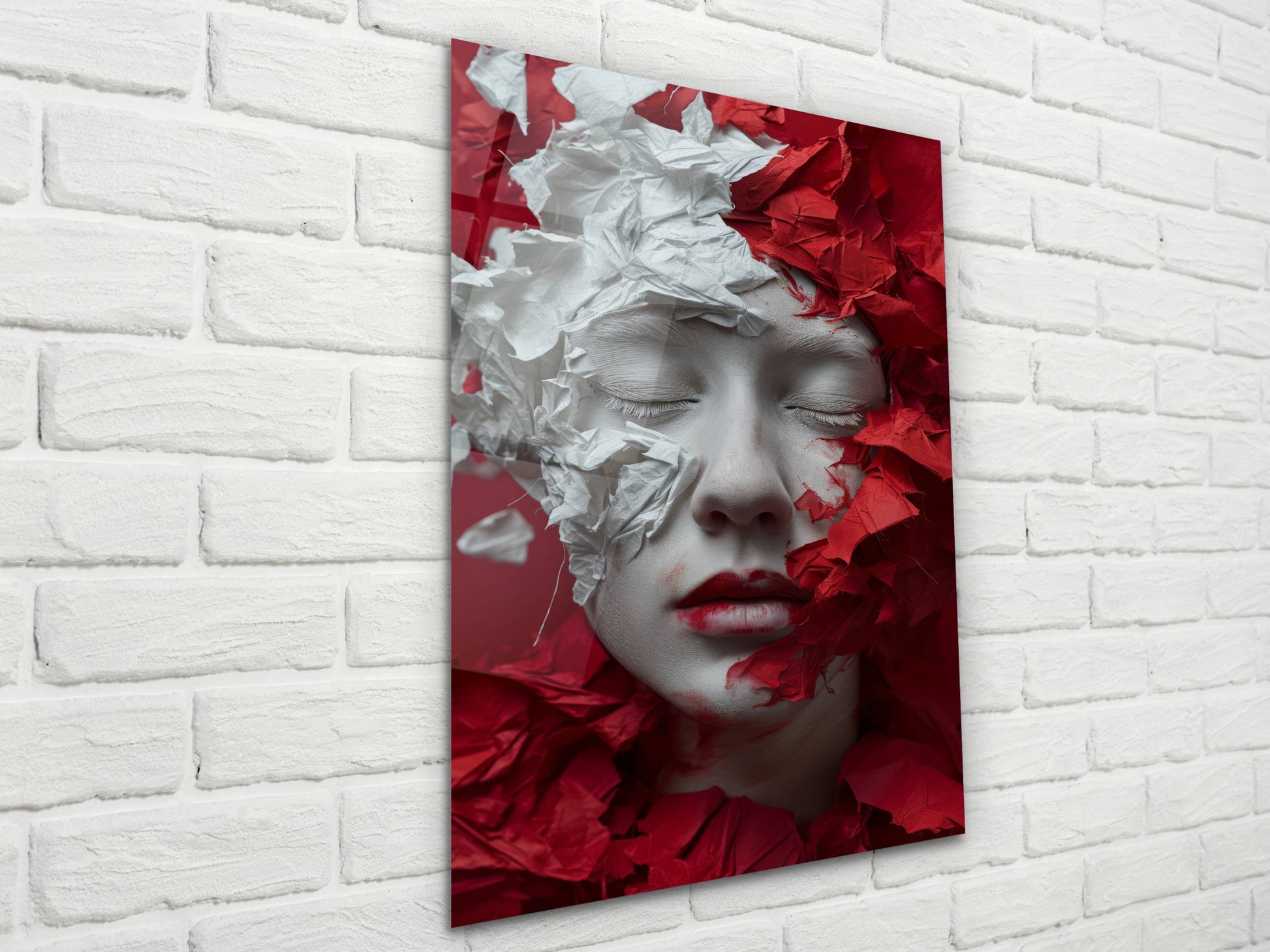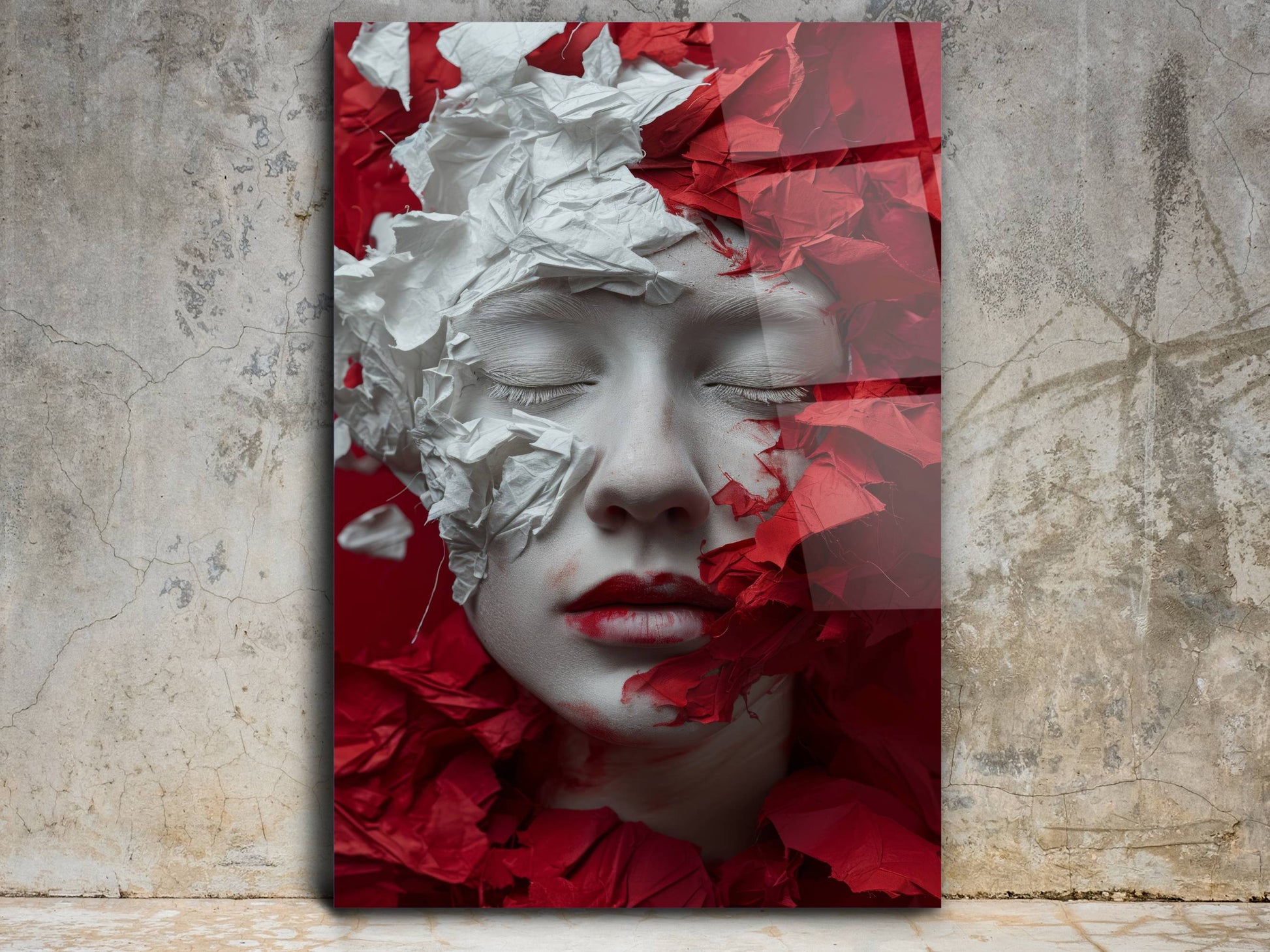 Kırmızı ve Beyaz Soyut Portre Cam Tablo - Modern Duvar Tablosu