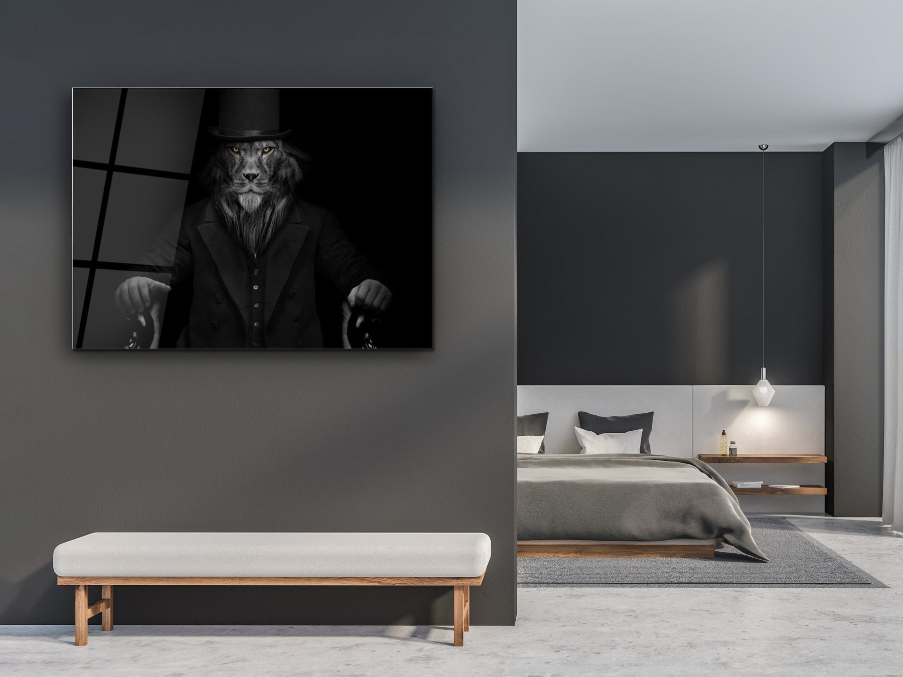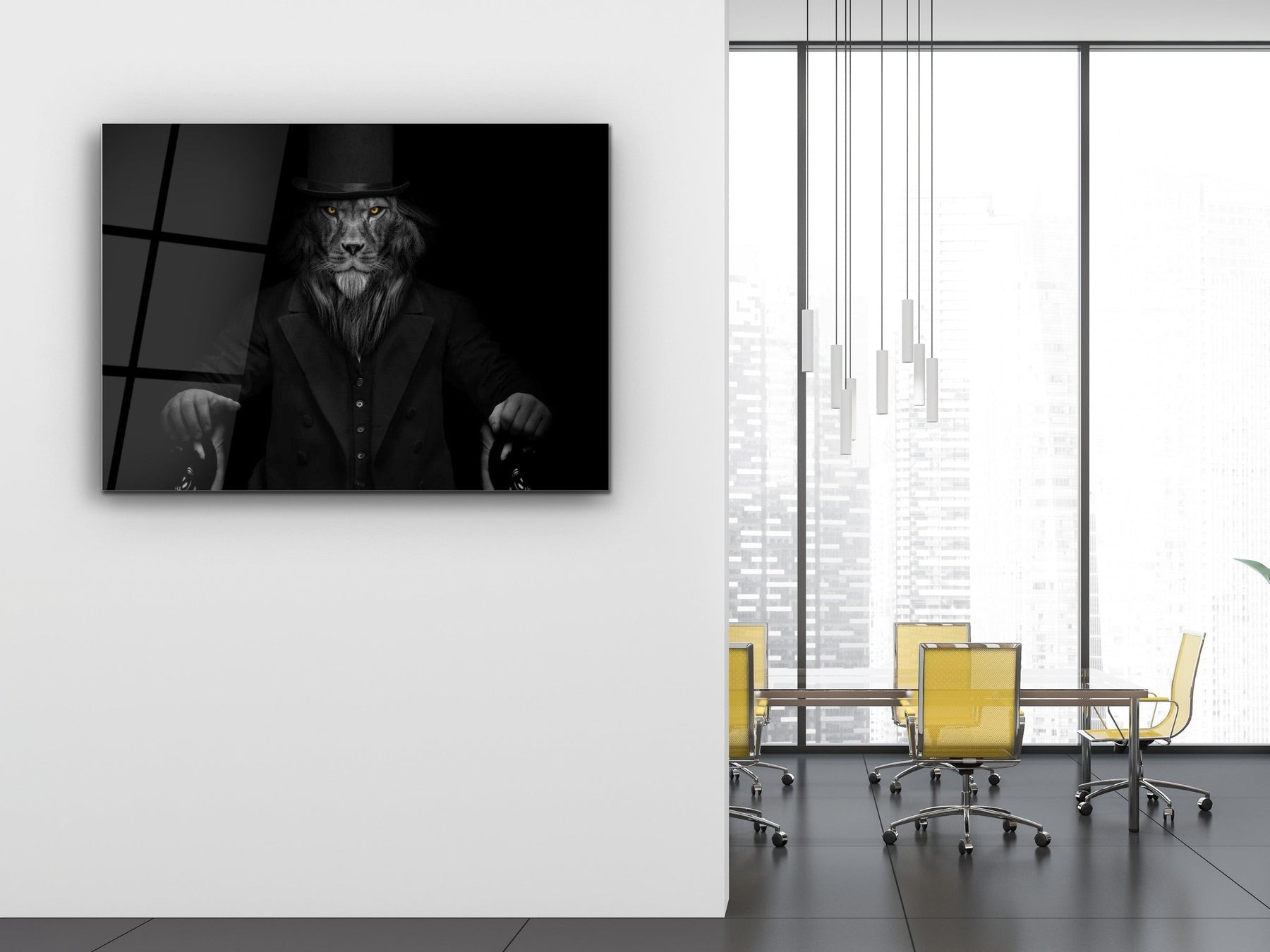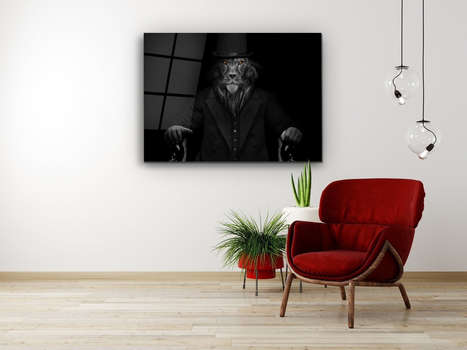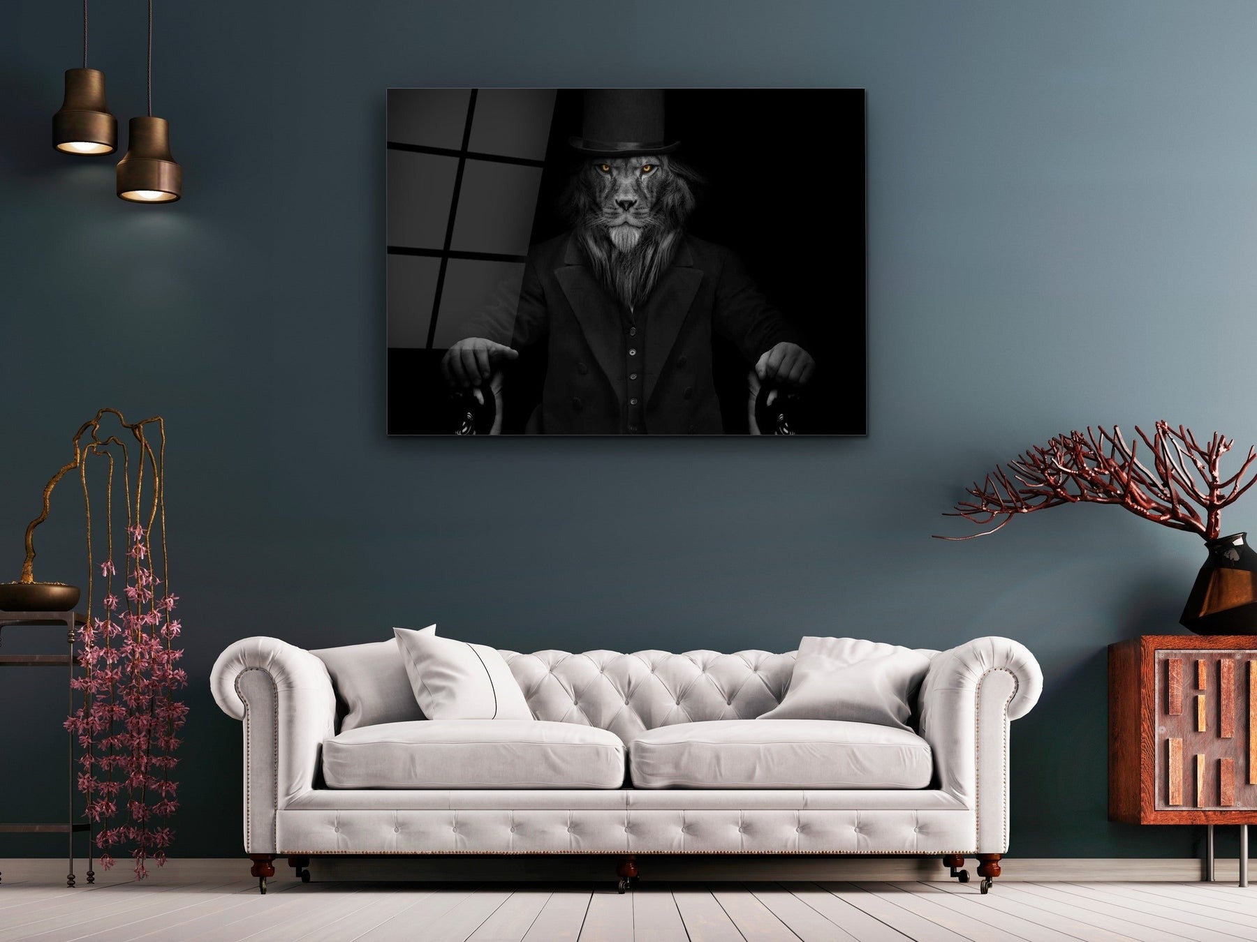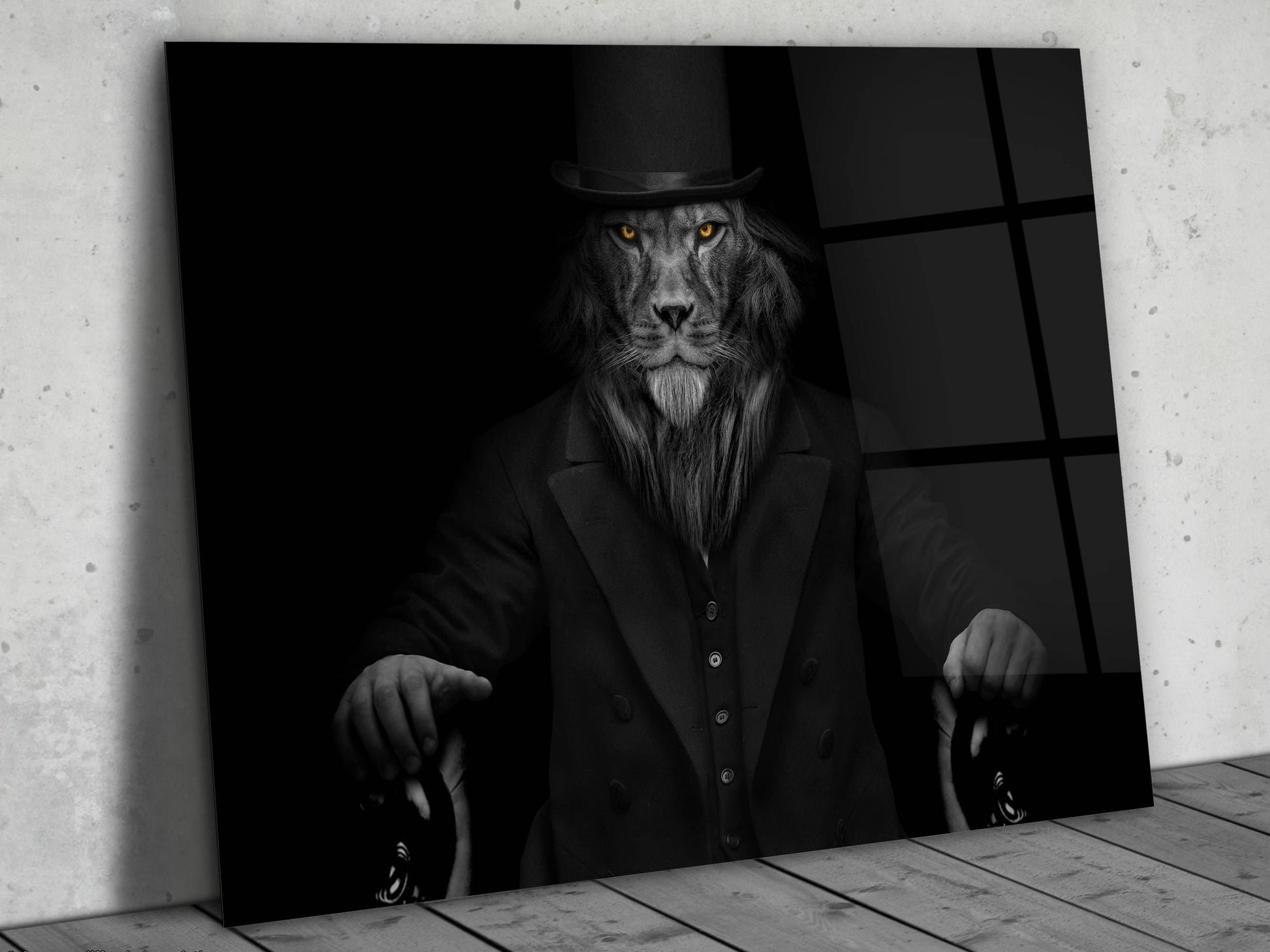 Lord Aslan Cam Tablo – Şapkalı ve Bastonlu Aslan Tablosu - Dekoratif Tablo